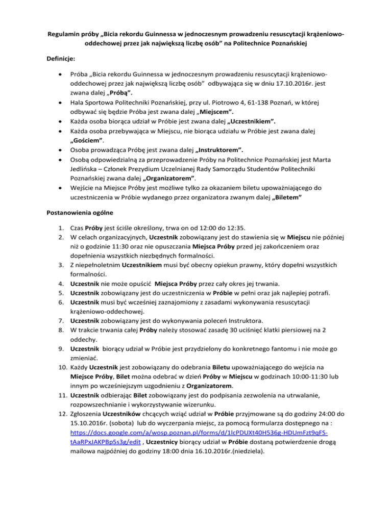 Regulamin próby „Bicia rekordu Guinnessa w jednoczesnym prowadzeniu resuscytacji krążeniowooddechowej przez jak największą liczbę osób” na Politechnice Poznańskiej Definicje: Próba „Bicia rekordu Guinnessa w jednoczesnym prowadzeniu resuscytacji krążeniowooddechowej przez jak największą liczbę osób” odbywająca się w dniu 17.10.2016r. jest zwana dalej „Próbą”. Hala Sportowa Politechniki Poznańskiej, przy ul. Piotrowo 4, 61-138 Poznań, w której odbywać się będzie Próba jest zwana dalej „Miejscem”. Każda osoba biorąca udział w Próbie jest zwana dalej „Uczestnikiem”. Każda osoba przebywająca w Miejscu, nie biorąca udziału w Próbie jest zwana dalej „Gościem”. Osoba prowadząca Próbę jest zwana dalej „Instruktorem”. Osobą odpowiedzialną za przeprowadzenie Próby na Politechnice Poznańskiej jest Marta Jedlińska – Członek Prezydium Uczelnianej Rady Samorządu Studentów Politechniki Poznańskiej zwana dalej „Organizatorem”. Wejście na Miejsce Próby jest możliwe tylko za okazaniem biletu upoważniającego do uczestniczenia w Próbie wydanego przez organizatora zwanym dalej „Biletem” Postanowienia ogólne 1. Czas Próby jest ściśle określony, trwa on od 12:00 do 12:35. 2. W celach organizacyjnych, Uczestnik zobowiązany jest do stawienia się w Miejscu nie później niż o godzinie 11:30 oraz nie opuszczania Miejsca Próby przed jej zakończeniem oraz dopełnienia wszystkich niezbędnych formalności. 3. Z niepełnoletnim Uczestnikiem musi być obecny opiekun prawny, który dopełni wszystkich formalności. 4. Uczestnik nie może opuścić Miejsca Próby przez cały okres jej trwania. 5. Uczestnik zobowiązany jest do uczestniczenia w Próbie w pełni oraz jak najlepiej potrafi. 6. Uczestnik musi być wcześniej zaznajomiony z zasadami wykonywania resuscytacji krążeniowo-oddechowej. 7. Uczestnik zobowiązany jest do wykonywania poleceń Instruktora. 8. W trakcie trwania całej Próby należy stosować zasadę 30 uciśnięć klatki piersiowej na 2 oddechy. 9. Uczestnik biorący udział w Próbie jest przydzielony do konkretnego fantomu i nie może go zmieniać. 10. Każdy Uczestnik jest zobowiązany do odebrania Biletu upoważniającego do wejścia na Miejsce Próby, Bilet można odebrać w dzień Próby w Miejscu w godzinach 10:00-11:30 lub innym po wcześniejszym uzgodnieniu z Organizatorem. 11. Uczestnik odbierając Bilet zobowiązany jest do podpisania zezwolenia na utrwalanie, rozpowszechnianie i wykorzystywanie wizerunku. 12. Zgłoszenia Uczestników chcących wziąć udział w Próbie przyjmowane są do godziny 24:00 do 15.10.2016r. (sobota) lub do wyczerpania miejsc, za pomocą formularza dostępnego na : https://docs.google.com/a/wosp.poznan.pl/forms/d/1lcPDUXt40H536g-HDUmFzt9qFStAaRPxJAKPBp5s3g/edit , Uczestnicy biorący udział w Próbie dostaną potwierdzenie drogą mailowa najpóźniej do godziny 18:00 dnia 16.10.2016r.(niedziela).