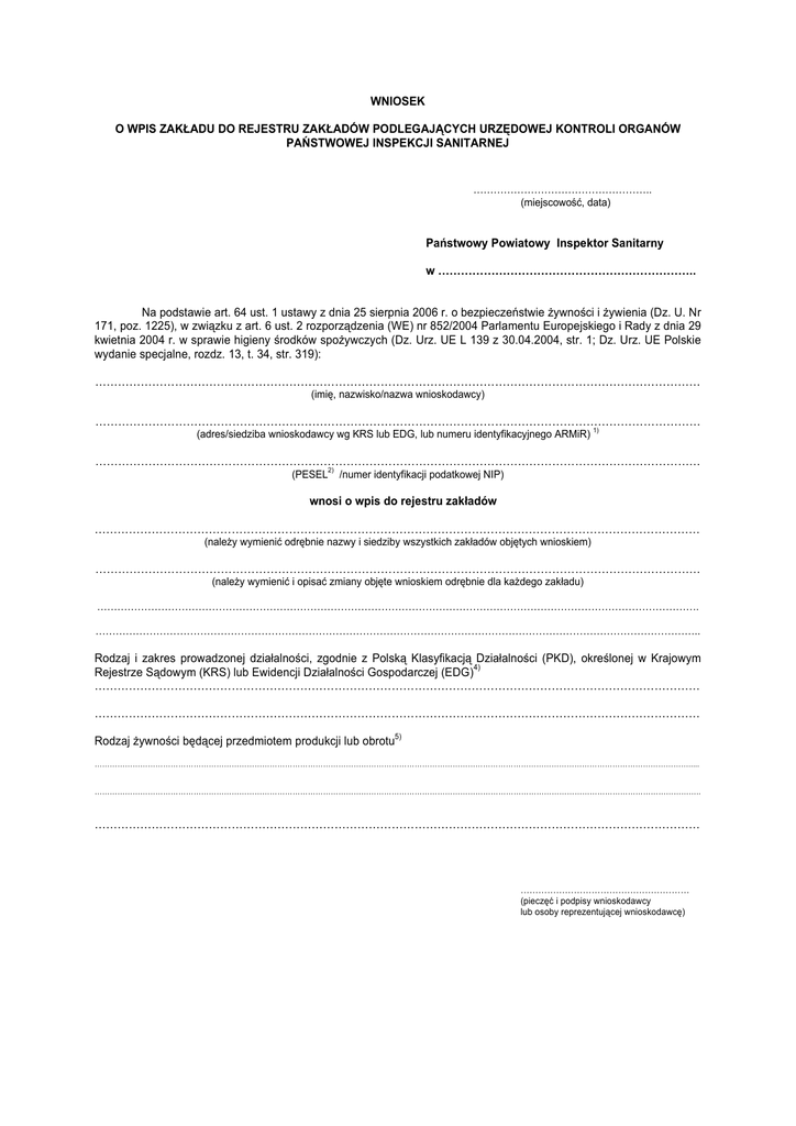 WNIOSEK O WPIS ZAKŁADU DO REJESTRU ZAKŁADÓW PODLEGAJĄCYCH URZĘDOWEJ KONTROLI ORGANÓW PAŃSTWOWEJ INSPEKCJI SANITARNEJ …………………………………………….. (miejscowość, data) Państwowy Powiatowy Inspektor Sanitarny w ………………………………………………………….. Na podstawie art. 64 ust. 1 ustawy z dnia 25 sierpnia 2006 r. o bezpieczeństwie Ŝywności i Ŝywienia (Dz. U. Nr 171, poz. 1225), w związku z art. 6 ust. 2 rozporządzenia (WE) nr 852/2004 Parlamentu Europejskiego i Rady z dnia 29 kwietnia 2004 r. w sprawie higieny środków spoŜywczych (Dz. Urz. UE L 139 z 30.04.2004, str. 1; Dz. Urz. UE Polskie wydanie specjalne, rozdz. 13, t. 34, str. 319): …………………………………………………………………………………………………………………………………………… (imię, nazwisko/nazwa wnioskodawcy) …………………………………………………………………………………………………………………………………………… (adres/siedziba wnioskodawcy wg KRS lub EDG, lub numeru identyfikacyjnego ARMiR) 1) …………………………………………………………………………………………………………………………………………… (PESEL2) /numer identyfikacji podatkowej NIP) wnosi o wpis do rejestru zakładów …………………………………………………………………………………………………………………………………………… (naleŜy wymienić odrębnie nazwy i siedziby wszystkich zakładów objętych wnioskiem) …………………………………………………………………………………………………………………………………………… (naleŜy wymienić i opisać zmiany objęte wnioskiem odrębnie dla kaŜdego zakładu) ……………………………………………………………………………………………………………………………………………………………. …………………………………………………………………………………………………………………………………………………………….. Rodzaj i zakres prowadzonej działalności, zgodnie z Polską Klasyfikacją Działalności (PKD), określonej w Krajowym 4) Rejestrze Sądowym (KRS) lub Ewidencji Działalności Gospodarczej (EDG) …………………………………………………………………………………………………………………………………………… …………………………………………………………………………………………………………………………………………… Rodzaj Ŝywności będącej przedmiotem produkcji lub obrotu 5) ………………………………………………………………………………………………………………………………………………………………………………………………………………..... ………………………………………………………………………………………………………………………………………………………………………………………………………………….. …………………………………………………………………………………………………………………………………………… ………………………………………………… (pieczęć i podpisy wnioskodawcy lub osoby reprezentującej wnioskodawcę) Załączniki do wniosku 6) 1. Aktualny odpis z Krajowego Rejestru Sądowego 2. Kopia zezwolenia na pobyt rezydenta długoterminowego WE 3. Zaświadczenie o wpisie do Ewidencji Działalności Gospodarczej 4. Zaświadczenie o wpisie do ewidencji gospodarstw działalności w zakresie dostaw bezpośrednich Wykaz Wykaz urządzeń urządzeń dystrybucyjnych dystrybucyjnych NIP, REGON 5. rolnych—dotyczy Objaśnienia: 1) Wypełniają producenci rolni objęci ewidencją gospodarstw rolnych na podstawie ustawy z dnia 18 grudnia 2003 r. o krajowym systemie ewidencji producentów, ewidencji gospodarstw rolnych oraz ewidencji wniosków o przyznanie płatności (Dz. U. z 2004 r. Nr 10, poz. 76, z późn. zm.), którzy posiadają numer identyfikacyjny nadany przez Agencję Restrukturyzacji i Modernizacji Rolnictwa. W imieniu pozostałych podmiotów działających na rynku spoŜywczym prowadzących działalność w zakresie produkcji lub obrotu Ŝywnością podlegających urzędowej kontroli Państwowej Inspekcji Sanitarnej występują z wnioskiem organy lub osoby reprezentujące podmiot zgodnie z odpisem z Krajowego Rejestru Sądowego (KRS) lub z zaświadczeniem z Ewidencji Działalności Gospodarczej (EDO). 2) Wypełnia się w przypadku osoby Fizycznej. W przypadku, gdy osobie nie nadano tego numeru, naleŜy wpisać serię i numer paszportu albo numer identyfikacyjny innego dokumentu, na podstawie, którego moŜliwe jest ustalenie danych osobowych. 3) NaleŜy wpisać zakłady podmiotu działającego na rynku spoŜywczym podlegające właściwości państwowego powiatowego inspektora sanitarnego, do którego jest składany wniosek. JeŜeli podmiot posiada zakłady produkujące lub wprowadzające do obrotu Ŝywność podlegające właściwości róŜnych państwowych powiatowych inspektorów sanitarnych, naleŜy złoŜyć odrębne wnioski do kaŜdego właściwego ze względu na siedzibę zakładu państwowego powiatowego inspektora sanitarnego. JeŜeli podmiot produkuje lub wprowadza do obrotu Ŝywność z obiektów lub urządzeń ruchomych lub tymczasowych, właściwość państwowego powiatowego inspektora sanitarnego jest określana według miejsca prowadzenia działalności przez zakład. 4) NaleŜy wymienić wszystkie rodzaje działalności w zakresie produkcji lub obrotu Ŝywnością zgodnie z Polską Klasyfikacją Działalności (PKO) określone w Krajowym Re