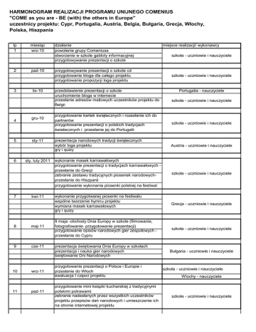 HARMONOGRAM REALIZACJI PROGRAMU UNIJNEGO COMENIUS "COME as you are - BE (with) the others in Europe" uczestnicy projektu: Cypr, Portugalia, Austria, Belgia, Bułgaria, Grecja, Włochy, Polska, Hiszpania lp 1 2 3 4 5 6 7 miesiąc wrz-10 paź-10 lis-10 gru-10 sty-11 sty, luty 2011 kwi-11 8 maj-11 9 cze-11 10 11 wrz-11 paź-11 działanie powołanie grupy Comeniusa stworzenie w szkole gabloty informacyjnej przygotowywanie prezentacji o szkole przygotowywanie prezentacji o szkole cd przygotowanie bloga dla całego projektu przygotowanie propozycji loga projektu przedstawienie prezentacji o szkole uruchomienie bloga w internecie przesłanie adresów mailowych uczestników projektu do Belgii miejsce realizacji/ wykonawcy szkoła - uczniowie i nauczyciele szkoła - uczniowie i nauczyciele Portugalia - nauczyciele szkoła - uczniowie i nauczyciele przygotowanie kartek świątecznych i rozesłanie ich do partnerów przygotowanie prezentacji o polskich tradycjach światecznych i przesłanie jej do Portugalii szkoła - uczniowie i nauczyciele prezentacja narodowych tradycji świątecznych wybór loga projektu gry i quizy Austria - uczniowie i nauczyciele wykonanie masek karnawałowych przygotowanie prezentacji o tradycjach karnawałowych przesłanie do Grecji zebranie zestawu tradycyjnych piosenek narodowychprzesłanie do Hiszpanii przygotowanie wykonania piosenki polskiej na festiwal szkoła - uczniowie i nauczyciele wykonanie przygotwanej piosenki na festiwalu wspólne tworzenie hymnu projektu wymiana masek karnawałowych gry i quizy Grecja - uczniowie i nauczyciele 9 maja -obchody Dnia Europy w szkole (filmowanie, fotografowanie- przygotowanie prezentacji) przygotowanie opisów narodowych gier zespołowych przesłanie do Cypru szkoła - uczniowie i nauczyciele prezentacja świętowania Dnia Europy w szkołach prezentacja i nauka gier narodowych świętowanie Dni Narodowych przygotowanie prezentacji o Polsce i Europie i przesłanie do Włoch ewaluacja I częsci projektu przygotowanie mini ksiązki kucharskiej z tradycyjnymi polskimi potrawami zebranie nadesłanych przez wszystkich uczestników projektu przepisów dań narodowych i umieszczenie ich na stronie internetowej projektu Bułgaria - uczniowie i nauczyciele szkoła - uczniowie i nauczyciele Wlochy - nauczyciele szkoła - uczniowie i nauczyciele 12 sty-12 SPOTKANIE W POLSCE prezentacja informacji historyczno -geograficznych o przedstawiciele wszystkich uczestników krajach i Europie projektu konkurs gotowania według przepisów narodowych gry i quizy przygotowanie prezentacji kalendarza ze świętami, tradycjami i zwyczajami narodowymi przygotowanie prezentacji polskich strojów narodowychszkoła - uczniowie i nauczyciele przesłanie do Austrii przygotowanie polskiego tańca narodowego 13 mar-12 festiwal folklorystyczny - prezentacja i nauka tańców prace nad kalendarzem projektu Belgia - uczniowie i nauczyciele 14 kwi-12 Tydzień Comeniusa w szkole - prezentacja dorobku projektu przygotowanie obchodów Dnia Europy w Hiszpanii szkoła - uczniowie i nauczyciele 15 maj-12 świętowanie Dnia Eurpy - prezentacje, wystawy prace końcowe nad kalendarzem projektu 16 cze-12 prezentacja całego dorobku projektu ewaluacja projektu przygotowanie sprawozdania - raportu koncowego Hiszpania - uczniowie i nauczyciele Cypr - nauczyciele