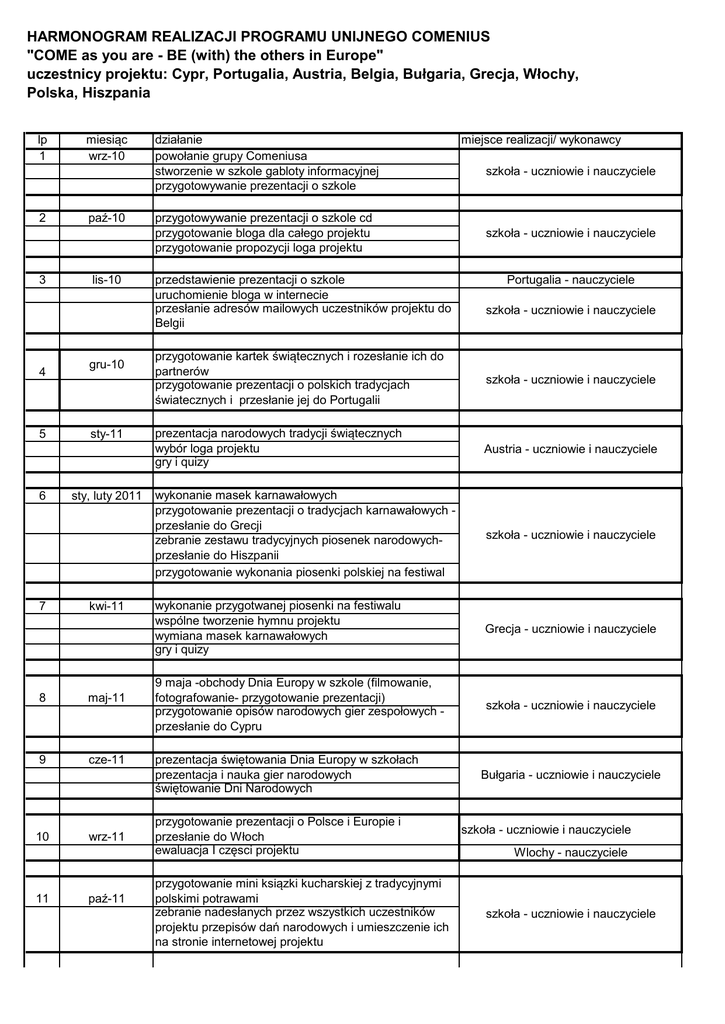 HARMONOGRAM REALIZACJI PROGRAMU UNIJNEGO COMENIUS