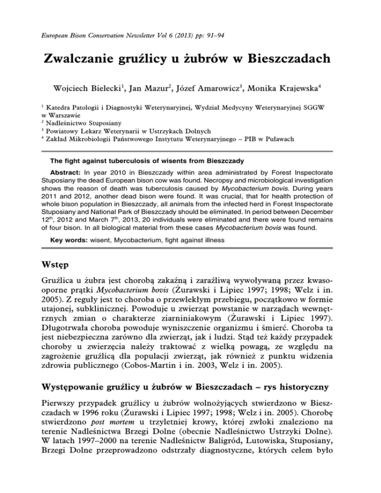 European Bison Conservation Newsletter Vol 6 (2013) pp: 91–94 Zwalczanie gruźlicy u żubrów w Bieszczadach Wojciech Bielecki1, Jan Mazur2, Józef Amarowicz3, Monika Krajewska4 1 Katedra Patologii i Diagnostyki Weterynaryjnej, Wydział Medycyny Weterynaryjnej SGGW w Warszawie 2 Nadleśnictwo Stuposiany 3 Powiatowy Lekarz Weterynarii w Ustrzykach Dolnych 4 Zakład Mikrobiologii Państwowego Instytutu Weterynaryjnego – PIB w Puławach The fight against tuberculosis of wisents from Bieszczady Abstract: In year 2010 in Bieszczady within area administrated by Forest Inspectorate Stuposiany the dead European bison cow was found. Necropsy and microbiological investigation shows the reason of death was tuberculosis caused by Mycobacterium bovis. During years 2011 and 2012, another dead bison were found. It was crucial, that for health protection of whole bison population in Bieszczady, all animals from the infected herd in Forest Inspectorate Stuposiany and National Park of Bieszczady should be eliminated. In period between December 12th, 2012 and March 7th, 2013, 20 individuals were eliminated and there were found remains of four bison. In all biological material from these cases Mycobacterium bovis was found. Key words: wisent, Mycobacterium, fight against illness Wstęp Gruźlica u żubra jest chorobą zakaźną i zaraźliwą wywoływaną przez kwasooporne prątki Mycobacterium bovis (Żurawski i Lipiec 1997; 1998; Welz i in. 2005). Z reguły jest to choroba o przewlekłym przebiegu, początkowo w formie utajonej, subklinicznej. Powoduje u zwierząt powstanie w narządach wewnętrznych zmian o charakterze ziarniniakowym (Żurawski i Lipiec 1997). Długotrwała choroba powoduje wyniszczenie organizmu i śmierć. Choroba ta jest niebezpieczna zarówno dla zwierząt, jak i ludzi. Stąd też każdy przypadek choroby u zwierzęcia należy traktować z wielką powagą, ze względu na zagrożenie gruźlicą dla populacji zwierząt, jak również z punktu widzenia zdrowia publicznego (Cobos-Martin i in. 2003, Welz i in. 2005). Występowanie gruźlicy u żubrów w Bieszczadach – rys historyczny Pierwszy przypadek gruźlicy u żubrów wolnożyjących stwierdzono w Bieszczadach w 1996 roku (Żurawski i Lipiec 1997; 1998; Welz i in. 2005). Chorobę stwierdzono post mortem u trzyletniej krowy, której zwłoki znaleziono na terenie Nadleśnictwa Brzegi Dolne (obecnie Nadleśnictwo Ustrzyki Dolne). W latach 1997–2000 na terenie Nadleśnictw Baligród, Lutowiska, Stuposiany, Brzegi Dolne przeprowadzono odstrzały diagnostyczne, których celem było 92 Zwalczanie gruźlicy u żubrów w Bieszczadach określenie rozprzestrzeniania się choroby w populacji żubrów karpackich. W wyniku tego postępowania stwierdzono, że choroba występowała w stadzie liczącym około 20 osobników, bytującym na terenie Nadleśnictwa Brzegi Dolne. Badania przeprowadzone w tym stadzie wskazywały na tendencję wzrostową liczby zachorowań na gruźlicę. Losy stada nie są znane, gdyż od 2000 roku nie stwierdzono obecności żubrów na terenie nadleśnictwa Brzegi Dolne. Stada żubrów bytujące na terenie nadleśnictw Brzegi Dolne, Lutowiska, Stuposiany oraz Bieszczadzkiego Parku Narodowego tworzą tzw. wschodnią część populacji bieszczadzkiej. Populacja rozpoczęła się od wypuszczenia w roku 1964 na terenie Nadleśnictwa Stuposiany 7 żubrów. W kolejnych latach stada się powiększały, a w 2004 roku część bytująca na terenie Nadleśnictwa Stuposiany i BdPN liczyła 35 osobników. Była to największa liczebność stada, które z powodu lokalizacji terenu bytowania umownie zaczęto określać mianem „Górny San”. W latach 2005–2009 liczba żubrów w tym stadzie oscylowała w granicach 29–33 osobników. Brak wzrostu populacji w okresie tłumaczono pogorszeniem stanu zdrowia zwierząt w stadzie i związanym z tym spadkiem rozrodczości. Zdiagnozowanie gruźlicy w stadzie „Górny San” W lutym 2010 roku na terenie Nadleśnictwa Stuposiany (leśnictwo Tarnawa), stwierdzono pierwszy przypadek śmierci z powodu uogólnionej wielonarządowej gruźlicy u siedmioletniej krowy żubra. Powiatowy Lekarz Weterynarii w Ustrzykach Dolnych wskazywał, że przypadek ten może świadczyć o zakażeniu prątkiem gruźlicy w całym stadzie, a nawet o enzootii gruźlicy. Istniało więc zagrożenie zakażenia prątkiem gruźlicy stada bytującego na terenie sąsiadującego Nadleśnictwa Lutowiska. To stanowiło podstawę wystąpienia do Generalnego Dyrektora Ochrony Środowiska z wnioskiem o zezwolenie na zabicie poprzez odstrzał w celach diagnostycznych kilku osobników żubra w obydwu stadach. W dniach 23–26 marca 2010 roku przeprowadzono eliminację trzech byków w wieku 4, 8 i 18 lat ze stada na terenie Nadleśnictwa Lutowiska. Sekcja eliminowanych osobników nie wykazała obecności zmian chorobowych. Badania laboratoryjne w kierunku gruźlicy przeprowadzone w Państwowym Instytucie Weterynaryjnym PIB w Puławach nie wykazały obecności prątków gruźlicy w materiale biologicznym pochodzącym od eliminowanych żubrów. W 2010 roku nie udało się wykonać odstrzałów diagnostycznych w Nadleśnictwie Stuposiany i również nie stwierdzono kolejnych padłych żubrów. Jednakże już w lutym 2011 roku znaleziono szczątki około 9-letniej samicy, a w początkach marca 2011 roku u 15 letniego byka eliminowanego ze względów humanitarnych stwierdzono uogólniona gruźlicę wielonarządową. Kolejne przypadki gruźlicy u żubrów w Nadleśnictwie Stuposiany stwierdzono w okresie od końca lutego do 26 kwietnia 2012 roku u padłych czterech samic i jednego samca oraz u dwóch eliminowanych samic. Przypadki te wskazywały niezbicie na enzootyczny charakter choroby, co sugerowało konieczność Wojciech Bielecki i in. 93 eliminacji całego stada żubrów bytujących w Nadleśnictwie Stuposiany. W wyniku postępowania administracyjnego Generalny Dyrektor Ochrony Środowiska dla ochrony zdrowia populacji żubrów 