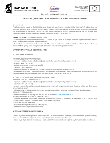 Człowiek – najlepsza inwestycja ! PROJEKT PN. „KREATYWNI – NOWE MOŻLIWOŚCI DLA OSÓB NIEPEŁNOSPRAWNYCH” O PROJEKCIE Projekt to wspólna inicjatywa Spółdzielni Socjalnej „Kreatywni" oraz Kiwanis International Klub „Nad Brdą". Przedsięwzięcie ma charakter społeczny i ukierunkowane jest na wsparcie młodych osób niepełnosprawnych oraz pomoc w ich zatrudnieniu, a także na wykwalifikowaniu Asystentów Osobistych Osób Niepełnosprawnych. Projekt współfinansowany jest ze środków Unii Europejskiej i EFS. Aktualnie trwa drugi nabór do projektu (01.01.2014 – 31.12.2014 r.). GRUPA DOCELOWA (II nabór do 14 lutego 2014): - 30 dorosłych osób niezatrudnionych w wieku 18 - 30 lat, w tym 6 osób ze znacznym stopniem niepełnosprawności oraz 12 osób z umiarkowanym stopniem niepełnosprawności, - 5 dorosłych osób niezatrudnionych w wieku 18 - 64 - osoby ze środowiska uczestników (należy wykazać stopień zależności, pokrewieństwa, opieki), które pełnią obowiązki opiekuńcze nad osobami niepełnosprawnymi, WYMAGANIA DOTYCZĄCE UCZESTNIKA /CZKI 1. OSOBY NIEPEŁNOSPRAWNE KRYTERIA UCZESTNICTWA W PROJEKCIE - kryterium pozostawania bez zatrudnienia (osoby bezrobotne lub osoby nieaktywne zawodowo) - kryterium wieku (18 - 30 lat) - posiadanie orzeczenia o niepełnosprawności DOKUMENTY REKRUTACYJNE - wypełnienie formularza aplikacyjnego ON (do pobrania na stroniewww.ON.kreatywni.com.pl ) - dostarczenie orzeczenia o niepełnosprawności (wystawionego przez właściwy organ: Powiatowy lub Wojewódzki zespół do spraw orzekania o niepełnosprawności lub orzeczenie Zakładu Ubezpieczeń Społecznych) 2. OSOBY Z OTOCZENIA OSÓB NIEPEŁNOSPRAWNYCH - AOON KRYTERIA UCZESTNICTWA W PROJEKCIE - kryterium pozostawania bez zatrudnienia (osoby bezrobotne lub osoby nieaktywne zawodowo) - kryterium wieku (18 - 65 lat) - związek z uczestnikiem/czką projektu (wykazanie więzi rodzinnych lub powinowactwa do 3 stopnia, opieka nad daną osobą, oświadczenie o opiece) - oświadczenie w formularzu aplikacyjnym chęci podniesienia kwalifikacji Asystenta Osobistego Osoby Niepełnosprawnej DOKUMENTY REKRUTACYJNE - wypełnienie formularza aplikacyjnego (do pobrania na stroniewww.ON.kreatywni.com.pl ) SPOSÓB ZŁOŻENIA DOKUMENTÓW REKRUTACYJNYCH Dokumenty aplikacyjne należy złożyć w siedzibie Spółdzielni (ul. Gdańska 42, Bydgoszcz) w terminie od 21 do 31 stycznia 2013 r. (decyduje data wpływu). Dokumenty można złożyć na kilka sposobów: - osobiście w siedzibie Spółdzielni, - za pośrednictwem poczty (decyduje data wpływu), - na adres mailowy: [email protected]. W RAMACH PROJEKTU GWARANTUJEMY - opiekę Asystenta Osobistego Osoby Niepełnosprawnej - w zakresie czynności osobistych, załatwiania spraw życia codziennego, pomoc w uczestnictwie w zajęciach, pomoc w przedsiębiorstwie na stanowisku stażowym, - opiekę psychologa i doradcy zawodowego - każdy uczestnik może skorzystać ze wsparcia psychologa i doradcy zawodowego Człowiek – najlepsza inwestycja ! ZAJĘCIA - wszystkie zajęcia są obligatoryjne, uczestnik musi uczestniczyć w minimum 80% zajęć, - uczestnik musi dotrzeć we własnym zakresie na miejsce zajęć, co może wiązać się z dodatkowym kosztem. Spółdzielnia nie ponosi ani nie refunduje kosztu dojazdu / transportu uczestnika na zajęcia (to jedyny koszt uczestnictwa w projekcie), - uczestnik musi być dyspozycyjny średnio 2 dni w tygodniu przez okres III - XI 2014 r. (z przerwą wakacyjną) - uczestnik odbędzie staż 3 miesięczny w pełnym wymiarze czasu pracy u wybranego pracodawcy, który zechce przyjąć stażystę na staż. Organizacją staży zajmuje się Spółdzielnia. MIEJSCE REALIZACJI ZAJĘĆ - zajęcia prowadzone będą w siedzibie Spółdzielni Socjalnej „Kreatywni" (ul. Gdańska 42, Bydgoszcz), - część zajęć (szkolenia: kuchnia małej gastronomii, ABC ogrodnictwa, Kurs AOON - będą zlecone firmom zewnętrznym; miejsce zostanie ustalone w toku realizacji projektu) ZAJĘCIA W RAMACH PROJEKTU 1. Zajęcia i szkolenia zmierzające do podniesienia umiejętności społecznych i wiedzy nt. rynku pracy - poprzez uczestnictwo w zajęciach grupowych, szkoleniach z zakresu kompetencji społecznych (3 dni szkoleniowe), arteterapii (3 dni szkoleniowe) oraz warsztatach nt. rynku pracy (8 dni szkoleniowych). Każdy uczestnik/czka może liczyć na wsparcie pracowników/czke spółdzielni oraz psychologów (każdy uczestnik ma możliwość skorzystania ze wsparcia psychologa przez cały okres udziału w projekcie). 2. Opracowanie Indywidualnych Planów Działania dla uczestników/czek projektu - spotkania z doradcą zawodowym (min. 3h) celem wspólnego określenia predyspozycji zawodowych uczestnika/czki projektu. 3. Kursy i szkolenia zawodowe do wyboru WYŁĄCZNIE z zakresu: - kursy branży gastronomicznej - kurs kelnerski „kelner zawodowy" - 120 godzin dydaktycznych - kurs cateringu - 24 godziny dydaktyczne - kuchnia małej gastronomii - 60 godzin dydaktycznych - kursy branży ogrodniczej - 40 godzin dydaktycznych - kursy AOON - Asystenta Osobistego Osoby Niepełnosprawnej - 144 godziny dydaktyczne 4. Płatne, trzymiesięczne staże dla wszystkich uczestników/czek projektu - wszyscy uczestnicy/czi odbędą staże w przedsiębiorstwach regionu. Staże płatne będą w wysokości 1500,00 zł miesięcznie (kwota zawiera całkowite koszty płacy; brutto = 1230,00 zł). 5. Spotkania branżowe z pracodawcami regionu. Na spotkaniach kadra projektu omówi założenia projektu oraz sylwetkę absolwenta - człowieka o odpowiednich kwalifikacjach zawodowych i motywacji do pracy, posiadającego doświadczenie zawodowe w swoim zawodzie nabyte w ramach staży. Dla uczestników/czek projektu będzie to okazja do zapoznania się z potencjalnymi 6. W ramach projektu gwarantujemy zatrudnienie minimum 10 uczestników/czek projektu. 7. Pięć osób z otoczenia osób niepełnosprawnych będzie miało okazję wziąć udział w kursach na profesjonalneg