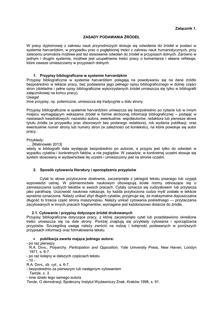 Załącznik 1. ZASADY PODAWANIA ŹRÓDEŁ W pracy dyplomowej z zakresu nauk przyrodniczych stosuje się odwołania do źródeł w postaci w systemie harvardzkim, w przypadku prac o pogłębionej treści z zakresu nauk humanistycznych, przy zaleceniu promotora możliwe jest też stosowanie odwołań do źródeł w przypisach dolnych. Zarówno w jednym i drugim systemie, możliwe jest uzupełnienie treści pracy o komentarze i własne refleksje, które zawsze umieszczamy w przypisach dolnych. 1. Przypisy bibliograficzne w systemie harvardzkim Przypisy bibliograficzne w systemie harvardzkim polegają na powoływaniu się na dane źródło bezpośrednio w tekście pracy, bez podawania jego pełnego opisu bibliograficznego w dolnej części stron (dokładne i pełne opisy bibliograficzne wykorzystanych źródeł umieszcza się tylko w bibliografii załącznikowej na końcu pracy). Uwaga! Inne przypisy, np. polemiczne, umieszcza się tradycyjnie u dołu strony. Przypisy bibliograficzne w systemie harvardzkim umieszcza się bezpośrednio po cytacie lub w innym miejscu wymagającym wskazania źródeł w formie skróconej informacji bibliograficznej – podając w nawiasach kwadratowych: nazwisko autora, ewentualnie: współautorów, redaktora lub pierwsze słowa tytułu źródła (w przypadku prac zbiorowych bez podanego redaktora), rok wydania publikacji, oraz ewentualnie numer strony lub numery stron (w zależności od kontekstu), na które powołuje się autor pracy. Przykłady: …. [Malinowski 2013] wtedy w bibliografii data występuje bezpośrednio po autorze, a przypis jest tylko do odwołań w wypadku cytatów i konkretnych faktów, a nie poglądów. W zasadzie, w konkretnej uczelni stosuje się system stosowany w wydawnictwie tej uczelni i umieszczony jest na stronie uczelni. 2. Sposób cytowania literatury i sporządzania przypisów Cytat to słowa przytoczone dosłownie, zaczerpnięte z jakiegoś tekstu pisanego lub czyjejś wypowiedzi ustnej. W piśmiennictwie naukowym obowiązują ścisłe normy odnoszące się o zamieszczania cudzych tekstów w swoich pracach. Cytaty oznacza się cudzysłowem lub przytacza jako parafrazę. Uczciwość naukowa nakazuje, by każda przytoczona cudza myśl została w tekście wyraźnie oznaczona. Należy unikać zbyt długich cytatów, przyjmuje się, że maksymalna dopuszczalna długość to trzecia część strony maszynopisu. Należy unikać cytowania pośredniego — przytaczania zacytowanych w innych pracach fragmentów; wymagane jest każdorazowo dotarcie do źródła. 2.1. Cytowanie i przypisy dotyczące źródeł drukowanych Przypisy bibliograficzne dotyczące pracy, z której zaczerpnięto cytat lub przedstawiono określone treści umieszcza się na dole strony. Poniżej znajdują się przykłady cytowania i sporządzania przypisów. Szczególną uwagę należy zwrócić na rodzaj i kolejność podawanych w poniższych przypisach informacji oraz formatowania tekstu. publikacja zwarta mająca jednego autora: - po raz pierwszy R.A. DAHL, Polyarchy. Participation and Opposition, Yale University Press, New Haven, Londyn 1971, s. 6-7. - po raz kolejny w dalszych częściach tekstu - 10 R.A. DAHL, dz. cyt., s. 6-7. - bezpośrednio za pierwszym lub następnym cytowaniem Tamże, s. 3. - inne dzieło tego samego autora Tenże, O demokracji, Społeczny Instytut Wydawniczy Znak, Kraków 1998, s. 91. publikacja zwarta mająca wielu autorów (nie redaktorów): - po raz pierwszy R. TAAGEPERA, M.S. SHUGART, Seats and Votes. The Effects and Determinants of Electoral Systems, The Effects and Determinants of Electoral Systems, Yale University Press, New Haven, Londyn 1989, s. 5—6. - po raz kolejny w dalszych częściach tekstu, gdy R. Taagepera jest przywołany w przypisie tylko w związku z jedną publikacją: R. TAAGEPERA, M.S. SHUGART, dz. cyt., s. 5—6. - po raz kolejny w dalszych częściach tekstu, gdy R. Taagepera jest przywołany w przypisie w związku z kilkoma publikacjami: R. TAAGEPERA, M.S. SHUGART, Seats and Votes..., s. 5—6. [to ile słów tytułu tu się znajdzie wynika z tego, po którym słowie będzie już wiadomo, że to cytat lub odwołanie do tej, a nie innej pozycji danego autora]. publikacja zwarta mająca redaktorów: - po raz pierwszy J. NOCOŃ, Opozycja jako przeciwstawny typ relacji politycznych, [w:] K. ŁABĘDŹ, M. MIKOŁAJCZYK (red.), Opozycja w systemach demokratycznych i niedemokratycznych, Akademia Pedagogiczna im. KEN w Krakowie, Kraków 2001, s. 3. - po raz kolejny J. NOCOŃ, Opozycja..., [w:] Opozycja w systemach..., cyt. wyd., s. 3. J. NOCOŃ, Opozycja..., [w:] dz. cyt., s. 3. artykuł z czasopisma: - po raz pierwszy D. LESZCZYŃSKI, Tolerancja i jej wrogowie, „Przegląd Polityczny”, 2003, nr 62/63, s. 24. - po raz kolejny w dalszych częściach tekstu D. LESZCZYŃSKI, Tolerancja..., cyt. wyd., s. 24. materiał konferencyjny: - po raz pierwszy - 11M. BIGGS, The Transnational Diffusion of Protest by Self—Immolation, materiały konferencyjne grupy badawczej „Civil Society, Citizenship, and Political Mobilization in Europe”, Social Science Research Center, Berlin 2006, s. 1-20. - po raz kolejny M. BIGGS, The Transnational..., dz. cyt., s. 1-20. materiał niepublikowany: - po raz pierwszy S. OSTRY, Globalization and the Nation State. Erosion from Above, artykuł niepublikowany, 1998, University of Saskatchewan, s. 6. - po raz kolejny S. OSTRY, Globalization..., dz. cyt., s. 6. dokument archiwalny: - po raz pierwszy Dokumenty życia Społecznego (dalej: DżS), Biblioteka Narodowa, sygn. 6754, Program Związku Ludowo-Narodowego, Warszawa, 27 października 1919, strony nienumerowane. - po raz kolejny DżS, BN, sygn. 6754, Program ..., strony nienumerowane. dokument prawny Ustawa z dnia 4 lutego 1994 r., o prawie autorskim i prawach pokrewnych, Dz.U. 1994 Nr 24 poz. 83, z późniejszymi zmianami. hasło w encyklopedii lub słowniku: Hasło: Opposition, [w:] The Blackwell Encyclopedia of Political Institutions, ED. V.