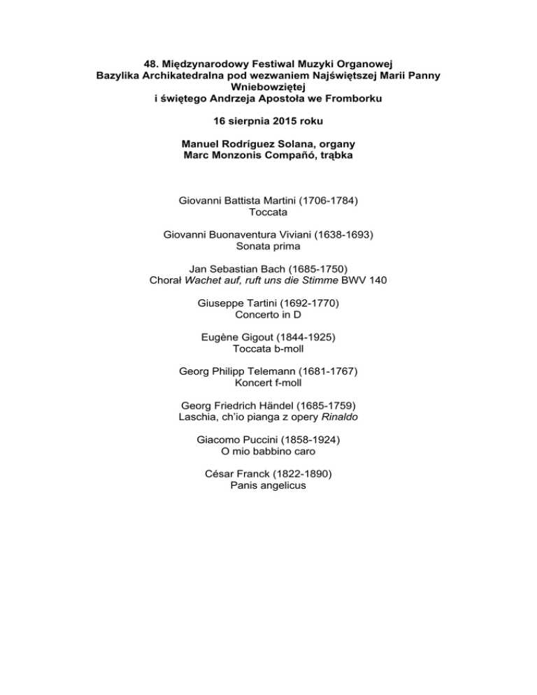 48. Międzynarodowy Festiwal Muzyki Organowej Bazylika Archikatedralna pod wezwaniem Najświętszej Marii Panny Wniebowziętej i świętego Andrzeja Apostoła we Fromborku 16 sierpnia 2015 roku Manuel Rodríguez Solana, organy Marc Monzonis Compañó, trąbka Giovanni Battista Martini (1706-1784) Toccata Giovanni Buonaventura Viviani (1638-1693) Sonata prima Jan Sebastian Bach (1685-1750) Chorał Wachet auf, ruft uns die Stimme BWV 140 Giuseppe Tartini (1692-1770) Concerto in D Eugène Gigout (1844-1925) Toccata b-moll Georg Philipp Telemann (1681-1767) Koncert f-moll Georg Friedrich Händel (1685-1759) Laschia, ch’io pianga z opery Rinaldo Giacomo Puccini (1858-1924) O mio babbino caro César Franck (1822-1890) Panis angelicus Manuel Rodríguez Solana, urodzony w Barcelonie w 1985 roku. Edukację muzyczną (śpiew i teoria muzyki) rozpoczął w wieku 4 lat. Pięć lat później, pod kierunkiem Marii Dolors Rosich, rozpoczął naukę gry na fortepianie oraz harmonii. W 2010 roku ukończył konserwatorium w Liceu (w klasie Benjamí Santacana i Alberta Atenelle), w 2012 roku w klasie organów profesora Josep Maria Mas Bonet. Ponadto posiada dyplom z kompozycji (studia pod kierunkiem José Nieto oraz Willem Dragstra). Koncertował w wielu zabytkowych świątyniach i obiektach rodzinnej Barcelony, m.in. w: La Sagrada Familia, Katedrze św. Eulalii, Pałacu Güell. Obecnie jest organistą kościoła San Vicente de Sarria, Matki Boskiej Królowej Pokoju La Bonanova w Barcelonie. Latem 2014 roku, na specjalne zaproszenie, wziął udział w koncercie towarzyszącym kursowi mistrzowskiemu Pierre Badela (trąbka) w Liétor (Albacete). W latach 2003-2004 asystował podczas kursów mistrzowskich Luca Olivera Sancheza i Stanislava Pochekina w Andorze. W latach 2008-2009 podczas w Tarragonie. kompozytorskich klas mistrzowskich Agustí Charlesa Marc Monzonis Compañó, urodzony w 1985 roku w Terrassa (Hiszpania). Edukację rozpoczął w swym rodzinnym mieście pod kierunkiem Alexa Baigeta. Edukację kontynuował w Conservatorio Superior de Música del Liceu (klasy Luis González i Josepa Antoni Casado). Kształcił się również u Jordi Alberta Gargallo. W 2012 roku ukończył paryskie UNIA, uzyskując tytuł magistra interpretacji w klasie Pierre Badela. Latem 2004 roku brał czynny udział w kursie mistrzowskim Pierre Badela w Liétor (Albacete). Ponadto brał udział w międzynarodowych kursach mistrzowskich prowadzonych m.in. przez: Allena Vizzutti, Fritsa Damrowa, Reinholda Friedricha, Maxa Sommerhaldera, Giuliano Sommerhaldera, Pacho Floresa, Kristiana Streenstrupa, Carlosa Benetó, Juanjo Sernę. Koncertował w różnych formacjach muzycznych, z towarzyszeniem orkiestr i w zespołach kameralnych, również specjalizujących się w muzyce współczesnej. W swoim dorobku posiada wiele nagrań z katalońską muzyką ludową. Koncertujew Hiszpanii, m.in. miejscach takich jak: Palau de la Música de Catalunya, l'Auditori, w Pałacu Güell. Ponadto występował w Polce i we Francji. Działalność koncertową łączy z działalnością pedagogiczną w Barcelonie i w Terrassa. Latem prowadzi kursy mistrzowskie.