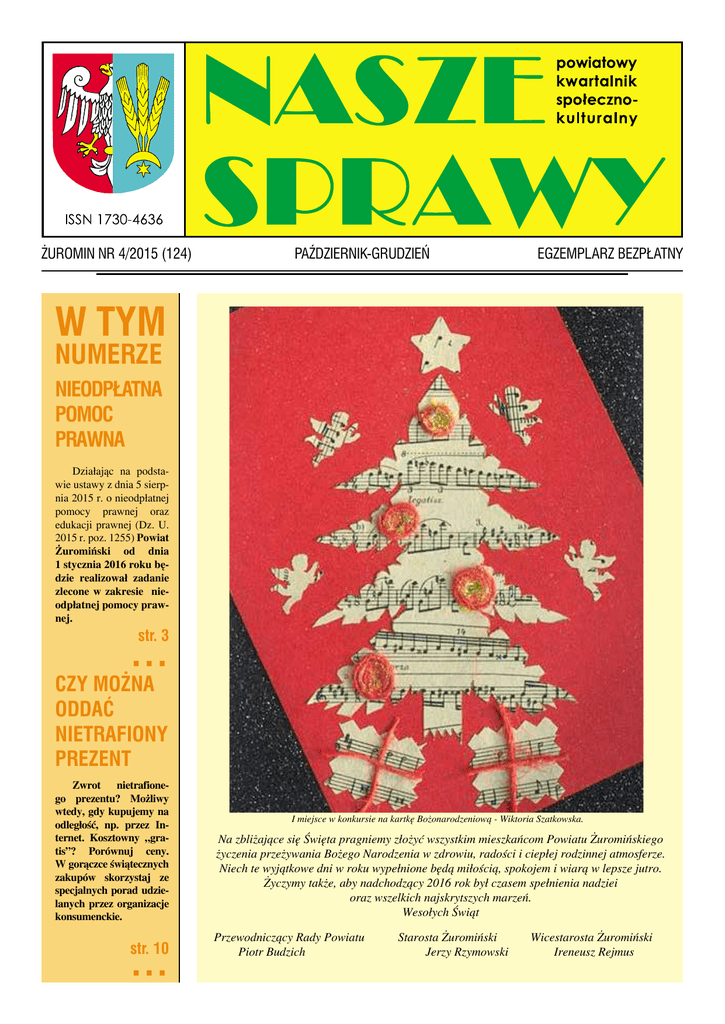 ŻUROMIN NR 4/2015 (124) PAŹDZIERNIK-GRUDZIEŃ EGZEMPLARZ BEZPŁATNY W TYM NUMERZE NIEODPŁATNA POMOC PRAWNA Działając na podstawie ustawy z dnia 5 sierpnia 2015 r. o nieodpłatnej pomocy prawnej oraz edukacji prawnej (Dz. U. 2015 r. poz. 1255) Powiat Żuromiński od dnia 1 stycznia 2016 roku będzie realizował zadanie zlecone w zakresie nieodpłatnej pomocy prawnej. str. 3 … CZY MOŻNA ODDAĆ NIETRAFIONY PREZENT Zwrot nietrafionego prezentu? Możliwy wtedy, gdy kupujemy na odległość, np. przez Internet. Kosztowny „gratis”? Porównuj ceny. W gorączce świątecznych zakupów skorzystaj ze specjalnych porad udzielanych przez organizacje konsumenckie. … str. 10 I miejsce w konkursie na kartkę Bożonarodzeniową - Wiktoria Szatkowska. Na zbliżające się Święta pragniemy złożyć wszystkim mieszkańcom Powiatu Żuromińskiego życzenia przeżywania Bożego Narodzenia w zdrowiu, radości i ciepłej rodzinnej atmosferze. Niech te wyjątkowe dni w roku wypełnione będą miłością, spokojem i wiarą w lepsze jutro. Życzymy także, aby nadchodzący 2016 rok był czasem spełnienia nadziei oraz wszelkich najskrytszych marzeń. Wesołych Świąt Przewodniczący Rady Powiatu Piotr Budzich Starosta Żuromiński Jerzy Rzymowski Wicestarosta Żuromiński Ireneusz Rejmus AKTUALNOŚCI OGŁOSZENIE Powiat Żuromiński / Powiatowy Urząd Pracy w Żurominie w okresie od 01.01.2015 r. do 31.12.2015 r. realizuje projekt pod nazwą: „Aktywizacja osób młodych pozostających bez pracy w powiecie żuromińskim (I)”, współfinansowany przez Unię Europejską ze środków Europejskiego Funduszu Społecznego, w ramach Programu Operacyjnego Wiedza Edukacja Rozwój, Osi priorytetowej I Osoby młode na rynku pracy, Działanie 1.1 Wsparcie osób młodych pozostających bez pracy na regionalnym rynku pracy, Poddziałania 1.1.1 Wsparcie udzielane z Europejskiego Funduszu Społecznego. Głównym celem projektu jest zwiększenie możliwości zatrudnienia osób młodych do 30 roku życia bez pracy, w tym w szczególności osób, które nie uczestniczą w kształceniu i szkoleniu (tzw. młodzież NEET). Grupa docelowa: Osoby młode w wieku 18-29 lat pozostające bez pracy, zarejestrowane w Powiatowym Urzędzie Pracy w Żurominie jako bezrobotne z ustalonym I lub II profilem pomocy (tzw. młodzież NEET) - ogółem 285 osób, które spełniają łącznie poniżej określone warunki: - nie kształcą się, tj. nie uczestniczą w kształceniu formalnym w trybie stacjonarnym, - nie szkolą się, tj. nie uczestniczą w pozaszkolnych zajęciach mających na celu uzyskanie, uzupełnienie lub doskonalenie umiejętności i kwalifikacji zawodowych lub ogólnych potrzebnych do wykonywania pracy, nie brały udziału w tego typu formie aktywizacji, finansowanej ze środków publicznych, w okresie ostatnich 4 tygodni. Zgodnie z kryterium dostępu w ramach projektu zostanie objętych wsparciem: - co najmniej 120 osób długotrwale bezrobotnych, - co najmniej 3 osoby niepełnosprawne. Formy wsparcia realizowane w ramach projektu: - poradnictwo zawodowe lub pośrednictwo pracy, - staże, - jednorazowo środki na podjęcie działalności gospodarczej, - bon na zasiedlenie. Łączna wartość wydatków kwalifikowalnych projektu wynosi 2 228 700 zł., w tym wkład wspólnotowy (EFS) – 1 878400 zł., wkład krajowy – 350 300 zł. Pracodawcy i osoby bezrobotne zainteresowane przystąpieniem do projektu proszone są o kontakt osobisty z Powiatowym Urzędem Pracy w Żurominie ul. Lidzbarska 27a, pok. 11, w godz. 730- 1530 lub telefoniczny (23) 657- 31 -63, (23)6573-41-06. POWIATOWY KWARTALNIK SPOŁECZNO-KULTURALNY NASZE SPRAWY ADRES REDAKCJI: Starostwo Powiatowe w Żurominie, Plac Józefa Piłsudskiego 4, 09-300 Żuromin TEL. 23 657 47 00 wew. 27, e-mail: [email protected] KOLEGIUM REDAKCYJNE: Bożena Jackowska, Sylwia Lewandowska, Piotr Węgrzyn, Jerzy Piotrowski, Piotr Wlizło DRUK: Digital Art Studio Przemysław Gała, www.digitalartstudio.pl Redakcja nie zamieszcza płatnych reklam i ogłoszeń. Redakcja zastrzega sobie prawo do zmian i skrótów w nadesłanych tekstach. 2 SPIS TREŚCI AKTUALNOŚCI NIEODPŁATNA POMOC PRAWNA. . . . . . . . . . . . . . . . . . . . . . . . . . . . . . . . . . . . . . . . . . . . 3 OBCHODY NARODOWEGO ŚWIĘTA NIEPODLEGŁOŚCI W ŻUROMINIE. . . . . . . . . . . . . . . . 3 INWESTYCJE DROGOWE W POWIECIE ŻUROMIŃSKIM. . . . . . . . . . . . . . . . . . . . . . . . . . . 4 NARODOWA LOTERIA PARAGONOWA . . . . . . . . . . . . . . . . . . . . . . . . . . . . . . . . . . . . . . . 5 NOWA SIEDZIBA KRUS W ŻUROMINIE . . . . . . . . . . . . . . . . . . . . . . . . . . . . . . . . . . . . . . . 6 SPOTKANIE KOMISJI BEZPIECZEŃSTWA I PORZĄDKU PUBLICZNEGO STAROSTY ŻUROMIŃSKIEGO. . . . . . . . . . . . . . . . . . . . . . . . . . . . . . . . . . . . . . . . . . . . . . . . . . . . . . . . 6 TRWAJĄ PRACE ZWIĄZANE Z OPRACOWANIEM MIEJSCOWYCH PLANÓW ZAGOSPODAROWANIA CZĘŚCI TERENU GMINY ŻUROMIN ORAZ ZMIANY MIEJSCOWEGO PLANU ZAGOSPODAROWANIA PRZESTRZENNEGO MIASTA ŻUROMIN. . 7 CZY MOŻNA ODDAĆ NIETRAFIONY PREZENT?. . . . . . . . . . . . . . . . . . . . . . . . . . . . . . . . . . 7 KRAJOWY FUNDUSZ SZKOLENIOWY . . . . . . . . . . . . . . . . . . . . . . . . . . . . . . . . . . . . . . . . . 8 ZDROWIE OLIMPIADA PROMOCJI ZDROWEGO STYLU ŻYCIA PCK. . . . . . . . . . . . . . . . . . . . . . . . . . 8 AKCJA „KOPERTA ŻYCIA” ZAKOŃCZONA . . . . . . . . . . . . . . . . . . . . . . . . . . . . . . . . . . . . . . 9 NOWE MIEJSCA DLA PRZEWLEKLE CHORYCH W ZAKŁADZIE OPIEKUŃCZO-LECZNICZYM . . 9 UTRZYMANIE CERTYFIKATU JAKOŚCI ISO 9001 . . . . . . . . . . . . . . . . . . . . . . . . . . . . . . . 10 OSTATNI W BR. POBÓR KRWI ZAKOŃCZONY. . . . . . . . . . . . . . . . . . . . . . . . . . . . . . . . . . 10 ŚWIATOWY DZIEŃ WALKI Z AIDS. . . . . . . . . . . . . . . . . . . . . . . . . . . . . . . . . . . . . . . . . . . 10 OŚWIATA STYPENDIA PREZESA RADY MINISTRÓW . . . . . . . . . . . . . . . . . . . . .