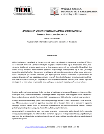 ZAGROŻENIA CYBERNETYCZNE ZWIĄZANE Z UŻYTKOWANIEM PORTALI SPOŁECZNOŚCIOWYCH Daniel Dereniowski Wyższa Szkoła Informatyki i Zarządzania z siedzibą w Rzeszowie Streszczenie Dzisiejszy Internet rozwija się w kierunku portali społecznościowych. Ich ogromna popularność (liczona w setkach milionach użytkowników) jest przyczyną interesowania się tą przestrzenią przez przestępców. Większość ataków wymierzona w internautów opiera się na naiwności (likejacking), lub braku wiedzy na temat elementarnych podstaw bezpiecznego zachowywania się w sieci (phishing) i ma różne skutki dla ofiar. Od najmniej uciążliwych, jak lekka kompromitacja wśród grona internetowych znajomych, po bardzo poważne, jak wykorzystanie danych osobowych użytkowników do oszustw finansowych czy kradzieży poufnych, cennych danych. Najlepszym sposobem przeciwdziałania atakom cyberoszustów jest profilaktyka oraz rozpowszechnianie informacji na temat zagrożeń istniejących w sieci wśród innych osób, oraz roztropne korzystanie z dostępnych nam serwisów . Portale społecznościowe wpisały się już na stałe w krajobraz światowego i krajowego Internetu. Niewiele jest osób, które nie korzystają z żadnego serwisu tego typu. Pod względem liczby użytkowników, na świecie prym wiedzie Facebook, który posiada ponad 500 milionów zarejestrowanych kont. Istnieją również inne serwisy społecznościowe posiadające wielu stałych i aktywnych użytkowników, np.: MySpace, czy nowy serwis giganta z Mountain View Google+, który już w pierwszym tygodniu swojego istnienia zdobył około 10 milionów użytkowników. W polskim Internecie również istnieje pokaźny rynek tego typu usług, np. Nasza-Klasa, Fotka, czy GoldenLine. Ogromna ilość użytkowników tego typu usług gromadzi i udostępnia wiele danych, które skupiają uwagę cyberprzestępców. W referacie tym postaram się opisać rodzaje i specyfikację współczesnych zagrożeń dla użytkowników portali społecznościowych oraz możliwe sposoby ochrony przed atakami cyberprzestępców. www.think.wsiz.rzeszow.pl, ISSN 2082-1107, Nr 2 (10) 2012, s. 27-31 Zagrożenia cybernetyczne związane z użytkowaniem portali społecznościowych Zagrożenia płynące z sieci Kradzież tożsamości Jednym z poważniejszych zagrożeń czyhających na użytkowników sieci społecznościowych jest kradzież tożsamości1. Liczba znajomych na Facebooku dla przeciętnego użytkownika wacha się w granicach 200 (choć niektórzy użytkownicy posiadają ich nawet 3-4 tysiące). Należy oczywiście zwrócić uwagę na różnicę pomiędzy liczbą osób, z którymi utrzymujemy kontakty realnie i regularnie, a tymi dopisanymi do naszej listy znajomych. Nie wszystkie z tych osób mieliśmy okazję spotkać osobiście, a niektóre znamy tylko z kontaktów internetowych. Kradzież tożsamości polega na wykreowaniu, przy użyciu prawdziwych danych, profilu konkretnej osoby i tworzeniu listy jej prawdziwych znajomych. W następstwie tych działań, cyberprzestępca podszywając się pod swoją ofiarę możę utrzymywać kontakty z różnymi osobami i wysyłać odnośniki do niebezpiecznych witryn lub do plików infekujących komputer ofiary. Drugim wariantem tej metody może być sytuacja, kiedy korzystając z naszego profilu zostaniemy zaproszeni do grona znajomych np. przez znane osoby, zespoły czy instytucje. Należy być sceptycznym wobec takich zaproszeń, chyba że naprawdę wierzymy, iż np. Eminem spędza całe dnie przed komputerem wysyłając zaproszenia do losowych osób. Choć takie scenariusze ataków mogą wydawać się śmieszne lub nierealne to jednak ich częstotliwość i skuteczność skłania ku innym wnioskom. Jednym z ważnych czynników skuteczności takich ataków jest najczęściej brak możliwości weryfikacji tożsamości użytkowników (w kwestii firm sytuacja wygląda już trochę lepiej). Jest to kompromis, na który zdecydował się serwis, by ułatwić rozwój i tworzenie nowych kont, niestety kosztem bezpieczeństwa. „Likejacking” „Likejacking”2 jest to słowo stworzone specjalnie do opisu szeregu ataków na użytkowników serwisu Facebook. Nazwa pochodzi od bardzo popularnej na tym portalu opcji „Like” („lubię to”). Funkcja ta pozwala nam pokazywać jakie statusy, filmy, muzyka, wydarzenia czy inne aktywności naszych znajomych podobają nam się. Dzięki temu jedna idea może bardzo szybko rozprzestrzeniać się wśród użytkowników. Sposób ten szybko zaadaptowali do swoich celów cyberprzestępcy. Oszuści tworzą wydarzenie, status lub np. stronę, która rzekomo zawiera bardzo interesujące informacje (najczęściej informacje te mają dotyczyć sławnych osób, ważnych wydarzeń sportowych czy erotyki). Aby móc je obejrzeć, czy przeczytać, należy kliknąć na wskazany odnośnik. Po kliknięciu użytkownik najprawdopodobniej nie otrzyma żadnych informacji, których się spodziewał lub zostanie przekierowany na kolejną stronę, gdzie według obranej przez przestępcę strategii zostanie wyświetlony błąd o niemożliwości otrzymania oczekiwanych informacji, konieczności zalogowania się w danym serwisie lub ponownego zalogowania do serwisu Facebook, albo np. zostanie wyświetlony 1 http://www.oszustwsieci.pl/kradziez_tozsamosci.php http://www.webexperts.pl/blog/prawo/przestepstwa-internetowe/bazpieczenstwo-na-facebookulikejacking/ 2 28 Zagrożenia cybernetyczne związane z użytkowaniem portali społecznościowych komunikat o zaakceptowaniu pobrania potrzebnego pliku. Jednak samą istotą ataku jest moment pierwszego kliknięcia przez użytkownika. Konsekwencjami tej sytuacji najczęściej są: − − − − zmiany w ustawieniach kont użytkowników dotyczące prywatności, umieszczenie w profilu użytkownika informacji, iż lubi daną stronę (w tym przypadku stronę atakującego), co służy nakłonieniu również innych osób do odwiedzenia danej strony, instalacja programów, któr
