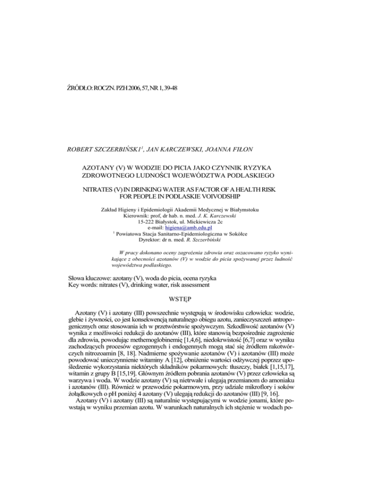ŹRÓDŁO: ROCZN. PZH 2006, 57, NR 1, 39-48 ROBERT SZCZERBIŃSK11, JAN KARCZEWSKI, JOANNA FIŁON AZOTANY (V) W WODZIE DO PICIA JAKO CZYNNIK RYZYKA ZDROWOTNEGO LUDNOŚCI WOJEWÓDZTWA PODLASKIEGO NITRATES (V) IN DRINKING WATER AS FACTOR OF A HEALTH RISK FOR PEOPLE IN PODLASKIE VOIVODSHIP Zakład Higieny i Epidemiologii Akademii Medycznej w Białymstoku Kierownik: prof, dr hab. n. med. J. K. Karczewski 15-222 Białystok, ul. Mickiewicza 2c e-mail: [email protected] 1 Powiatowa Stacja Sanitarno-Epidemiologiczna w Sokółce Dyrektor: dr n. med. R. Szczerbiński W pracy dokonano oceny zagrożenia zdrowia oraz oszacowano ryzyko wynikające z obecności azotanów (V) w wodzie do picia spożywanej przez ludność województwa podlaskiego. Słowa kluczowe: azotany (V), woda do picia, ocena ryzyka Key words: nitrates (V), drinking water, risk assessment WSTĘP Azotany (V) i azotany (III) powszechnie występują w środowisku człowieka: wodzie, glebie i żywności, co jest konsekwencją naturalnego obiegu azotu, zanieczyszczeń antropogenicznych oraz stosowania ich w przetwórstwie spożywczym. Szkodliwość azotanów (V) wynika z możliwości redukcji do azotanów (III), które stanowią bezpośrednie zagrożenie dla zdrowia, powodując methemoglobinemię [1,4,6], niedokrwistość [6,7] oraz w wyniku zachodzących procesów egzogennych i endogennych mogą stać się źródłem rakotwórczych nitrozoamin [8, 18]. Nadmierne spożywanie azotanów (V) i azotanów (III) może powodować unieczynnienie witaminy A [12], obniżenie wartości odżywczej poprzez upośledzenie wykorzystania niektórych składników pokarmowych: tłuszczy, białek [1,15,17], witamin z grupy B [15,19]. Głównym źródłem pobrania azotanów (V) przez człowieka są warzywa i woda. W wodzie azotany (V) są nietrwałe i ulegają przemianom do amoniaku i azotanów (III). Również w przewodzie pokarmowym, przy udziale mikroflory i soków żołądkowych o pH poniżej 4 azotany (V) ulegają redukcji do azotanów (III) [9, 16]. Azotany (V) i azotany (III) są naturalnie występującymi w wodzie jonami, które powstają w wyniku przemian azotu. W warunkach naturalnych ich stężenie w wodach po- wierzchniowych wynosi zwykle kilka miligramów na dm3. W wodach podziemnych zaobserwowano wzrost poziomu azotanów (V), co wynika z intensyfikacji rolnictwa, ich stężenie może sięgać do kilkuset miligramów na dm3 [20]. Azotany (V) w wodach stanowią ostatni etap degradacji biochemicznej związków organicznych. Celem pracy była ocena zagrożenia zdrowotnego oraz oszacowanie ryzyka wynikającego z obecności azotanów (V) w wodzie do picia spożywanej przez ludność województwa podlaskiego. MATERIAŁ I METODY Materiał do badań Materiał do badań stanowiły próbki wody pobrane w 14 powiatach województwa podlaskiego w ramach prowadzonego monitoringu jakości wody przeznaczonej do spożycia przez ludzi w latach 2001-2003. Pobór próbek wody odbywał się na przestrzeni całego roku w poszczególnych latach i obejmował 335 wodociągów zaopatrujących ludność w wodę do picia. Punkty poboru próbek wody zlokalizowane były w: -ujęciach wód, -miejscu podawania do sieci, -sieci rozdzielczej, -miejscu czerpania wody. Próbki wody w latach 2001-2002 były pobierane z częstotliwością określoną w wytycznych dla stacji sanitarno-epidemiologicznych opracowanych przez Państwowy Zakład Higieny w Warszawie [11], natomiast w 2003 r. z częstotliwością określoną w Rozporządzeniu Ministra Zdrowia [14]. Dane dotyczące ilości obsługiwanej ludności oraz miejscowości obsługiwanych przez dany wodociąg uzyskano od administratorów wodociągów. Dla każdego wodociągu obliczono średnie stężenie azotanów w wodzie przeznaczonej do spożycia przez ludzi w oparciu o wyniki uzyskane z punktów poboru wody w latach 2001-2003. Stężenie azotanów (V) w próbkach wody oznaczano w laboratoriach powiatowych i wojewódzkim Stacji Sanitarno-Epidemiologicznych zgodnie z PN-82/C-04576/08 [13]. Szacowanie ryzyka zdrowotnego Do oceny ryzyka zdrowotnego wykorzystano: zalecenia Komisji Kodeksu Żywnościowego FAO/ WHO [3], metodykę przyjętą przez Ludwickiego i in. [10]: - technikę szacowania ryzyka zdrowotnego jakie niesie ze sobą spożycie wody, stosowaną we Włoszech, przedstawioną przez E. Cadum (Regionalna Agencja Ochrony Środowiska, - Region Piemont) w ramach Projektu Phare 2002-P1./2002/IB/EN/2002 [2]. Ocenę zagrożenia azotanami pobieranymi z wodą do picia przez populację generalną województwa podlaskiego dokonano porównując Akceptowane Dzienne Pobranie ADI (Acceptable Daily Intake) z wartością Oszacowanego Dziennego Pobrania EDI (Estimated Daily Intake) i Teoretycznie Najwyższego Dziennego Pobrania TMDI (Theoretical Maximum Daily Intake). ADI - ilość substancji chemicznej jaką dorosły człowiek może przyjmować codziennie w ciągu całego życia, prawdopodobnie bez uszczerbku dla zdrowia, zgodnie z aktualnym stanem wiedzy. Wartość ADI dla azotanów ustalona została w 1974 roku przez Komitet Ekspertów FAO/WHO [5] i wynosi 5 mg NaNO3/kg m.c./dzień (w przeliczeniu na jon NO3, 3,65 mg/kg m.c/dzień). Biorąc pod uwagę, że azotany w wodzie do picia, obok żywności, stanowią szlak narażenia na drodze pokarmowej przyjęto za Cadum [2] wartość ADI pobieranych azotanów z wodą do picia jako 10% całkowitej wartości ADI pobieranej drogą pokarmową (0,365 mg NO-3/kg m.c/dzień). Oszacowane Dzienne Pobranie (EDI) określono na podstawie średnich poziomów azotanów w wodzie przeznaczonej do spożycia przez ludzi w latach 2001-2003 w województwie podlaskim i przeciętnego spożycia wody przez populację generalną - 2 dm3 /osobę/dzień. EDI obliczono ze wzoru: EDI = F x R gdzie: F - dzienne spożycie wody; R - średni poziom zawartości azotanów w wodzie przeznaczonej do spożycia przez ludzi stwierdzany w monitoringu wody w latach 2001-2003. TMDI - najwyższe teoretycznie możliwe dzienne pobranie danej