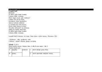 Tekst do zadań 1-5 Leopold Staff Kwiecień Po niebie pędzi chmur konnica I mruczą dzikie zwierzęta. Drzew nagie szczyty gnie wichrzyca1 I zmiata kurz jak na święta. Kwietniowa burza niecierpliwa Spieszy krokami wielkiemi I w pochód cały świat porywa, Deszcz bębni marsza na ziemi. Wszystko doboszem2 się zachwyca, Śmieją się zmokłe dziewczęta Po niebie pędzi chmur konnica I mruczą dzikie zwierzęta. Leopold Staff, Kwiecień, [w:] tenże. Szum drzew: wybór wierszy, Warszawa 1961. 1 Wichrzyca - silny, gwałtowny wiatr. 2 Dobosz - członek orkiestry grający na bębnie. Zadanie 1. (0-1) Określ nastrój wiersza. Zaznacz literę A albo B oraz numer 1 lub 2. Nastrój wiersza jest A. pogodny, ponieważ 1. utwór ukazuje grozę burzy. B. ponury, 2. utwór zapowiada nadejście wiosny. Zadanie 2. (0-1) Oceń prawdziwość poniższych zdań. Zaznacz P, jeśli zdanie jest prawdziwe, lub F - jeśli jest fałszywe. Dziewczętom nadano cechy magiczne. P F Chmurom nadano cechy istot żywych. P F Zadanie 3. (0-1) Dokończ poniższe zdanie - wybierz właściwą odpowiedź spośród podanych. W zdaniu Wszystko doboszem się zachwyca słowo dobosz odnosi się do A. mruczenia zwierząt. B. tętentu dzikich koni. C. śmiechu dziewcząt. D. padającego deszczu Leopold Staff Kwiecień Po niebie pędzi chmur konnica I mruczą dzikie zwierzęta. Drzew nagie szczyty gnie wichrzyca1 I zmiata kurz jak na święta. Kwietniowa burza niecierpliwa Spieszy krokami wielkiemi I w pochód cały świat porywa, Deszcz bębni marsza na ziemi. Wszystko doboszem2 się zachwyca, Śmieją się zmokłe dziewczęta Po niebie pędzi chmur konnica I mruczą dzikie zwierzęta. Leopold Staff, Kwiecień, [w:] tenże. Szum drzew: wybór wierszy, Warszawa 1961. 1 Wichrzyca - silny, gwałtowny wiatr. 2 Dobosz - członek orkiestry grający na bębnie. Zadanie 4. (0-1) W tabeli podano przykłady środków poetyckich występujących w wierszu. Zaznacz T (tak) lub N (nie) w zależności od tego, czy poprawnie określono ich role w utworze. Środek poetycki i przykład Rola w utworze epitet: kwietniowa (burza) wyraz dźwiękonaśladowczy: (deszcz) bębni ukazuje podobieństwo dwóch przedmiotów do siebie T N oddaje odgłos deszczu T N Leopold Staff Kwiecień Po niebie pędzi chmur konnica I mruczą dzikie zwierzęta. Drzew nagie szczyty gnie wichrzyca1 I zmiata kurz jak na święta. Kwietniowa burza niecierpliwa Spieszy krokami wielkiemi I w pochód cały świat porywa, Deszcz bębni marsza na ziemi. Wszystko doboszem2 się zachwyca, Śmieją się zmokłe dziewczęta Po niebie pędzi chmur konnica I mruczą dzikie zwierzęta. Leopold Staff, Kwiecień, [w:] tenże. Szum drzew: wybór wierszy, Warszawa 1961. 1 Wichrzyca - silny, gwałtowny wiatr. 2 Dobosz - członek orkiestry grający na bębnie. Zadanie 5. (0-2) Wybierz zdjęcie, które może być ilustracją wiersza. Uzasadnij swój wybór, odwołując się do utworu Leopolda Staffa. Wybieram zdjęcie Uzasadnienie: ……………………………………………………………………………………………………………………………………………
