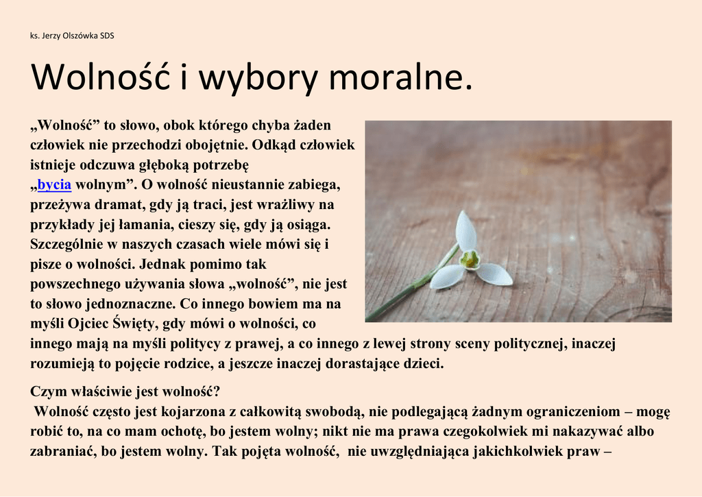 ks. Jerzy Olszówka SDS Wolność i wybory moralne. „Wolność” to słowo, obok którego chyba żaden człowiek nie przechodzi obojętnie. Odkąd człowiek istnieje odczuwa głęboką potrzebę „bycia wolnym”. O wolność nieustannie zabiega, przeżywa dramat, gdy ją traci, jest wrażliwy na przykłady jej łamania, cieszy się, gdy ją osiąga. Szczególnie w naszych czasach wiele mówi się i pisze o wolności. Jednak pomimo tak powszechnego używania słowa „wolność”, nie jest to słowo jednoznaczne. Co innego bowiem ma na myśli Ojciec Święty, gdy mówi o wolności, co innego mają na myśli politycy z prawej, a co innego z lewej strony sceny politycznej, inaczej rozumieją to pojęcie rodzice, a jeszcze inaczej dorastające dzieci. Czym właściwie jest wolność? Wolność często jest kojarzona z całkowitą swobodą, nie podlegającą żadnym ograniczeniom – mogę robić to, na co mam ochotę, bo jestem wolny; nikt nie ma prawa czegokolwiek mi nakazywać albo zabraniać, bo jestem wolny. Tak pojęta wolność, nie uwzględniająca jakichkolwiek praw – zakazów, nakazów, czyli wolność oderwana od obiektywnej hierarchii wartości, w konsekwencji prowadzi do tego, że każdy wolny czyn człowieka należy uznać za dobry, a przynajmniej za usprawiedliwiony. Czy jednak rzeczywiście wolność ma polegać na korzystaniu przez człowieka z całkowitej swobody, bez uwzględnienia jakichkolwiek obiektywnych wartości? Czy człowiek wolny to ten, który całkowicie dowolnie decyduje o tym, co dla niego dobre, a co złe? Czym właściwie jest wolność? Wolność jest jednym z najpiękniejszych darów, jakie Bóg wszczepił w naturę człowieka. Wolność, jako dar Boży, ma swoje źródło w samym Bogu, który jest wolny, tzn. jest absolutnie niezależny od czegokolwiek poza Nim samym. Bóg jest wolny, dlatego też wszystko, co czyni, czyni w sposób wolny, bez jakiejkolwiek konieczności. W sposób wolny stworzył świat i w sposób wolny stworzył też – na swój obraz i podobieństwo – człowieka. Pan Bóg nie musiał niczego stwarzać. Nie musiał stworzyć świata takiego, jaki jest, nie musiał powoływać człowieka do udziału w swoim Boskim życiu. Fakt, że Bóg stworzył świat i człowieka, jest wyłącznie wolnym aktem Bożej miłości. Choć Bóg jednakowo kocha wszystkie swoje stworzenia, to jednak czasami wybiera poszczególnych ludzi, a nawet cały naród, aby powierzyć im szczególne zadania. Wolność Boga w stosunku do stworzenia, a szczególnie do człowieka, nieraz bywa przyrównywana do woli garncarza, który formuje różne naczynia: jak glina w ręce garncarza, który ją kształtuje według swego upodobania, tak ludzie są w ręku Tego, który ich stworzył i odda im według swego sądu (Syr 33,13). Wolność Boga względem człowieka pięknie ilustruje też przypowieść o robotnikach w winnicy (por. Mt 20,1-16). Wolne działanie Boga jest zawsze zgodne z Jego mądrością i świętością. Nie jest ono nigdy działaniem bezsensownym czy złym, ale zawsze dobrym. Pan Bóg stwarzając człowieka na swój obraz i podobieństwo, dał mu udział w swojej wolności. W Katechizmie Kościoła Katolickiego czytamy: Wolność jest zakorzenioną w rozumie i woli możliwością działania lub niedziałania, czynienia tego lub czegoś innego, a więc podejmowania przez siebie dobrowolnych działań. Dzięki wolnej woli każdy decyduje o sobie (KKK 1731). Wolność odpowiedzialna Człowiek jest istotą wolną, tzn. ma możność decydowania o sobie, o swoim życiu, ma możność wybierania. Wolność polega na możliwości wybierania pomiędzy przynajmniej dwoma wartościami – kto nie ma możliwości wyboru, ten nie jest wolny. Ta możliwość wyboru nie sprawia jednak, że wolny wybór człowieka jest pozbawiony oceny moralnej, czyli inaczej mówiąc, że cokolwiek człowiek wybierze, to będzie dobre. Człowiek może bowiem, korzystając ze swej wolności, wybrać dobro, ale może też wybrać zło. Każda wolna decyzja człowieka jest więc w istocie wyborem moralnym. Każdy wolny wybór człowieka pociąga za sobą określone konsekwencje – dobre lub złe. Wolność pociąga więc za sobą konieczność przyjęcia i poniesienia konsekwencji tego wyboru, zarówno dobrych jak i złych. Gotowość do przyjęcia owych konsekwencji nazywamy odpowiedzialnością. Człowiek wolny to ten, kto nie tylko potrafi wybrać spomiędzy kilku możliwości, ale to także ten, kto potrafi przyjąć na siebie konsekwencje swojego wyboru, zarówno dobre jak i złe, a więc człowiek odpowiedzialny. Codzienne doświadczenia uczą, że łatwo jest wybierać, ale znacznie trudniej jest odpowiadać za swoje wybory. Łatwo jest korzystać z wolności, ale trudno być odpowiedzialnym. Szczególnie trudno jest przyjąć konsekwencje swoich wolnych wyborów, gdy są one przykre, złe. Dlatego chyba tak często spotykamy ludzi, którzy pragną uniknąć ciężaru odpowiedzialności. Wolność potrzebuje mądrości Warunkiem odpowiedzialnego korzystania z wolności jest mądrość. Najczęściej jest ona utożsamiana z wiedzą, będącą sumą posiadanych przez człowieka wiadomości. Mądrość nie jest jednak tym samym co wiedza – można być człowiekiem ogromnej wiedzy, a wcale nie być mądrym. Różnica między wiedzą a mądrością polega na tym, że dzięki wiedzy można poznać pewne zasady, ale dopiero mądrość umie te zasady stosować w życiu. Dzięki wiedzy może ktoś, np. poznać treść Dziesięciu Przykazań, ale dopiero mądrość pozwala mu według nich postępować. Mądrość jest trudną sztuką wyboru tego, co dobre, z uwzględnieniem przyszłości, a więc z uwzględnieniem konsekwencji, jakie z tego wyboru mogą wyniknąć. Mądrość jest również darem Boga, jest udziałem człowieka w mądrości Stwórcy. O mądrości pięknie nauczał Jezus w przypowieści o skarbie ukrytym w roli i o kolekcjonerze drogocennych pereł. Pewien człowie