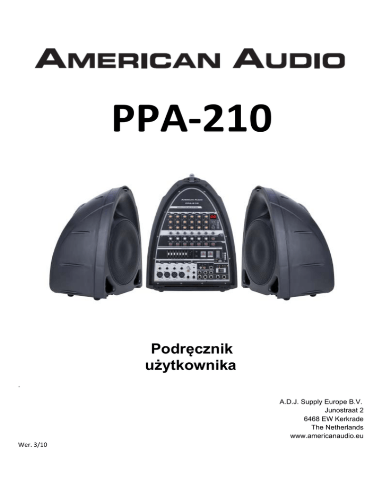 PPA‐210 Podręcznik użytkownika . A.D.J. Supply Europe B.V. Junostraat 2 6468 EW Kerkrade The Netherlands www.americanaudio.eu Wer. 3/10 Spis treści GŁÓWNE CECHY URZĄDZENIA ................................................................................................................................................ 3 ŚRODKI OSTROZNOŚCI ZWIĄZANE Z ELEKTRYCZNOŚCIĄ ........................................................................................................ 4 ŚRODKI OSTROZNOŚCI ZWIĄZANE Z ELEKTRYCZNOŚCIĄ ........................................................................................................ 5 INSTRUKCJE DOTYCZĄCE BEZPIECZEŃSTWA .......................................................................................................................... 6 WYPAKOWANIE ...................................................................................................................................................................... 7 WPROWADZENIE .................................................................................................................................................................... 7 ŚRODKI OSTROŻNOŚCI ZWIĄZANE Z SETUPEM ...................................................................................................................... 7 ELEMENTY STERUJĄCE ORAZ FUNKCJE ................................................................................................................................... 8 PRZEGRODA NA KABLE ......................................................................................................................................................... 10 OTWIERANIE/ZAMYKANIE SYSTEMU .................................................................................................................................... 11 ZŁĄCZA .................................................................................................................................................................................. 12 SETUP URZĄDZENIA W CZASIE WYSTĘPU NA ŻYWO ............................................................................................................ 13 MONTAŻ ............................................................................................................................................................................... 14 CZYSZCZENIE ......................................................................................................................................................................... 15 ROZWIĄZYWANIE PROBLEMÓW .......................................................................................................................................... 15 DANE TECHNICZNE ............................................................................................................................................................... 16 ROHS – OLBRZYMI WKŁAD W OCHRONĘ ŚRODOWISKA ...................................................................................................... 18 WEEE – ODPADY POCHODZĄCE ZE SPRZĘTU ELEKTRYCZNEGO I ELEKTRONICZNEGO ......................................................... 18 UWAGI .................................................................................................................................................................................. 19 A.D.J. Supply Europe B.V. – www.americanaudio.eu – PPA - 210 Podręcznik użytkownika Strona 2 GŁÓWNE CECHY URZĄDZENIA • 4 Wejścia kanału Mono i 2 Stereo • Główne wyjścia Stereo • Trim z diodą LED Peak, 3-zakresowy EQ, Aux/EFX i Pan dla wejścia Mono • Main L/R, Aux Return, Tape Level • Efekt DSP 24-Bit, 100 zaprogramowanych ustawień, EFX On/Off i EFX Level • Tape z przełącznikiem PFL, HP/Control Room i zasilanie fantomowe • 4 wejścia kanału Mono, wejście Mic (XLR), wejścia liniowe 1/4” (TRS) • Dla wejścia Stereo (Kanał 7- Kanał 8) wejścia liniowe RCA lub wejścia TRS Mini Jack • Jack Phone 1/4” dla Main, Aux Send, EFX Send, Control Room Słuchawek • Jack dla Tape i Jack Phone 1/4” dla przełącznika nożnego A.D.J. Supply Europe B.V. – www.americanaudio.eu – PPA - 210 Podręcznik użytkownika Strona 3 ŚRODKI OSTROZNOŚCI ZWIĄZANE Z ELEKTRYCZNOŚCIĄ OSTRZEŻENIE: ABY ZAPOBIEGAĆ ZAGROŻENIU POŻAREM LUB PORAŻENIU PRĄDEM NALEŻY CHRONIĆ URZĄDZENIE PRZED WODĄ I WILGOCIĄ ABY UNIKNĄĆ PORAŻENIA PRĄDEM NIE WOLNO UŻYWAĆ (SPOLARYZOWANEJ) WTYCZKI Z PRZEDŁUŻACZEM, PRZEJŚCIÓWKA LUB INNYM WYJŚCIEM, JEŚLI NIE MOŻNA WŁOŻYĆ WTYKÓW TAK BY BOLCE NIE BYŁY CAŁKOWICIE ZASŁONIĘTE. Numer seryjny oraz numer modelu tego urządzenia znajdują się na tylnym panelu. Prosimy o wpisanie tych numerów poniżej i ich zachowanie. Nr modelu_____________________________ Nr seryjny_____________________________ Uwagi dot. zakupu: Data zakupu_______________________ Nazwa sprzedawcy_________________________ Adres sprzedawcy________________________ _____________________________________ _____________________________________ Telefon sprzedawcy__________________________ ATTENTION: POUR PREVENIR LES CHOCS ELECTRIQUES NE PAS UTILISER CETTE FICHE POLARISEE AVEC UN PROLON-GATEUR, UNE PRISE DE COURANT OU UNE AUTRE SORTIE DE COURANT, SAUF SI LES LAMES PEUVENT ETRE INSEREES A FONDSANS EN LAISSER AUCUNE PARTIE A DECOUVERT. UWAGA: Produkt ten spełnia przepisy FCC gdy do podłączenia urządzenia oraz innego wyposażenia używane są kable i złącza ekranowane. Aby zapobiegać zakłóceń elektromagnetycznych z innymi urządzeniami elektrycznymi takimi jak radia i telewizory należy używać ekranowanych kabli i złączy. A.D.J. Supply Europe B.V. – www.americanaudio.eu – PPA - 210 Podręcznik użytkownika Strona 4 ŚRODKI OSTROZNOŚCI ZWIĄZANE Z ELEKTRYCZNOŚCIĄ Środki ostrożności związane z elektrycznością Uwaga RYZYKO PORAŻENIA PRĄDEM NIE OTWIERAĆ Błyskawica umieszczona wewnątrz trójkąta równoramiennego oznacza ostrz