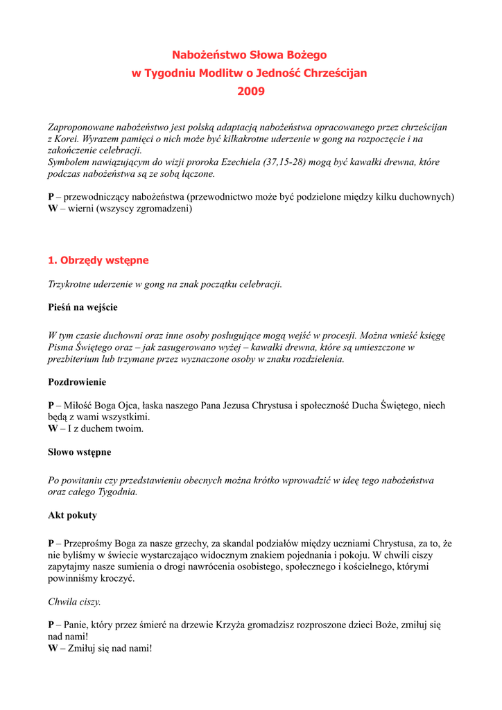 Nabożeństwo Słowa Bożego w Tygodniu Modlitw o Jedność Chrześcijan 2009 Zaproponowane nabożeństwo jest polską adaptacją nabożeństwa opracowanego przez chrześcijan z Korei. Wyrazem pamięci o nich może być kilkakrotne uderzenie w gong na rozpoczęcie i na zakończenie celebracji. Symbolem nawiązującym do wizji proroka Ezechiela (37,15-28) mogą być kawałki drewna, które podczas nabożeństwa są ze sobą łączone. P – przewodniczący nabożeństwa (przewodnictwo może być podzielone między kilku duchownych) W – wierni (wszyscy zgromadzeni) 1. Obrzędy wstępne Trzykrotne uderzenie w gong na znak początku celebracji. Pieśń na wejście W tym czasie duchowni oraz inne osoby posługujące mogą wejść w procesji. Można wnieść księgę Pisma Świętego oraz – jak zasugerowano wyżej – kawałki drewna, które są umieszczone w prezbiterium lub trzymane przez wyznaczone osoby w znaku rozdzielenia. Pozdrowienie P – Miłość Boga Ojca, łaska naszego Pana Jezusa Chrystusa i społeczność Ducha Świętego, niech będą z wami wszystkimi. W – I z duchem twoim. Słowo wstępne Po powitaniu czy przedstawieniu obecnych można krótko wprowadzić w ideę tego nabożeństwa oraz całego Tygodnia. Akt pokuty P – Przeprośmy Boga za nasze grzechy, za skandal podziałów między uczniami Chrystusa, za to, że nie byliśmy w świecie wystarczająco widocznym znakiem pojednania i pokoju. W chwili ciszy zapytajmy nasze sumienia o drogi nawrócenia osobistego, społecznego i kościelnego, którymi powinniśmy kroczyć. Chwila ciszy. P – Panie, który przez śmierć na drzewie Krzyża gromadzisz rozproszone dzieci Boże, zmiłuj się nad nami! W – Zmiłuj się nad nami! P – Chryste, który zmartwychwstając połączyłeś nas nadzieją życia wiecznego, zmiłuj się nad nami! W – Zmiłuj się nad nami! P – Panie, który zesłałeś Ducha Świętego, abyśmy w twoich rękach stanowili jedno, zmiłuj się nad nami! W – Zmiłuj się nad nami! W odpowiedzi na wezwania zgromadzenie może także śpiewać „Kyrie, eleison!”. P – Niech się zmiłuje nad nami Bóg Wszechmogący, a odpuściwszy nam grzechy doprowadzi nas do życia wiecznego. W – Amen. Modlitwa P – Módlmy się. Wszechmogący i miłosierny Ojcze, przyjmij od nas, grzesznych i podzielonych, uwielbienie i hołd. Spraw, abyśmy z wytrwałością, roztropnością i odwagą podejmowali posługę na rzecz jednania chrześcijan i w ten sposób przyczyniali się do jedności całego rodzaju ludzkiego. Prosimy Ciebie o to przez naszego Pana Jezusa Chrystusa, Twojego Syna, który z tobą żyje i króluje w jedności Ducha Świętego, Bóg przez wszystkie wieki wieków. W – Amen. 2. Proklamacja Słowa Bożego – Ez 37,15-28: W moim ręku będą stanowić jedno – Ps 146 (145) śpiewany z refrenem: Szczęśliwy naród ufający Panu – Rz 8,18-25: Chwała, która ma się objawić – „Alleluja” śpiewane – J 17,8-11: Aby byli jedno, jak my Homilia Po niej chwila ciszy. 3. Modlitwy wstawiennicze oraz symboliczne gesty jedności Modlitwy wstawiennicze Modlitwa Pańska P – Jednym głosem zanieśmy do Ojca modlitwę, której nauczył nas Jezus Chrystus, wołając: W – Ojcze nasz… Albowiem Twoje jest królestwo i moc, i chwała na wieki wieków. Amen. Znak pokoju P – Na znak naszego zaangażowania w dzieło pojednania przekażmy sobie znak Chrystusowego pokoju. Symboliczny gest jedności Po znaku pokoju przewidziano gest połączenia rozdzielonych kawałków drewna (w jeden albo w pary). Można tę czynność zapowiedzieć i wykonać podczas śpiewu lub muzyki przed krzyżem Chrystusa – „drzewem, na którym zawisło zbawienie świata”. Można także zapowiedzieć wyznanie wiary, wyjaśniając pochodzenie słowa „symbol” (od gr. symballo – „łączę”, „składam”) i jego znaczenie: łączenie rozdzielonych części w celu utworzenia rozpoznawczego znaku. Wyznanie wiary P – Słowami naszych Ojców wyznajmy wspólną wiarę: (Symbol Apostolski w wersji przyjętej w Kościele Ewangelicko-Augsburskim) W – Wierzę w Boga, Ojca wszechmogącego, Stworzyciela nieba i ziemi. I w Jezusa Chrystusa, Syna Jego jedynego, Pana naszego, który się począł z Ducha Świętego, narodził się z Maryi Panny, umęczon pod Poncjuszem Piłatem, ukrzyżowan, umarł i pogrzebion, zstąpił do piekieł, trzeciego dnia zmartwychwstał, wstąpił na niebiosa; siedzi po prawicy Boga, Ojca wszechmogącego, skąd przyjdzie sądzić żywych i umarłych. Wierzę w Ducha Świętego, święty Kościół powszechny, społeczność świętych, grzechów odpuszczenie, ciała zmartwychwstanie i żywot wieczny. Amen. Modlitwa (Rz 8,38n) P – „Ani śmierć, ani życie, ani aniołowie, ani zwierzchności, ani rzeczy teraźniejsze, ani przyszłe, ani moce, ani to, co wysoko, ani to, co głęboko, ani żadne inne stworzenie nie zdoła nas odłączyć od miłości Boga, która jest w Chrystusie Jezusie, naszym Panu”. Amen Tutaj jest miejsce na ogłoszenia końcowe i podziękowania. 4. Błogosławieństwo i rozesłanie Błogosławieństwo (może być udzielone przez kilku duchownych) P – Pan z wami. W – I z duchem twoim. P – Niech wam błogosławi Pan i niechaj was strzeże. Niech rozjaśni Pan oblicze swoje nad wami i niech wam miłościw będzie. Niech obróci Pan twarz swoją ku wam i niechaj wam da pokój. W – Amen. P – Niech was błogosławi Bóg Wszechmogący: Ojciec i Syn, i Duch Święty. W – Amen. P – Idźmy w jedności i pokoju Chrystusa! W – Bogu niech będą dzięki! Procesja końcowa Trzykrotne uderzenie w gong obwieszcza koniec celebracji i przypomina o łączności z chrześcijanami w Korei. Duchowni i posługujący w nabożeństwie formują procesję wyjścia, której towarzyszy śpiew. Symboliczne kawałki drewna (np. połączone w pary) można rozdać na pamiątkę i na znak jedności uczestnikom, zwłaszcza liderom wspólnot chrześcijańskich. __________________________