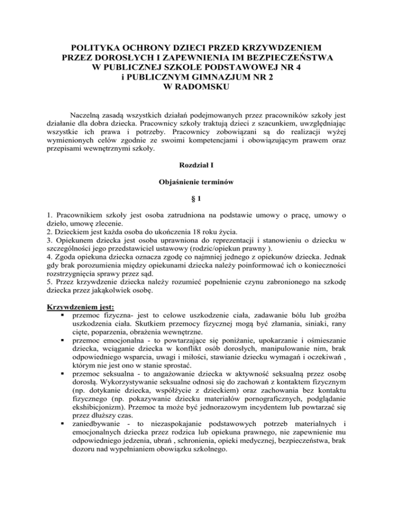 POLITYKA OCHRONY DZIECI PRZED KRZYWDZENIEM PRZEZ DOROSŁYCH I ZAPEWNIENIA IM BEZPIECZEŃSTWA W PUBLICZNEJ SZKOLE PODSTAWOWEJ NR 4 i PUBLICZNYM GIMNAZJUM NR 2 W RADOMSKU Naczelną zasadą wszystkich działań podejmowanych przez pracowników szkoły jest działanie dla dobra dziecka. Pracownicy szkoły traktują dzieci z szacunkiem, uwzględniając wszystkie ich prawa i potrzeby. Pracownicy zobowiązani są do realizacji wyżej wymienionych celów zgodnie ze swoimi kompetencjami i obowiązującym prawem oraz przepisami wewnętrznymi szkoły. Rozdział I Objaśnienie terminów §1 1. Pracownikiem szkoły jest osoba zatrudniona na podstawie umowy o pracę, umowy o dzieło, umowę zlecenie. 2. Dzieckiem jest każda osoba do ukończenia 18 roku życia. 3. Opiekunem dziecka jest osoba uprawniona do reprezentacji i stanowieniu o dziecku w szczególności jego przedstawiciel ustawowy (rodzic/opiekun prawny ). 4. Zgoda opiekuna dziecka oznacza zgodę co najmniej jednego z opiekunów dziecka. Jednak gdy brak porozumienia między opiekunami dziecka należy poinformować ich o konieczności rozstrzygnięcia sprawy przez sąd. 5. Przez krzywdzenie dziecka należy rozumieć popełnienie czynu zabronionego na szkodę dziecka przez jakąkolwiek osobę. Krzywdzeniem jest: przemoc fizyczna- jest to celowe uszkodzenie ciała, zadawanie bólu lub groźba uszkodzenia ciała. Skutkiem przemocy fizycznej mogą być złamania, siniaki, rany cięte, poparzenia, obrażenia wewnętrzne. przemoc emocjonalna - to powtarzające się poniżanie, upokarzanie i ośmieszanie dziecka, wciąganie dziecka w konflikt osób dorosłych, manipulowanie nim, brak odpowiedniego wsparcia, uwagi i miłości, stawianie dziecku wymagań i oczekiwań , którym nie jest ono w stanie sprostać. przemoc seksualna - to angażowanie dziecka w aktywność seksualną przez osobę dorosłą. Wykorzystywanie seksualne odnosi się do zachowań z kontaktem fizycznym (np. dotykanie dziecka, współżycie z dzieckiem) oraz zachowania bez kontaktu fizycznego (np. pokazywanie dziecku materiałów pornograficznych, podglądanie ekshibicjonizm). Przemoc ta może być jednorazowym incydentem lub powtarzać się przez dłuższy czas. zaniedbywanie - to niezaspokajanie podstawowych potrzeb materialnych i emocjonalnych dziecka przez rodzica lub opiekuna prawnego, nie zapewnienie mu odpowiedniego jedzenia, ubrań , schronienia, opieki medycznej, bezpieczeństwa, brak dozoru nad wypełnianiem obowiązku szkolnego. 6. Osoba odpowiedzialna za Internet-to pracownik wyznaczony przez dyrektora szkoły, który sprawuje nadzór nad korzystaniem z Internetu na terenie placówki przez dzieci oraz za bezpieczeństwo dzieci w Internecie. 7. Osoba odpowiedzialna za Politykę ochrony dzieci przed krzywdzeniem przez dorosłych i zapewnienia im bezpieczeństwa jest wyznaczony przez dyrektora szkoły pracownik, sprawujący nadzór nad jej realizacją w szkole. 8. Zespół interdyscyplinarny to utworzony przez prezydenta miasta zespół przedstawicieli jednostek organizacyjnych pomocy społecznej, gminnej komisji rozwiązywania problemów alkoholowych, Policji, oświaty, ochrony zdrowia i organizacji pozarządowych. W skład zespołu interdyscyplinarnego wchodzą także kuratorzy sądowi jak również prokuratorzy oraz przedstawiciele instytucji działających na rzecz przeciwdziałania przemocy. 9. Daną osobową dziecka jest każda informacja umożliwiająca pełną identyfikacje dziecka. Rozdział II Procedury interwencji w przypadku krzywdzenia dziecka §2 W przypadku uzyskania przez pracownika szkoły informacji, że dziecko jest krzywdzone lub istnieje takie podejrzenie pracownik ma obowiązek przekazania uzyskanej informacji dyrektorowi szkoły lub wychowawcy klasy lub pedagogowi lub psychologowi. §3 1. Zgłoszona sprawa poddana jest wyjaśnieniu przez wychowawcę klasy, pedagoga, psychologa oraz o ile zachodzi taka konieczność pielęgniarkę szkolną . 2. Pracownicy wyjaśniający sprawę podejmują następujące działania: przeprowadzają rozmowę z pokrzywdzonym dzieckiem, przeprowadzają rozmowę z innymi osobami, które pomogą w ocenie sytuacji, wzywają do szkoły rodziców lub opiekunów prawnych pokrzywdzonego dziecka, sporządzają notatkę według ustalonego wzoru (załącznik nr 1), opracowują plan pomocy dziecku we wzajemnej współpracy. 3. Wszystkie działania przewidziane w planie pomocy dziecku maja na celu zapewnienie dziecku bezpieczeństwa i wsparcia. 4. Plan pomocy dziecku powinien zawierać wskazania dotyczące: podjęcia działań przez szkołę w celu zapewnienia dziecku bezpieczeństwa, w tym zgłoszenie podejrzenie krzywdzenia do odpowiedniej instytucji, form wsparcia jakie szkoła może zaoferować dziecku, działań zespołu nauczycieli względem krzywdzonego dziecka, skierowania dziecka do specjalistycznej placówki pomocy dziecku jeżeli istnieje taka potrzeba. 5. Plan pomocy dziecku jest przedstawiony przez pedagoga lub psychologa w obecności wychowawcy klasy rodzicom/opiekunom prawnym dziecka z zaleceniem współpracy przy jego realizacji. 6. Wychowawca klasy monitoruje przebieg realizacji planu i jego skutków względem dziecka. §4 1. W przypadku gdy efekty działań nie przyniosą oczekiwanych rezultatów, przez pracowników szkoły składany jest wniosek o wgląd w sytuacje rodzinną i zgłoszenie na Policje lub prokuraturę. 2. Rodzice lub opiekunowie prawni dziecka informowani są przez psychologa lub pedagoga w obecności wychowawcy o obowiązku szkoły zgłoszenia podejrzenia krzywdzenia dziecka do odpowiedniej instytucji ( Policja lub prokuratura i sąd). 3. Po poinformowaniu rodziców przez psychologa lub pedagoga zgodnie z punktem poprzedzającym dyrektor szkoły składa zawiadomienie o podejrzeniu popełnienia przestępstwa do Policji lub prokuratury oraz wniosek o wgląd w sytuację rodziny do Sądu Rejonowego w Radomsku Wydział Rodzinny i Nieletnich. 4. Dalszy tok postępowania leży w kompetencji wskazanych wyżej 