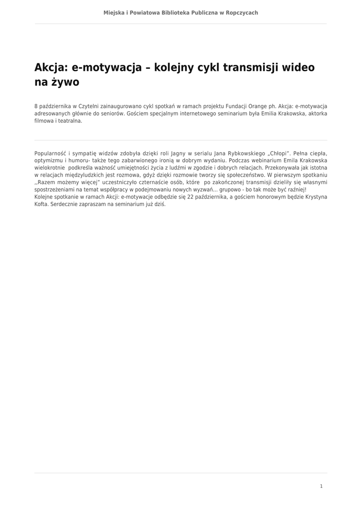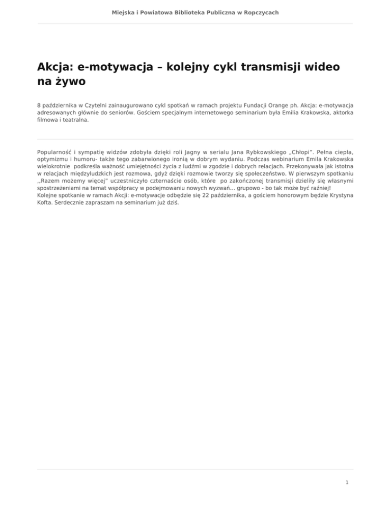 Miejska i Powiatowa Biblioteka Publiczna w Ropczycach Akcja: e-motywacja – kolejny cykl transmisji wideo na żywo 8 października w Czytelni zainaugurowano cykl spotkań w ramach projektu Fundacji Orange ph. Akcja: e-motywacja adresowanych głównie do seniorów. Gościem specjalnym internetowego seminarium była Emilia Krakowska, aktorka filmowa i teatralna. Popularność i sympatię widzów zdobyła dzięki roli Jagny w serialu Jana Rybkowskiego „Chłopi”. Pełna ciepła, optymizmu i humoru- także tego zabarwionego ironią w dobrym wydaniu. Podczas webinarium Emila Krakowska wielokrotnie podkreśla ważność umiejętności życia z ludźmi w zgodzie i dobrych relacjach. Przekonywała jak istotna w relacjach międzyludzkich jest rozmowa, gdyż dzięki rozmowie tworzy się społeczeństwo. W pierwszym spotkaniu ,,Razem możemy więcej” uczestniczyło czternaście osób, które po zakończonej transmisji dzieliły się własnymi spostrzeżeniami na temat współpracy w podejmowaniu nowych wyzwań… grupowo - bo tak może być raźniej! Kolejne spotkanie w ramach Akcji: e-motywacje odbędzie się 22 października, a gościem honorowym będzie Krystyna Kofta. Serdecznie zapraszam na seminarium już dziś. 1