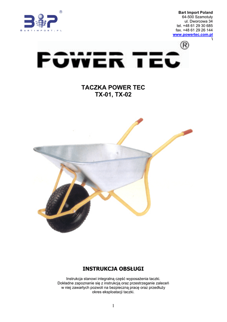 Bart Import Poland 64-500 Szamotuły ul. Dworcowa 34 tel. +48 61 29 30 685 fax. +48 61 29 26 144 www.powertec.com.pl \ TACZKA POWER TEC TX-01, TX-02 INSTRUKCJA OBSŁUGI Instrukcja stanowi integralną część wyposażenia taczki. Dokładne zapoznanie się z instrukcją oraz przestrzeganie zaleceń w niej zawartych pozwoli na bezpieczną pracę oraz przedłuży okres eksploatacji taczki. 1 PRZEZNACZENIE: Taczki POWER TEC TX-01 i 02 ze skrzynią tłoczoną z blachy ocynkowanej przeznaczone są do transportu materiałów stałych, sypkich i półpłynnych. Taczki POWER TEC mogą być również wykorzystywane w budownictwie np. do transportu mieszanek betonowych czy zapraw murarskich. PODSTAWOWE DANE TECHNICZNE: Model Pojemność Maks. ładowność Grubość misy Waga POWER TEC TX-01 72L 200 kg 0,7 mm 11,40 POWER TEC TX-02 90L 250 kg 0,8 mm 12,50 BUDOWA: Taczka składa się z czterech zasadniczych elementów: • misy • ramy • wspornika • koła jezdnego MONTAŻ: Taczka POWER TEC dostarczana jest w częściach lub w stanie zmontowanym. Montaż polega na przykręceniu do ramy misy, koła i wsporników w kolejności przedstawionej na następujących rysunkach. 1. Przymocowanie ramy do misy taczki B) A) 2 C) D) 2. Przykręcenie koła jezdnego A) B) C) D) E) F) 3. Montaż wspornika A) B) 3 OBSŁUGA I UŻYTKOWANIE Przed użyciem taczki należy sprawdzić, czy koło jest napompowane oraz czy lekko się obraca, a także czy misa jest odpowiednio przykręcona do ramy. Uwaga! Przy przewożeniu ciężkich przedmiotów np. kamieni, gruzu, należy je ładować w tej części misy, która znajduje się bliżej koła. ZASADY BEZPIECZNEJ PRACY Podczas transportu należy zachować ostrożność. Uwaga! Nie wolno zostawiać wózka taczkowego na przejściach dla aut, drogach przejazdowych i pochyłościach. KARTA GWARANCYJNA WARUNKI GWARANCJI 1. Gwarancja dotyczy taczek zakupionych w Polsce i jest ważna na terytorium Rzeczpospolitej Polskiej. 2. Bart Import Poland gwarantuje sprawne działanie taczki przez okres 24 miesięcy. 3. Gwarancja przewiduje bezpłatne części zamienne w okresie 24 miesięcy od daty pierwszego użytkowania drabiny nie dłużej jednak niż 30 miesięcy od wydania urządzenia z magazynu centralnego BiP 4. Niniejszą gwarancją objęte są usterki taczki spowodowane wadliwymi częściami i/lub defektami produkcyjnymi. 5. Gwarancja będzie respektowana przez BiP po przedstawieniu kopii lub oryginału dowodu zakupu (paragon, faktura, rachunek) 6. Gwarant może odmówić dokonania nieodpłatnej dostawy części gwarancyjnych w przypadku stwierdzenia niezgodności danych w dokumentach z danymi na sprzęcie, naruszenia plomb, naniesienia poprawek lub skreśleń przez osoby nieupoważnione. 7. Reklamujący powinien dostarczyć sprzęt do Serwisu w oryginalnym opakowaniu fabrycznym dodatkowo zabezpieczonym przed uszkodzeniem. Uszkodzenia spowodowane niedostatecznym zabezpieczeniem wysyłki sprzętu nie podlegają naprawom gwarancyjnym. Reklamujący nie może żądać gratyfikacji, jeśli nieodpowiednio oznakuje lub zabezpieczy przesyłkę. 8. Ujawnione w okresie gwarancji wadliwe części będą bezpłatnie wymienione przez Autoryzowaną Stację Serwisową [ASS] w terminie 14 dni roboczych od daty pisemnego zgłoszenia awarii i dostarczenia urządzenia do serwisu. 9. W przypadku konieczności sprowadzenia części zamiennych z zagranicy okres naprawy może ulec przedłużeniu o czas potrzebny na sprowadzenie części zamiennych. 10. Okres gwarancji przedłuża się o czas pozostawania sprzętu w naprawie. 11. Odbiorca towaru jest zobowiązany do wstępnej oceny reklamacji gwarancyjnej. 12. Gwarancją nie są objęte: a) Uszkodzenia drabin wynikające z nieprawidłowej eksploatacji, konserwacji, obsługi, przechowywania, użycia niewłaściwych materiałów eksploatacyjnych. b) Mechaniczne uszkodzenia drabin i wywołane nimi wady. c) Wady i uszkodzenia spowodowane działaniem siły wyższej np. powodzią, korozją etc. d) Usterki spowodowane samodzielnymi naprawami, przeróbkami i zmianami konstrukcyjnymi. e) Czynności, do których wykonania zobowiązany jest wg instrukcji użytkownik we własnym zakresie – ewentualne czyszczenie dokonywane jest na koszt użytkownika według cennika usług serwisowych i nie jest traktowane jako usługa gwarancyjna. Części ulegające normalnemu zużyciu, wynikającemu z użytkowania urządzenia f) g) Produkty, w których Kartę Gwarancyjną lub numery seryjne w jakikolwiek sposób zmieniono, zamazano, usunięto lub zatarto. 13. W przypadku nieuzasadnionych zgłoszeń reklamacyjnych Klient ponosi koszty związane z wykonanymi czynnościami.. 14. Decyzja BiP w zakresie zasadności zgłoszonych usterek jest decyzją ostateczną. 15. Warunkiem zachowania gwarancji jest dokonywanie wymiany części przez wskazaną ASS. 16. Bart Import Poland nie będzie ponosić odpowiedzialności za terminowość usług gwarancyjnych, jeśli działalność Bart Import Poland zostanie zakłócona nieprzewidzianymi okolicznościami o charakterze wyższego rzędu. 17. Użytkownik zobowiązuje się do odbioru taczki w terminie do 14 dni od poinformowania o gotowości sprzętu do odbioru, po przekroczeniu tego terminu ASS naliczy opłatę za magazynowanie zgodnie z cennikiem BiP W sprawach nie uregulowanych niniejszymi Warunkami Gwarancji zastosowanie mają odpowiednie przepisy Kodeksu Cywilnego. Data produkcji................................. Data sprzedaży ................................. Pieczęć punktu sprzedaży................................. Podpis sprzedawcy ............................... 4
