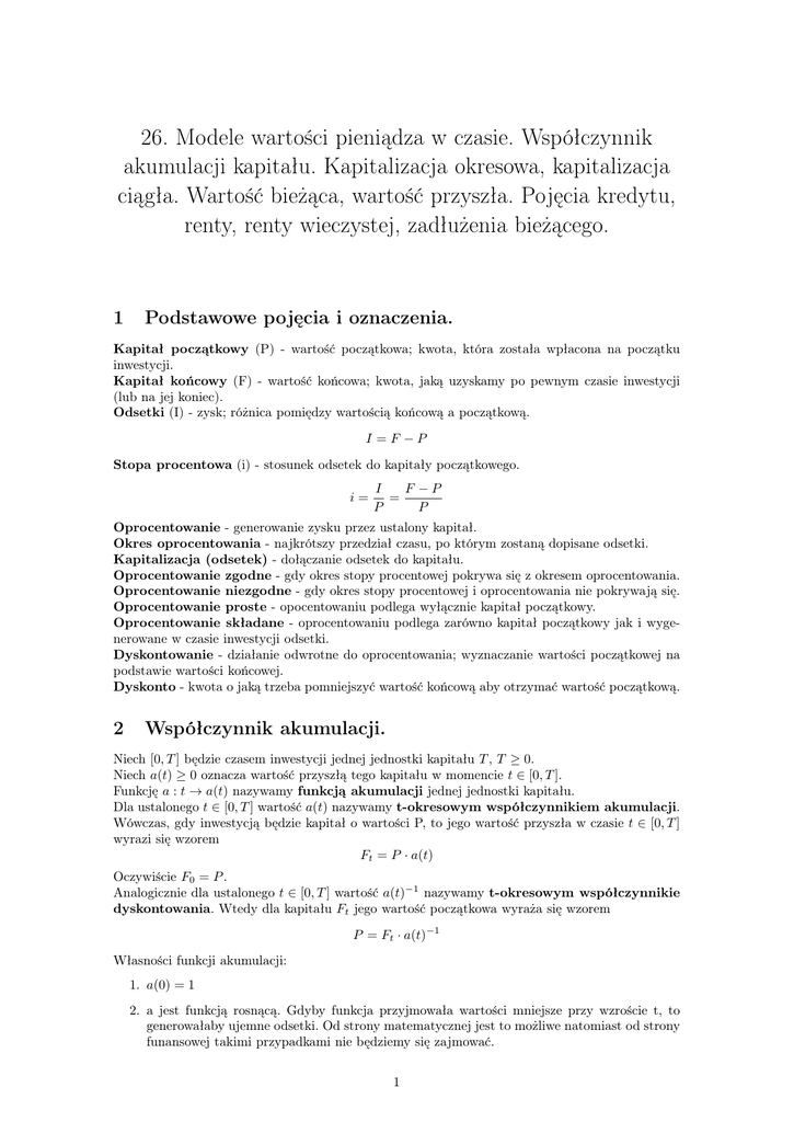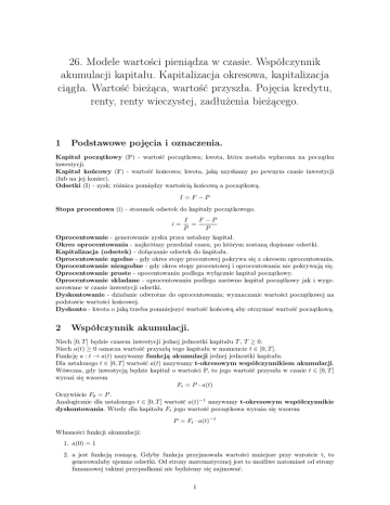 26. Modele wartości pieniądza w czasie. Współczynnik akumulacji kapitału. Kapitalizacja okresowa, kapitalizacja ciągła. Wartość bieżąca, wartość przyszła. Pojęcia kredytu, renty, renty wieczystej, zadłużenia bieżącego. 1 Podstawowe pojęcia i oznaczenia. Kapitał początkowy (P) - wartość początkowa; kwota, która została wpłacona na początku inwestycji. Kapitał końcowy (F) - wartość końcowa; kwota, jaką uzyskamy po pewnym czasie inwestycji (lub na jej koniec). Odsetki (I) - zysk; różnica pomiędzy wartością końcową a początkową. I =F −P Stopa procentowa (i) - stosunek odsetek do kapitały początkowego. i= F −P I = P P Oprocentowanie - generowanie zysku przez ustalony kapitał. Okres oprocentowania - najkrótszy przedział czasu, po którym zostaną dopisane odsetki. Kapitalizacja (odsetek) - dołączanie odsetek do kapitału. Oprocentowanie zgodne - gdy okres stopy procentowej pokrywa się z okresem oprocentowania. Oprocentowanie niezgodne - gdy okres stopy procentowej i oprocentowania nie pokrywają się. Oprocentowanie proste - opocentowaniu podlega wyłącznie kapitał początkowy. Oprocentowanie składane - oprocentowaniu podlega zarówno kapitał początkowy jak i wygenerowane w czasie inwestycji odsetki. Dyskontowanie - działanie odwrotne do oprocentowania; wyznaczanie wartości początkowej na podstawie wartości końcowej. Dyskonto - kwota o jaką trzeba pomniejszyć wartość końcową aby otrzymać wartość początkową. 2 Współczynnik akumulacji. Niech [0, T ] będzie czasem inwestycji jednej jednostki kapitału T , T ≥ 0. Niech a(t) ≥ 0 oznacza wartość przyszłą tego kapitału w momencie t ∈ [0, T ]. Funkcję a : t → a(t) nazywamy funkcją akumulacji jednej jednostki kapitału. Dla ustalonego t ∈ [0, T ] wartość a(t) nazywamy t-okresowym współczynnikiem akumulacji. Wówczas, gdy inwestycją będzie kapitał o wartości P, to jego wartość przyszła w czasie t ∈ [0, T ] wyrazi się wzorem Ft = P · a(t) Oczywiście F0 = P . Analogicznie dla ustalonego t ∈ [0, T ] wartość a(t)−1 nazywamy t-okresowym współczynnikie dyskontowania. Wtedy dla kapitału Ft jego wartość początkowa wyraża się wzorem P = Ft · a(t)−1 Własności funkcji akumulacji: 1. a(0) = 1 2. a jest funkcją rosnącą. Gdyby funkcja przyjmowała wartości mniejsze przy wzroście t, to generowałaby ujemne odsetki. Od strony matematycznej jest to możliwe natomiast od strony funansowej takimi przypadkami nie będziemy się zajmować. 1 3. Jeżeli generowane odsetki będą gromadzić się w sposób ciągły, to funkcja akumulacji też będzie ciągła. Jeżeli odsetki będą gromadzić się w sposób skokowy zależnie od okresu oprocentowania, to funcja akumulacji będzie w tych punktach nieciągła, a dokładnie będzie ciągła z prawej strony. 3 Oprocentowanie zgodne. Załóżmy, że czas oprocentowania składa się z n podokresów będących okresami oprocentowania oraz, ze okres stopy procentowej pokrywa się z okresem oprocentowania. 3.1 Oprocentowanie proste Kapitalizację w której podstawą naliczania odsetek jest tylko kapitał początkowy nazywamy oprocentowaniem prostym (kapitalizacją prostą). W kapitalizacji prostej odsetki nie podlegają oprocentowaniu. Zasada oprocentowania prostego stosowana jest w transakcjach bankowych krótkoterminowych do jednego roku albo też w umowach poza sferą bankową. Zatem jeżeli mamy oprocentowanie roczne i stopę procentową roczną, to po roku otrzymamy P · i odsetek, po dwóch latach P · 2i itp. W efekcie tego mamy po n latach: Kapitał końcowy: Fn = P (1 + ni) Funcja akumulacji: a(n) = 1 + ni Przykład 1. Jaka kwota w oprocentowaniu prostym na 40% rocznie pozwoli po 5 latach uzyskać kwotę 30 mln złotych? 30 = P (1 + 5 · 0, 4) 30 = 10 (mln zł) 3 Zatem, jakbyśmy teraz zainwestowali 10 mln zł to po 5 latach mielibyśmy 30 mln zł. P = 3.2 Oprocentowanie składane Model oprocentowania, w którym odsetki wygenerowane po każdym okresie oprocentowania podlegają kapitalizacji nazywamy oprocentowaniem składanym. Stosowany jest z reguły w inwestycjach średnioterminowych (1−5 lat) i długoterminowych (powyżej 5 lat). Jeżeli procent jest dopisywany do rachunku corocznie, to po jednym roku pieniądze złożone na rachunku zostają pomnożone przez 1 + i. Po drugim roku czynnik ten rośnie do (1 + i)2 . W efekcie tego mamy po n latach: Kapitał końcowy: Fn = P (1 + i)n Funcja akumulacji: a(n) = (1 + i)n 4 Oprocentowanie niezgodne. W dotychczasowych rozważaniach odsetki dopisywaliśmy do kapitału na końcu kolejnych lat. Jednak większość banków podaje stopę procentową roczną a odsetki nalicza i wypłaca częściej - co kwartał, co miesiąc. W takiej sytuacji korzystamy z modelu oprocentowania niezgodnego. Oprocentowanie jest niezgodne jeżeli okres stopy procentowej nie jest równy okresowi kapitalizacji. Możemy podzielić takie sytuacje na dwie klasy: 2 1. Kapitalizację w podokresach, gdy okres stopy procentowej jest całkowitą wielokrotnością okresu kapitalizacji, np. roczna stopa procentowa i kapitalizacja miesięczna. 2. Kapitalizację w nadokresach, gdy okres kapitalizacji jest całkowitą wielokrotnością okresu stopy procentowej, np. roczna stopa procentowa i kapitalizacja 4-letnia. Niech i oznacza teraz roczną stopę procentową. Niech k oznacza stosunek: k= okres stopy procentowej okres kapitalizacji W przypadku oprocentowania niezgodnego odsetki przypadające na jeden okres kapitalizacji wyznacza się na podstawie stopy, której okres pokrywa się z okresem kapitalizacji. Nazywamy ją stopą podokresową (dostosowaną, względną) i oznaczamy przez ik . Wyznaczamy ją ze wzoaru: i k W takim przypadku stopę i nazywamy nominalną stopą procentową. Wyznaczenie wartości przyszłej jest tu analogiczne do przypadku kapitalizacji zgodnej. Jedynie w miejscu stopy i używa się stopy podokresowej ik , zaś liczbę okresów kapitalizacji łatwo wyznaczyć 