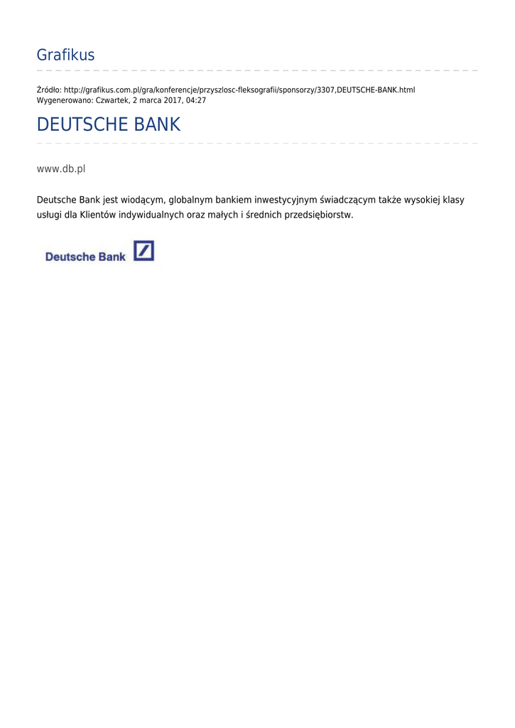 Grafikus Źródło: http://grafikus.com.pl/gra/konferencje/przyszlosc-fleksografii/sponsorzy/3307,DEUTSCHE-BANK.html Wygenerowano: Czwartek, 2 marca 2017, 04:27 DEUTSCHE BANK www.db.pl Deutsche Bank jest wiodącym, globalnym bankiem inwestycyjnym świadczącym także wysokiej klasy usługi dla Klientów indywidualnych oraz małych i średnich przedsiębiorstw.