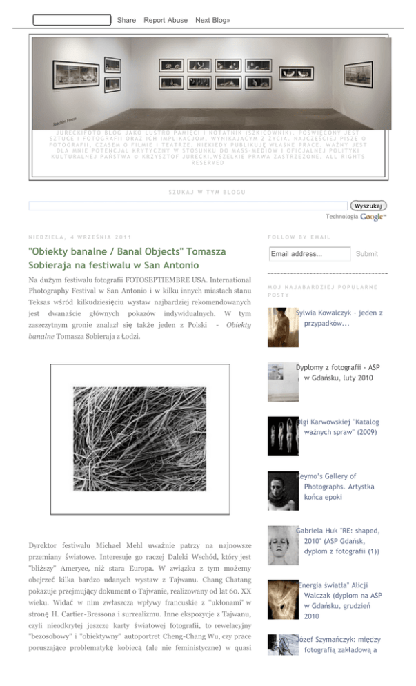 Share Report Abuse Next Blog» JURECKIFOTO BLOG JAKO LUSTRO PAMIĘCI I NOTATNIK (SZKICOWNIK). POŚWIĘCONY JEST SZTUCE I FOTOGRAFII ORAZ ICH IMPLIKACJOM, WYNIKAJĄCYM Z ŻYCIA. NAJCZĘŚCIEJ PISZĘ O FOTOGRAFII, CZASEM O FILMIE I TEATRZE. NIEKIEDY PUBLIKUJĘ WŁASNE PRACE. WAŻNY JEST DLA MNIE POTENCJAŁ KRYTYCZNY W STOSUNKU DO MASS-MEDIÓW I OFICJALNEJ POLITYKI KULTURALNEJ PAŃSTWA © KRZYSZTOF JURECKI,WSZELKIE PRAWA ZASTRZEŻONE, ALL RIGHTS RESERVED SZUKAJ W TYM BLOGU Wyszukaj Technologia NIEDZIELA, 4 WRZEŚNIA 2011 FOLLOW BY EMAIL "Obiekty banalne / Banal Objects" Tomasza Sobieraja na festiwalu w San Antonio Email address... Submit Na dużym festiwalu fotografii FOTOSEPTIEMBRE USA. International Photography Festival w San Antonio i w kilku innych miastach stanu Teksas wśród kilkudziesięciu wystaw najbardziej rekomendowanych jest dwanaście głównych pokazów indywidualnych. zaszczytnym gronie znalazł się także jeden z Polski W - tym Obiekty MOJ NAJABARDZIEJ POPULARNE POSTY Sylwia Kowalczyk - jeden z przypadków... banalne Tomasza Sobieraja z Łodzi. Dyplomy z fotografii - ASP w Gdańsku, luty 2010 Olgi Karwowskiej "Katalog ważnych spraw" (2009) Keymo’s Gallery of Photographs. Artystka końca epoki Dyrektor festiwalu Michael Mehl uważnie patrzy na najnowsze przemiany światowe. Interesuje go raczej Daleki Wschód, który jest Gabriela Huk "RE: shaped, 2010" (ASP Gdańsk, dyplom z fotografii (1)) "bliższy" Ameryce, niż stara Europa. W związku z tym możemy obejrzeć kilka bardzo udanych wystaw z Tajwanu. Chang Chatang pokazuje przejmujący dokument o Tajwanie, realizowany od lat 60. XX wieku. Widać w nim zwłaszcza wpływy francuskie z "ukłonami" w stronę H. Cartier-Bressona i surrealizmu. Inne ekspozycje z Tajwanu, "Energia światła" Alicji Walczak (dyplom na ASP w Gdańsku, grudzień 2010 czyli nieodkrytej jeszcze karty światowej fotografii, to rewelacyjny "bezosobowy" i "obiektywny" autoportret Cheng-Chang Wu, czy prace poruszające problematykę kobiecą (ale nie feministyczne) w quasi Józef Szymańczyk: między fotografią zakładową a reklamowych zdjęciach Isy Ho (Meng-Chuan Ho ur. 1977). Proszę "fotografią ojczystą" (02.07-25.07.10, Galeria Sztuki Wozownia, Toruń) poszukać na stronie festiwalu dwóch trochę innych stylistycznie jej zdjęć I Am Snow White oraz You Can Love Me Only, które poświadczają one o bardzo dużym talencie młodej artystki. "Drobne wariacje na temat drobiu" Alicji Kondrackiej, dyplom z fotografii na ASP w Gdańsku (3) Wśród innych wystaw wyróżnia się zwłaszcza znana z pokazów w Europie i w Polsce Kanadyjka Nathalie Daoust (cykl Tokyo Hotel Story), bardzo perwersyjna i metodyczna w swej pracy, poruszająca się drogą wskazaną przez N. Arakiego. Za jedną z gwiazd festiwalu uchodzi Amerykanin chińskiego pochodzenia Daniel Lee. Ale mam duże wątpliwości czy jego cyfrowy i groteskowy Animal Instinct z lat Ewa Bloom Kwiatkowska. Księga Kronik. Idee i maski (Państwowa Galeria Sztuki Wozownia w Toruniu, 19.03-11.04.) 2003-10 przetrwa próbę czasu? Według mnie nie, ponieważ coraz bardziej stawał się karykaturalny, zamiast trwać w poczuciu groteski! MOJA LISTA BLOGÓW 235 MEDIA GmbH | ART - 3CINEMA kino eksperymentalne, kino awangardowe, film eksperymentalny, film awangardowy, experimental cinema, avant-garde film - AMERICAN SUBURB X Jak prezentuje się wystawa Tomasza Sobieraja w San Antonio? Tego jeszcze nie wiemy. Ale warto zastanowić się nad techniką tych fotografii. Podwójna ekspozycja - modernistyczny wynalazek fotografii jest, jak się okazuje, skuteczną metodą budowania obrazu o analogowej strukturze, choć z dużą dozą irracjonalności i atmosfery snu w jego niebanalnych Obiektach banalnych. Bibliofilom rekomenduję przy okazji katalog w języku polskim i angielskim z bardzo dobrymi reprodukcjami cyklu (wydawnictwo Editions Sur Ner). VICTOR COBO: "Down in the Hole" (2011) - The Spectre of Theater By Tricia Lawless Murray Masochism is itself an aesthetic formation. The only place where its contradictions and impossibilities can... Anthropos? nr 14-15 2010 - Aperture Foundation | Home page - ArtFem.TV Art and Feminism ITV - HOME - artforum.com 500 WORDS: Sarah Crowner Sarah Crowner talks about her exhibitions in New York and Brussels ARTMargins: Central & Eastern European Visual Culture - Blog Save the Date: MoCP Annual Gala Set for November 18! - Dear friends, We have secured a date and location for the MoCP’s annual gala and silent auction. This year’s event will be held on November 18 at 6pm at Room... Decollage Decollage związkami z poezją, co interesujące, jest także malarski w swej Urodziny Freddiego i Google Pewnie duża część czytelników decollage.pl miała już dziś okazję, serfując w sieci, zobaczyć animowane logo Google, które zostało przygotowane z okazji 65.... strukturze. Niektóre zdjęcia są bardzo wyrafinowane, jeśli patrzeć na Eclectic 2 nie od strony operowania linią i gmatwaniną formy rozsadzającej - ramy fotografii. Dzięki temu jest bardzo współczesny, pasujący do EIKON - International Magazine for Photography and Media Art Prace te w tekście pod tytułem Wszystko jest godne poezji i fotografii... (s. 4) zamieszczonym w amerykańskim katalogu wystawy skomentowałem w następujący sposób: "Cykl ten, poza ewidentnymi trafnego określenia Wolfganga Welscha „nasza postmodernistyczna moderna”.Nie widzimy w niej ani horyzontu zdarzeń, ani upływającej i zmiennej historii, a oglądamy tylko nakładające się nostalgiczne obrazy, które są oczywiście opowieścią o nas samych, posługującą się resztkami po naszej cywilizacji pokazywanymi na zasadzie surrealistycznego „obiektu znalezionego” (objet trouvé). W tym melancholijnym nastawieniu, kiedy oglądamy banalne okruchy naszej egzystencji, nie słychać krzyku rozpaczy. Nie ma też nadziei. Wszystko ulega dyfuzji i ostatecznemu rozpadowi lub czasowemu zamrożeniu. Jedynym zwycięzcą może o