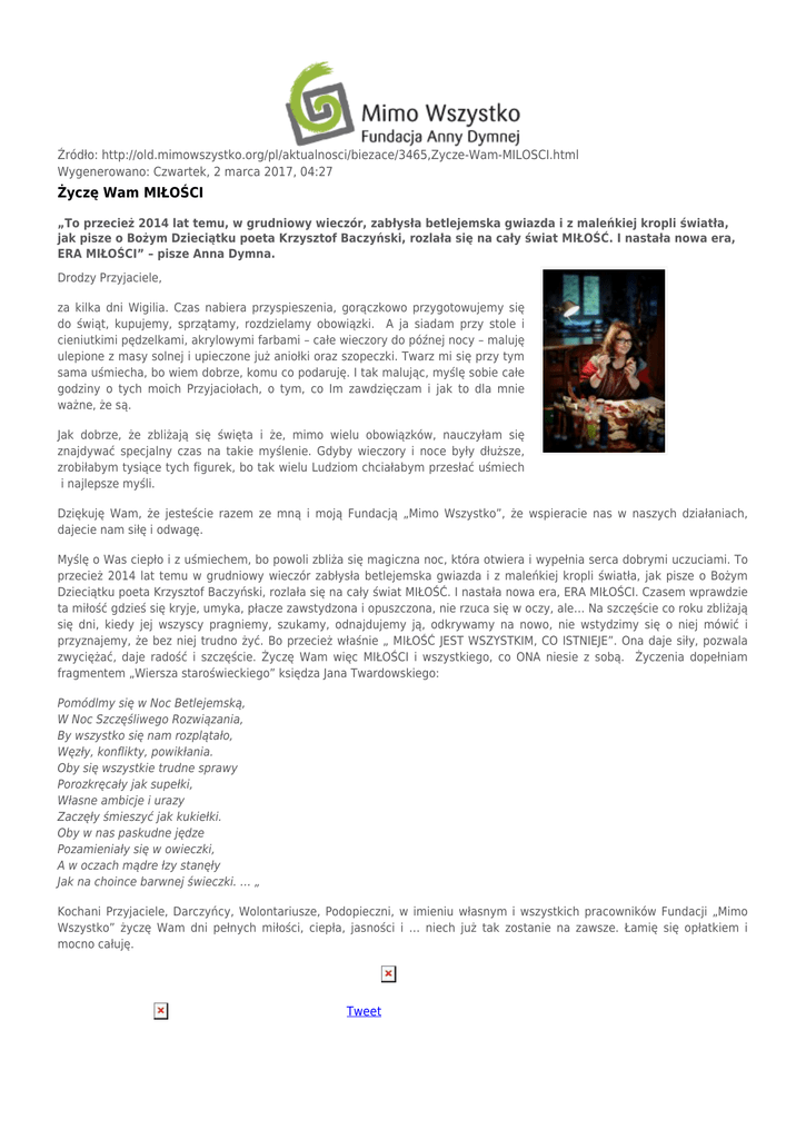 Źródło: http://old.mimowszystko.org/pl/aktualnosci/biezace/3465,Zycze-Wam-MILOSCI.html Wygenerowano: Czwartek, 2 marca 2017, 04:27 Życzę Wam MIŁOŚCI „To przecież 2014 lat temu, w grudniowy wieczór, zabłysła betlejemska gwiazda i z maleńkiej kropli światła, jak pisze o Bożym Dzieciątku poeta Krzysztof Baczyński, rozlała się na cały świat MIŁOŚĆ. I nastała nowa era, ERA MIŁOŚCI” – pisze Anna Dymna. Drodzy Przyjaciele, za kilka dni Wigilia. Czas nabiera przyspieszenia, gorączkowo przygotowujemy się do świąt, kupujemy, sprzątamy, rozdzielamy obowiązki. A ja siadam przy stole i cieniutkimi pędzelkami, akrylowymi farbami – całe wieczory do późnej nocy – maluję ulepione z masy solnej i upieczone już aniołki oraz szopeczki. Twarz mi się przy tym sama uśmiecha, bo wiem dobrze, komu co podaruję. I tak malując, myślę sobie całe godziny o tych moich Przyjaciołach, o tym, co Im zawdzięczam i jak to dla mnie ważne, że są. Jak dobrze, że zbliżają się święta i że, mimo wielu obowiązków, nauczyłam się znajdywać specjalny czas na takie myślenie. Gdyby wieczory i noce były dłuższe, zrobiłabym tysiące tych figurek, bo tak wielu Ludziom chciałabym przesłać uśmiech i najlepsze myśli. Dziękuję Wam, że jesteście razem ze mną i moją Fundacją „Mimo Wszystko”, że wspieracie nas w naszych działaniach, dajecie nam siłę i odwagę. Myślę o Was ciepło i z uśmiechem, bo powoli zbliża się magiczna noc, która otwiera i wypełnia serca dobrymi uczuciami. To przecież 2014 lat temu w grudniowy wieczór zabłysła betlejemska gwiazda i z maleńkiej kropli światła, jak pisze o Bożym Dzieciątku poeta Krzysztof Baczyński, rozlała się na cały świat MIŁOŚĆ. I nastała nowa era, ERA MIŁOŚCI. Czasem wprawdzie ta miłość gdzieś się kryje, umyka, płacze zawstydzona i opuszczona, nie rzuca się w oczy, ale… Na szczęście co roku zbliżają się dni, kiedy jej wszyscy pragniemy, szukamy, odnajdujemy ją, odkrywamy na nowo, nie wstydzimy się o niej mówić i przyznajemy, że bez niej trudno żyć. Bo przecież właśnie „ MIŁOŚĆ JEST WSZYSTKIM, CO ISTNIEJE”. Ona daje siły, pozwala zwyciężać, daje radość i szczęście. Życzę Wam więc MIŁOŚCI i wszystkiego, co ONA niesie z sobą. Życzenia dopełniam fragmentem „Wiersza staroświeckiego” księdza Jana Twardowskiego: Pomódlmy się w Noc Betlejemską, W Noc Szczęśliwego Rozwiązania, By wszystko się nam rozplątało, Węzły, konflikty, powikłania. Oby się wszystkie trudne sprawy Porozkręcały jak supełki, Własne ambicje i urazy Zaczęły śmieszyć jak kukiełki. Oby w nas paskudne jędze Pozamieniały się w owieczki, A w oczach mądre łzy stanęły Jak na choince barwnej świeczki. … „ Kochani Przyjaciele, Darczyńcy, Wolontariusze, Podopieczni, w imieniu własnym i wszystkich pracowników Fundacji „Mimo Wszystko” życzę Wam dni pełnych miłości, ciepła, jasności i … niech już tak zostanie na zawsze. Łamię się opłatkiem i mocno całuję. Tweet
