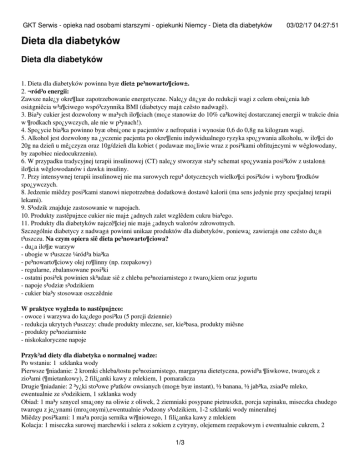 GKT Serwis - opieka nad osobami starszymi - opiekunki Niemcy - Dieta dla diabetyków 03/02/17 04:27:51 Dieta dla diabetyków Dieta dla diabetyków 1. Dieta dla diabetyków powinna byæ diet± pe³nowarto¶ciow±. 2. ¬ród³o energii: Zawsze nale¿y okre¶laæ zapotrzebowanie energetyczne. Nale¿y d±¿yæ do redukcji wagi z celem obni¿enia lub osi±gniêcia w³a¶ciwego wspó³czynnika BMI (diabetycy maj± czêsto nadwagê). 3. Bia³y cukier jest dozwolony w ma³ych ilo¶ciach (mo¿e stanowiæ do 10% ca³kowitej dostarczanej energii w trakcie dnia w ¶rodkach spo¿ywczych, ale nie w p³ynach!). 4. Spo¿ycie bia³ka powinno byæ obni¿one u pacjentów z nefropati± i wynosiæ 0,6 do 0,8g na kilogram wagi. 5. Alkohol jest dozwolony na ¿yczenie pacjenta po okre¶leniu indywidualnego ryzyka spo¿ywania alkoholu, w ilo¶ci do 20g na dzieñ u mê¿czyzn oraz 10g/dzieñ dla kobiet ( podawaæ mo¿liwie wraz z posi³kami obfituj±cymi w wêglowodany, by zapobiec niedocukrzeniu). 6. W przypadku tradycyjnej terapii insulinowej (CT) nale¿y stworzyæ sta³y schemat spo¿ywania posi³ków z ustalon± ilo¶ci± wêglowodanów i dawk± insuliny. 7. Przy intensywnej terapii insulinowej nie ma surowych regu³ dotycz±cych wielko¶ci posi³ków i wyboru ¶rodków spo¿ywczych. 8. Jedzenie miêdzy posi³kami stanowi niepotrzebn± dodatkow± dostawê kalorii (ma sens jedynie przy specjalnej terapii lekami). 9. S³odzik znajduje zastosowanie w napojach. 10. Produkty zastêpuj±ce cukier nie maj± ¿adnych zalet wzglêdem cukru bia³ego. 11. Produkty dla diabetyków najczê¶ciej nie maj± ¿adnych walorów zdrowotnych. Szczególnie diabetycy z nadwag± powinni unikaæ produktów dla diabetyków, poniewa¿ zawieraj± one czêsto du¿± t³uszczu. Na czym opiera siê dieta pe³nowarto¶ciowa? - du¿a ilo¶æ warzyw - ubogie w t³uszcze ¼ród³a bia³ka - pe³nowarto¶ciowy olej ro¶linny (np. rzepakowy) - regularne, zbalansowane posi³ki - ostatni posi³ek powinien sk³adaæ siê z chleba pe³noziarnistego z twaro¿kiem oraz jogurtu - napoje s³odziæ s³odzikiem - cukier bia³y stosowaæ oszczêdnie W praktyce wygl±da to nastêpuj±co: - owoce i warzywa do ka¿dego posi³ku (5 porcji dziennie) - redukcja ukrytych t³uszczy: chude produkty mleczne, ser, kie³basa, produkty miêsne - produkty pe³noziarniste - niskokaloryczne napoje Przyk³ad diety dla diabetyka o normalnej wadze: Po wstaniu: 1 szklanka wody Pierwsze ¶niadanie: 2 kromki chleba/tostu pe³noziarnistego, margaryna dietetyczna, powid³a ¶liwkowe, twaro¿ek z zio³ami (¶mietankowy), 2 fili¿anki kawy z mlekiem, 1 pomarañcza Drugie ¶niadanie: 2 ³y¿ki sto³owe p³atków owsianych (mog± byæ instant), ½ banana, ½ jab³ka, zsiad³e mleko, ewentualnie ze s³odzikiem, 1 szklanka wody Obiad: 1 ma³y sznycel sma¿ony na oliwie z oliwek, 2 ziemniaki posypane pietruszk±, porcja szpinaku, miseczka chudego twarogu z je¿ynami (mro¿onymi),ewentualnie s³odzony s³odzikiem, 1-2 szklanki wody mineralnej Miêdzy posi³kami: 1 ma³a porcja sernika wi¶niowego, 1 fili¿anka kawy z mlekiem Kolacja: 1 miseczka surowej marchewki i selera z sokiem z cytryny, olejemem rzepakowym i ewentualnie cukrem, 2 1/3 GKT Serwis - opieka nad osobami starszymi - opiekunki Niemcy - Dieta dla diabetyków 03/02/17 04:27:51 kromki chleba pe³noziarnistego, margaryna dietetyczna, 1 plaster edamera (30% w suchej masie), 1 kromka chudej szynki wieprzowej, 2 fili¿anki herbaty zio³owej Wieczorny posi³ek: 1 szklanka wody, pó³ kromki chleba pe³noziarnistego z serkiem zio³owym Przyczyny niedo¿ywienia u osób w starszym wieku: - brak apetytu - problemy z prze¿uwaniem i po³ykaniem - zaburzenia trawienia - ostre lub chroniczne choroby - obni¿enie sprawno¶ci fizycznej lub mentalnej - czynniki spo³eczne ( np. osamotnienie, ¶mieræ ma³¿onka) - nieprawid³owo dozowane ¶rodki uspokajaj±ce lub nasenne - spowolniona przemiana materii, zmniejszenie masy miê¶niowej, spadek aktywno¶ci fizycznej, a co za tym idzie spadek zapotrzebowania energetycznego. Zalecane pokrycie zapotrzebowania na witaminy i minera³y pozostaj± jednak bez zmian, co wiêcej wzrasta zapotrzebowanie na witaminê D, tzn. w mniejszej masie ¶rodków spo¿ywczych musi znajdowaæ siê wiêcej minera³ów i witamin. Nale¿y spo¿ywaæ produkty o du¿ej warto¶ci od¿ywczej. Najwa¿niejsze mikroelementy dla osób w zaawansowanym wieku to witamina D, B12 i folacyna. - Zdolno¶æ odczuwania pragnienia os³abia siê, co dzia³a negatywnie na funkcje mózgu, nerek i serca: seniorzy powinni piæ min.1,5 litra dziennie, warto poleciæ równie¿ produkty bogate w wodê (melony, pomidory, ogórki) oraz zupy. W przypadku seniorów z podwy¿szonym ryzykiem niedo¿ywienia warto zwróciæ uwagê na: - komunikacjê miêdzy opiekunem, pielêgniarzami, rodzin± i lekarzami - kontrolê wagi - przygotowywanie zestawieñ spo¿ytych potraw i napojów, identyfikacjê zahamowañ w jedzeniu i piciu – przy niskim spo¿yciu po¿ywienia zachowaæ efektywne ¶rodki dietetyczne Warto¶ci minimalne dla seniorów na dzieñ: Codziennie: 1 ciep³y posi³ek, 1 porcja owoców, 1 porcja warzyw lub sa³atek, 1 szklanka mleka i jogurtu, ser albo twaro¿ek, kromka chleba pe³noziarnistego albo z pe³nego przemia³u, 1 litr p³ynów (soki owocowe, woda mineralna, zupa, herbata, kawa), 1 kawa³ek miêsa, ryba lub jajka. Jak przekuæ zalecenia w dzia³anie? - stosowanie ró¿nych przypraw i zió³, aby dodaæ potrawom smaku - pobudzaj±ce apetyt przystawki lub napoje - elementy pomagaj±ce w piciu lub jedzeniu (s³omki, smoczki etc.) - mi³a atmosfera - unikanie rozpraszaj±cych czynników - przek±ski (z.B. ma³e kotleciki, chlebki ry¿owe) - osobom niespokojnym, zapominaj±cym mo¿na zaoferowaæ spo¿ycie posi³ku poza sto³em - jedzenie powinno byæ podzielone na porcje na jeden, dwa gryzy - konsystencja po¿ywienia powinna byæ ³atwa zarówno do prze¿uwania, jak i po³ykania - mo¿na wzbogaciæ napoje i potrawy suplementami; sporz±dzaæ