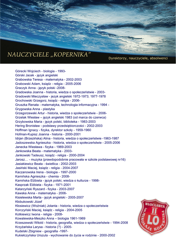 NAUCZYCIELE „KOPERNIKA” Dyrektorzy, nauczyciele, absolwenci Górecki Wojciech - biologia - 1993Górski Jacek - język angielski Grabowska Teresa - matematyka - 2002-2003 Grabowski Adam, ksiądz - religia - 2005-2006 Graczyk Anna - język polski -2008Gradowska Joanna - historia, wiedza o społeczeństwie - 2003Gradowski Mieczysław - jezyk angielski 1972-1973; 1977-1978 Grochowski Grzegorz, ksiądz - religia - 2006Gruszka Renata - matematyka, technologia informacyjna - 1994 Grygowska Anna - plastyka Grzegorzewski Artur - historia, wiedza o społeczeństwie - 2006Grzelak Wiesław – język angielski 1983 (od marca do czerwca) Grzybowska Maria - język polski, biblioteka - 1983-2003 Hering Bronisław - podstawy przedsiębiorczości - 2002-2003 Hoffman Ignacy - fizyka, dyrektor szkoły - 1959-1960 Hofman-Kupisz Joanna - historia - 2000-2001 Idrjan (Brzezińska) Alina - historia, wiedza o społeczeństwie -1963-1987 Jadoszewska Agnieszka - historia, wiedza o społeczeństwie - 2005-2006 Janecka Wiesława - fizyka - 1969-2003 Jankowska Beata - matematyka - 2003Jankowski Tadeusz, ksiądz - religia - 2000-2004 Jarosz… - muzyka (prawdopodobnie pracowała w szkole podstawowej nr16) Jasiakiewicz Beata - świetlica - 2002-2003 Jasiński Maciej, ksiądz - religia - 2004-2007 Kaczanowska Irena - biologia - 1997-2000 Kamińska Agnieszka - chemia - 2008Kamińska Elżbieta - język polski, wiedza o kulturze - 1998Kasprzak Elżbieta - fizyka - 1971-2001 Katarzyński Ryszard - fizyka - 2003-2007 Kawska Anna - matematyka - 2006Kisielewska Marta - język angielski - 2005-2007 Kłobukowski Józef Kłosiewicz (Woźniak) Jolanta - historia, wiedza o społeczeństwie Korczyński Maciej, ksiądz - religia - 2004-2005 Kotkiewicz Iwona - religia - 2008Kowalewska-Meszko Anna – biologia 1961-1969 Krzeszewski Witold - historia, geografia, wiedza o społeczeństwie - 1994-2008 Krzyżańska Larysa - historia (?) - 2005Kudelski Zbigniew - geografia -1997Kukiełczyńska Urszula - wychowanie do życia w rodzinie - 2000-2002