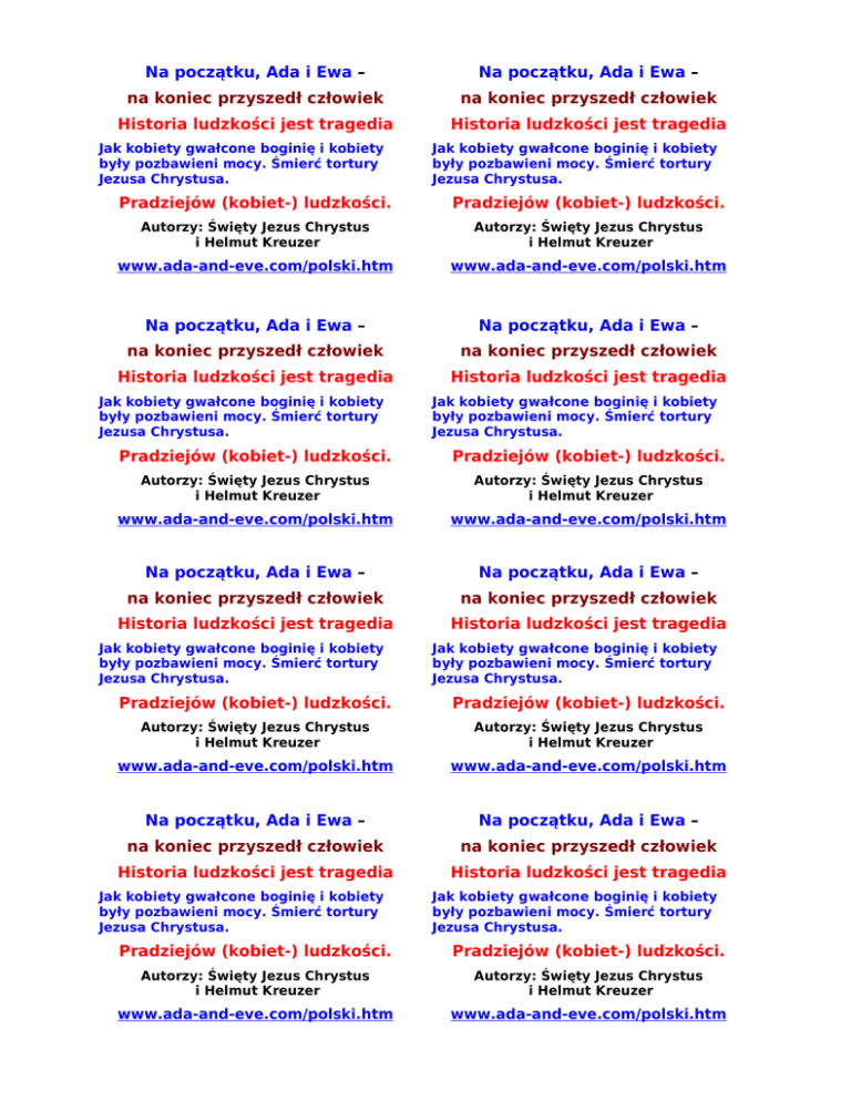 Na początku, Ada i Ewa – Na początku, Ada i Ewa – na koniec przyszedł człowiek na koniec przyszedł człowiek Historia ludzkości jest tragedia Historia ludzkości jest tragedia Jak kobiety gwałcone boginię i kobiety były pozbawieni mocy. Śmierć tortury Jezusa Chrystusa. Jak kobiety gwałcone boginię i kobiety były pozbawieni mocy. Śmierć tortury Jezusa Chrystusa. Pradziejów (kobiet-) ludzkości. Pradziejów (kobiet-) ludzkości. Autorzy: Święty Jezus Chrystus i Helmut Kreuzer Autorzy: Święty Jezus Chrystus i Helmut Kreuzer www.ada-and-eve.com/polski.htm www.ada-and-eve.com/polski.htm Na początku, Ada i Ewa – Na początku, Ada i Ewa – na koniec przyszedł człowiek na koniec przyszedł człowiek Historia ludzkości jest tragedia Historia ludzkości jest tragedia Jak kobiety gwałcone boginię i kobiety były pozbawieni mocy. Śmierć tortury Jezusa Chrystusa. Jak kobiety gwałcone boginię i kobiety były pozbawieni mocy. Śmierć tortury Jezusa Chrystusa. Pradziejów (kobiet-) ludzkości. Pradziejów (kobiet-) ludzkości. Autorzy: Święty Jezus Chrystus i Helmut Kreuzer Autorzy: Święty Jezus Chrystus i Helmut Kreuzer www.ada-and-eve.com/polski.htm www.ada-and-eve.com/polski.htm Na początku, Ada i Ewa – Na początku, Ada i Ewa – na koniec przyszedł człowiek na koniec przyszedł człowiek Historia ludzkości jest tragedia Historia ludzkości jest tragedia Jak kobiety gwałcone boginię i kobiety były pozbawieni mocy. Śmierć tortury Jezusa Chrystusa. Jak kobiety gwałcone boginię i kobiety były pozbawieni mocy. Śmierć tortury Jezusa Chrystusa. Pradziejów (kobiet-) ludzkości. Pradziejów (kobiet-) ludzkości. Autorzy: Święty Jezus Chrystus i Helmut Kreuzer Autorzy: Święty Jezus Chrystus i Helmut Kreuzer www.ada-and-eve.com/polski.htm www.ada-and-eve.com/polski.htm Na początku, Ada i Ewa – Na początku, Ada i Ewa – na koniec przyszedł człowiek na koniec przyszedł człowiek Historia ludzkości jest tragedia Historia ludzkości jest tragedia Jak kobiety gwałcone boginię i kobiety były pozbawieni mocy. Śmierć tortury Jezusa Chrystusa. Jak kobiety gwałcone boginię i kobiety były pozbawieni mocy. Śmierć tortury Jezusa Chrystusa. Pradziejów (kobiet-) ludzkości. Pradziejów (kobiet-) ludzkości. Autorzy: Święty Jezus Chrystus i Helmut Kreuzer Autorzy: Święty Jezus Chrystus i Helmut Kreuzer www.ada-and-eve.com/polski.htm www.ada-and-eve.com/polski.htm