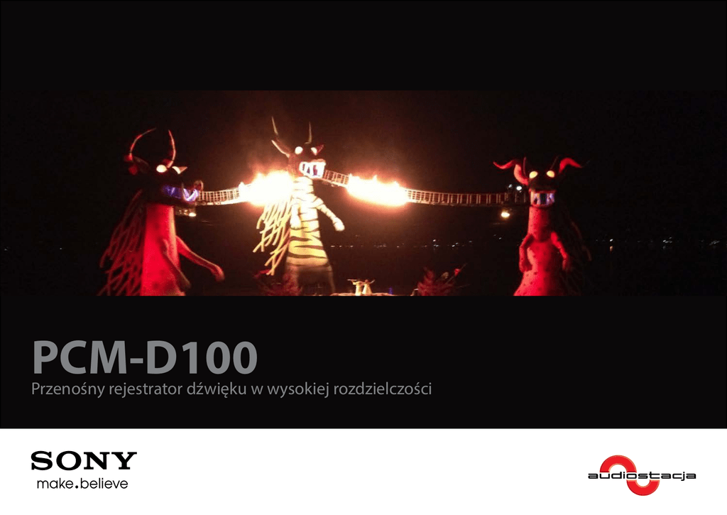 PCM-D100 Przenośny rejestrator dźwięku w wysokiej rozdzielczości PCM-D100 Przenośny, profesjonalny rejestrator audio do nagrywania wystąpień na żywo, koncertów muzycznych lub przedstawień teatralnych SONY PCM-D100 to jeden z produktów z nowej serii Sony High-Resolution Audio, stworzonych dla miłośników muzyki, którzy teraz w łatwy sposób mogą cieszyć się ulubionymi dźwiękami nagrywanymi i odtwarzanymi w najwyższej jakości. Skuteczne, przenośne nagrywanie dźwięku w wysokiej rozdzielczości Sony PCM-D100 to zapewniający najwyższej klasy brzmienie profesjonalny rejestrator audio. Przeznaczony jest do nagrywania wystąpień na żywo, koncertów muzycznych, przedstawień teatralnych itp. Rejestrator obsługuje najnowsze kodeki i formaty nagrywania dźwięku w wysokiej rozdzielczości, takie jak PCM 192 kHz/24 bity i DSD. Obsługa formatu DSD umożliwia rejestrację sygnałów w postaci cyfrowej, ale o charakterze bardzo przypominającym sygnał analogowy. Urządzenie nagrywa i odtwarza dźwięki w liniowym formacie PCM 192 kHz/24-bity oraz doskonale odwzorowuje najsubtelniejsze szczegóły każdego nagrania w pełnym zakresie pasma, od tonów najniższych do najwyższych. Pasmo przenoszenia w przypadku odtwarzania mieści się w przedziale od 20 Hz do 25 kHz, co przekracza zakres dźwięków słyszanych przez człowieka. Rejestrator wyposażono w parę niezwykle czułych, 15 mm mikrofonów kierunkowych. Szerokość obrazu dźwiękowego dla zestawu mikrofonowego można w łatwy sposób dopasować pod kątem nagrywanych dźwięków. Można nagrywać zarówno występy małych grup, a także dźwięk w sali koncertowej z dużą ilością wykonawców. Niezwykła czułość i zdolność rejestracji w szerokim paśmie, nawet do częstotliwości 40 kHz to dodatkowe zalety nagrywania w formacie DSD. Rejestrator PCM-D100 posiada wbudowaną pamięć flash 32 GB, a także wejście do podłączenia zewnętrznych nośników pamięci i karty SD. Lekka obudowa z aluminium jest bardzo wytrzymała i z powodzeniem sprawdzi się w trakcie profesjonalnego użytkowania. Zasilany za pomocą czterech baterii typu AA rejestrator cechuje się długim czasem pracy na bateriach. W trybie DSD (2.8 MHz/1-bit) czas ten wynosi nawet do ok. 11 godzin. Najważniejsze funkcje Nagrywanie w wysokiej rozdzielczości Obsługiwane formaty nagrywania - DSD2.8, LPCM (do 192 kHz/24 bit) oraz MP3. Wbudowane elektretowe mikrofony pojemnościowe Zamontowane w PCM-D100 elektretowe mikrofony pojemnościowe zapewniają najwyższej klasy brzmienie. Mikrofony kierunkowe można ustawić w konfiguracji X/Y albo w szerokim stereo. Cechuje je wyrównane, szerokie pasmo przenoszenia oraz naturalne brzmienie. Wygodne funkcje odtwarzania PCM-D100 wyposażono w funkcje kontroli wysokości dźwięku oraz tonacji dla nagrań w formatach LPCM i MP3. Cyfrowy układ kontroli pitch pozwala zachować właściwą wysokość dźwięku przy zwolnieniu lub przyspieszeniu prędkości odtwarzania. Regulacja Key umożliwia zmianę wysokości dźwięków przy zachowaniu jednakowej prędkości odtwarzania. Łatwe przenoszenie plików do komputera Rejestrator posiada port USB 2.0 typu high-speed, dzięki czemu w łatwy sposób można przenosić pliki do/i z komputerów PC z systemem Windows® bądź typu Macintosh®. Ciekawe funkcje nagrywania PCM-D100 zapewnia wszechstronne funkcje przetwarzania nagrywanego sygnału, w tym limiter i filtr dolno-zaporowy. W modelu PCM-D100 posiada także funkcje 5-sekundowego bufora i nagrywania na różnych nośnikach pamięci. Parametry techniczne Obsługiwane formaty dźwięku: Nagrywanie - DSD, WAV i MP3; Odtwarzanie - DSD, WAV, FLAC, MP3, WMA [Non DRM], AAC-LC [Non-DRM] Wbudowane mikrofony: Pojemnościowe mikrofony elektretowe. Maksymalny poziom wejściowy: 128 dB SPL. Pasmo przenoszenia: 20 Hz - 20 kHz Wejście mikrofonowe: Stereo mini jack, impedancja wejściowa: 22 kOm, szacunkowy poziom wejściowy: 2.5 mV; minimalny poziom wejściowy: 0.7 mV Wejście liniowe [analogowe]: Stereo mini jack. impedancja wejściowa: 22 kOm; minimalny poziom wejściowy: 450 mV; szacunkowy poziom wejściowy: 2.0 V Wejście liniowe [optyczne]: Optyczne wejście cyfrowe, poziom wejściowy: od -27 dBm do -14 dBm; długość fali emisji: 660 nm Wyjście liniowe [analogowe]: Impedancja wyjściowa: 220 Om; poziom wyjściowy: 1.7 V; impedancja obciążenia 22 kOm Wyjście liniowe [optyczne]: Poziom wyjściowy od -21dBm do -15 dBm Wyjście słuchawkowe: Stereo mini jack; maksymalny wyjściowy poziom: 25 mW + 25 mW lub więcej; impedancja obciążenia: 16 Ω Pasmo przenoszenia: 20 Hz - 50 kHz [wejście liniowe] przy formacie DSD2.8; 20 Hz - 45 kHz [wejście liniowe] przy LPCM 192 kHz/24 bity Parametry techniczne Częstotliwość próbkowania: DSD 2.8 MHz; LPCM 192 kHz/176.4 kHz/96 kHz/88.2 kHz/48 kHz/44.1 kHz Kwantyzacja: 16-bitów LPCM, 24-bity PCM i 1-bit DSD Odstęp sygnału od szumu: DSD 98 dB lub więcej; LPCM 24 bity 96 dB lub więcej Zniekształcenia THD [od wejścia liniowego do wyjścia liniowego]: DSD: 0.008% lub poniżej [1 kHz, 22 kHz LPF], LPCM: 0.006% lub poniżej [1 kHz, 22 kHz LPF] Inne zniekształcenia [wow i flutter]: Poniżej mierzalnego poziomu [mniej niż +/-0.001%]. USB: High-speed USB 2, obsługa protokołu MSC [mass storage class] Pobór mocy: 0.75 W Zasilanie: Cztery baterie alkaliczne AA [w komplecie]. Cztery akumulatorki NiMH AA [opcjonalnie] Wejście zasilania: DC: 6 V Żywotność baterii: 25 godz. przy 44.1 kHz/16 bit; 18 godz. przy 192 kHz/24 bit lub 12 godz. przy DSD2.8 Wejście dla zewnętrznych nośników danych: Akceptuje formaty SD, SD-HC,SD-XC, Memory Stick Pro Duo i Memory Stick Pro-HG Wymiary (mm): 47.6 x 155.6 x 31.7, bez wystających części i kontrolerów Waga: 394 g [z bateriami] Akcesoria W zestawie: Oprogramowanie Sound Forge Audio Studio LE Przewód USB Miękki pokrowiec Osłona przeciwwietrzna Bezprzewodowy pilot do zdalnego sterowania Opcjonalne: PCM-D100 obsługuje nośniki danyc