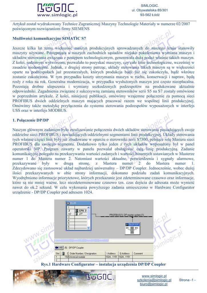 SIMLOGIC. ul. Obywatelska 85/301 93-562 Łódź Artykuł został wydrukowany Technice Zagranicznej Maszyny Technologie Materiały w numerze 02/2007 poświęconym rozwiązaniom firmy SIEMENS Możliwości komunikacyjne SIMATIC S7 Jeszcze kilka lat temu większość maszyn produkcyjnych sprowadzanych do naszego kraju stanowiły maszyny używane. Postępująca u naszych zachodnich sąsiadów niejako pokoleniowa wymiana maszyn i układów sterowania związana z postępem technologicznym, generowała dużą podaż właśnie takich maszyn. Z kolei, rodzimym wytwórcom, pozwalało to pozyskać maszyny, czy całe linie technologiczne, wcześniej w zasadzie niedostępne. Jednak, z drugiej strony patrząc, układy sterowania takich maszyn są w większości oparte na podzespołach już przestarzałych, których produkcja bądź już się zakończyła, bądź wkrótce zostanie zakończona. W tym przypadku koszty utrzymania maszyn w ruchu, konserwacji i napraw, będą rosły z roku na rok. Generalna modernizacja, w przypadku wysłużonych maszyn jest często nieopłacalna. Pozostają drobne ulepszenia i wymiany uszkodzonych podzespołów na produkowane aktualnie odpowiedniki. Zagadnienia związane z sukcesywną zamianą sterowników serii S5 na S7 zostały omówione w poprzednim artykule. Z kolei, niniejszej publikacji, omówimy wzajemne połączenie za pomocą sieci PROFIBUS dwóch oddzielnych maszyn mających pracować razem we wspólnej linii produkcyjnej. Omówimy także metodykę przyłączenia do systemu sterowania podzespołów wyposażonych w interfejs USS oraz w interfejs MODBUS. 1. Połączenie DP/DP Naszym głównym zadaniem było zrealizowanie połączenia dwóch układów sterowania posiadających swoje oddzielne sieci PROFIBUS i zawiadujących oddzielnymi segmentami linii produkcyjnej. Układy sterowania tych właśnie części linii były już zbudowane w oparciu o sterowniki serii S7300, pełniące rolę Mastera sieci PROFIBUS dla swojego segmentu. Dodatkowo tylko jeden z tych układów wyposażony był w panel operatorski MP. Program zawarty w panelu pozwalał obsługiwać całą linię produkcyjną. Zadanie komunikacyjne polegało na przekazywaniu wartości zadanych i wartości binarnych ustawianych w Masterze numer 1 do Mastera numer 2. Natomiast wartości aktualne, potwierdzenia i sygnały alarmowe, przekazywane były w drugą stronę, z Mastera numer 2 do Mastera numer 1. Zdecydowano się zastosować układ najbardziej uniwersalny – DP/DP Coupler. Jednocześnie, wobec dużej ilości przekazywanych w obie strony informacji, dokonano podziału zadań komunikacyjnych. Wyodrębniono informacje priorytetowe, których przekazanie jest zdeterminowane czasowo oraz informacje, które są nie mniej ważne, lecz niezdeterminowane czasowo tzn. czas dojścia do adresata może wynieść nawet do ok.2 sekund. W celu wykonania powyższego zadania umieszczono w Hardware Configurator urządzenie - DP/DP Coupler pod adresem 1024. Rys.1 Hardware Configurator – instalacja urządzenia DP/DP Coupler www.simlogic.pl [email protected] [email protected] Strona -1 - SIMLOGIC. ul. Obywatelska 85/301 93-562 Łódź Cały obszar zajęty przez DP/DP Coupler można wykorzystywać do wymiany danych. Daje to łącznie (1151 – 1024 +1) = 128 bajtów czyli 64 słowa. Urządzenie DP/DP Coupler przepisuje obszar wejściowy PI jednej sieci na obszar wyjściowy PQ drugiej sieci oraz obszary PI drugiej na PQ pierwszej, zachowując odpowiednią kolejność bajtów o tych samych numerach. Zatem wpisując daną do n-tego słowa PQW jednej sieci, możemy ją odczytać za pośrednictwem n-tego słowa PIW drugiej sieci. W omawianym przykładzie, z uwagi na przyjętą hierarchiczność danych, 52 słowa (obszary od 1024 do 1127) są przeznaczone do obsługi transmisji synchronicznej. W obszarze tym kolejne słowa mają określone znaczenie i ich wartości aktualne są zapisywane i odczytywane komendami Load i Transfer w każdym przejściu głównego bloku programowego OB1. Pozostałe 12 słów zostało wykorzystanych do transmisji asynchronicznej, przy czym ostatnie 8 słów tworzy bufor przesyłania i odbioru danych. 53 x+ 104.0 54 x+ 106.0 55 x+ 108.0 56 x+ 110.0 57 x+ 112.0 58 x+ 114.0 59 x+ 116.0 60 x+ 118.0 61 x+ 120.0 62 x+ 122.0 63 x+ 124.0 64 x+ 126.0 INT "ComRespond_DataRecieve"/"ComRespond_DataWrite" INT "ComRespond_DataRecieve"/"ComRespond_DataWrite" INT "ComRespond_DataSend"/"ComRespond_DataRead" INT "ComRespond_DataSend"/"ComRespond_DataRead" INT Data channel to exchange data packages for "DataRecieve" /"DataWrite" asynchron comunication INT Data channel to exchange data packages for "DataRecieve" /"DataWrite" asynchron comunication INT Data channel to exchange data packages for "DataRecieve" /"DataWrite" asynchron comunication INT Data channel to exchange data packages for "DataRecieve" /"DataWrite" asynchron comunication INT Data channel to exchange data packages for "DataRecieve" /"DataWrite" asynchron comunication INT Data channel to exchange data packages for "DataRecieve" /"DataWrite" asynchron comunication INT Data channel to exchange data packages for "DataRecieve" /"DataWrite" asynchron comunication INT Data channel to exchange data packages for "DataRecieve" /"DataWrite" asynchron comunication Rys.2 Obszar obsługi transmisji asynchronicznej Dane, które zamierzamy przesłać do drugiego Mastera, gromadzimy w bloku DB_Data. Obszar adresowy tego bloku dzielimy na „paczki” danych o długości 8 słów. Paczki te będą przesyłane kolejno przez bufor PIW/PQW w obszarach 1136 – 1151, tj. o długości 16 bajtów. Adres początku obszaru zajmowanego przez każdą paczkę i długości paczek są zapisane w bloku DB_ComDP. Kolejne słowa tego bloku uporządkowane są następująco: adres pierwszej paczki, długość pierwszej paczki, adres drugiej paczki, długość drugiej paczki itd. Zatem adresy i długości kolejnych paczek zapisane są pod kolejnymi adresami bloku danych DB_ComDP, tj. co cztery