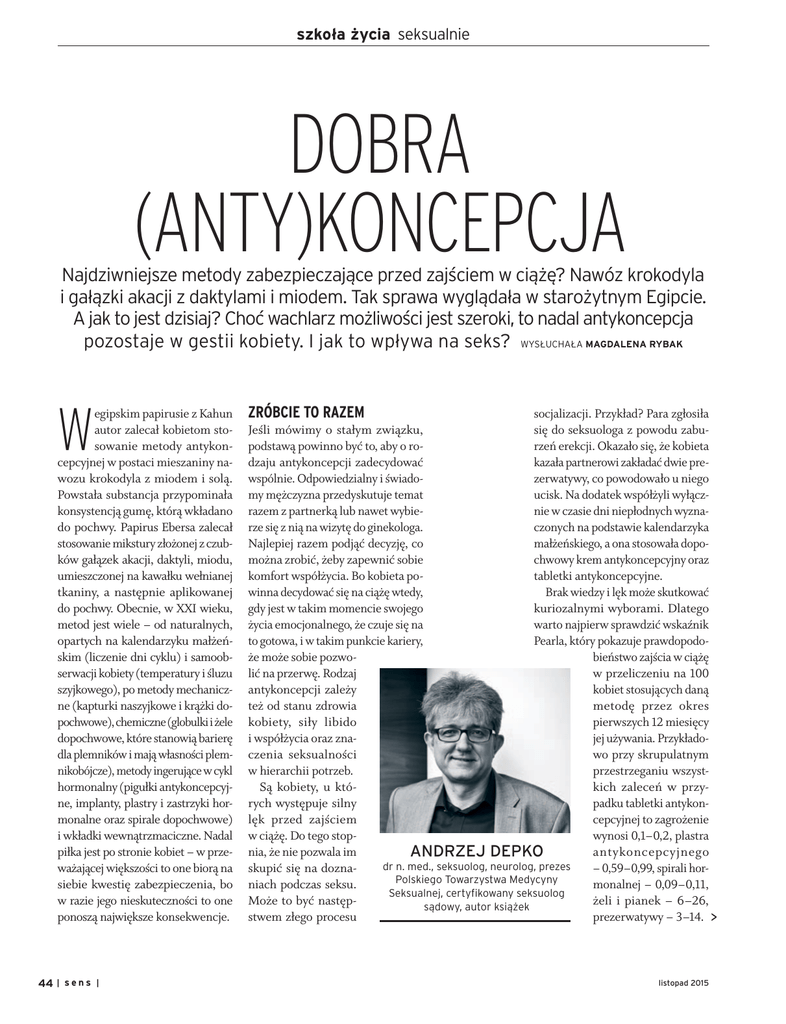 szkoła życia seksualnie Dobra (anty)koncepcja Najdziwniejsze metody zabezpieczające przed zajściem w ciążę? Nawóz krokodyla i gałązki akacji z daktylami i miodem. Tak sprawa wyglądała w starożytnym Egipcie. A jak to jest dzisiaj? Choć wachlarz możliwości jest szeroki, to nadal antykoncepcja pozostaje w gestii kobiety. I jak to wpływa na seks? wysłuchała Magdalena Rybak W egipskim papirusie z Kahun autor zalecał kobietom stosowanie metody antykoncepcyjnej w postaci mieszaniny nawozu krokodyla z miodem i solą. Powstała substancja przypominała konsystencją gumę, którą wkładano do pochwy. Papirus Ebersa zalecał stosowanie mikstury złożonej z czubków gałązek akacji, daktyli, miodu, umieszczonej na kawałku wełnianej tkaniny, a następnie aplikowanej do pochwy. Obecnie, w XXI wieku, metod jest wiele – od naturalnych, opartych na kalendarzyku małżeńskim (liczenie dni cyklu) i samoobserwacji kobiety (temperatury i śluzu szyjkowego), po metody mechaniczne (kapturki naszyjkowe i krążki dopochwowe), chemiczne (globulki i żele dopochwowe, które stanowią barierę dla plemników i mają własności plemnikobójcze), metody ingerujące w cykl hormonalny (pigułki antykoncepcyjne, implanty, plastry i zastrzyki hormonalne oraz spirale dopochwowe) i wkładki wewnątrzmaciczne. Nadal piłka jest po stronie kobiet – w przeważającej większości to one biorą na siebie kwestię zabezpieczenia, bo w razie jego nieskuteczności to one ponoszą największe konsekwencje. 44 | sens | Zróbcie to razem socjalizacji. Przykład? Para zgłosiła Jeśli mówimy o stałym związku, się do seksuologa z powodu zabupodstawą powinno być to, aby o rorzeń erekcji. Okazało się, że kobieta dzaju antykoncepcji zadecydować kazała partnerowi zakładać dwie prewspólnie. Odpowiedzialny i świadozerwatywy, co powodowało u niego my mężczyzna przedyskutuje temat ucisk. Na dodatek współżyli wyłączrazem z partnerką lub nawet wybienie w czasie dni niepłodnych wyznarze się z nią na wizytę do ginekologa. czonych na podstawie kalendarzyka Najlepiej razem podjąć decyzję, co małżeńskiego, a ona stosowała dopomożna zrobić, żeby zapewnić sobie chwowy krem antykoncepcyjny oraz komfort współżycia. Bo kobieta potabletki antykoncepcyjne. winna decydować się na ciążę wtedy, Brak wiedzy i lęk może skutkować gdy jest w takim momencie swojego kuriozalnymi wyborami. Dlatego życia emocjonalnego, że czuje się na warto najpierw sprawdzić wskaźnik to gotowa, i w takim punkcie kariery, Pearla, który pokazuje prawdopodoże może sobie pozwobieństwo zajścia w ciążę lić na przerwę. Rodzaj w przeliczeniu na 100 antykoncepcji zależy kobiet stosujących daną też od stanu zdrowia metodę przez okres kobiety, siły libido pierwszych 12 miesięcy i współżycia oraz znajej używania. Przykładoczenia seksualności wo przy skrupulatnym w hierarchii potrzeb. przestrzeganiu wszystSą kobiety, u któkich zaleceń w przyrych występuje silny padku tabletki antykonlęk przed zajściem cepcyjnej to zagrożenie w ciążę. Do tego stopwynosi 0,1–0,2, plastra nia, że nie pozwala im antykoncepcyjnego andrzej depko dr n. med., seksuolog, neurolog, prezes skupić się na dozna– 0,59–0,99, spirali horPolskiego Towarzystwa Medycyny niach podczas seksu. monalnej – 0,09–0,11, Seksualnej, certyfikowany seksuolog Może to być następżeli i pianek – 6–26, sądowy, autor książek stwem złego procesu prezerwatywy – 3–14. listopad 2015 Skuteczność metody powinna być ważnym kryterium w podejmowaniu decyzji o jej wyborze. Równie ważnym czynnikiem powinno być jednak oczekiwanie kobiety i jej akceptacja dla danego sposobu. Metody mogą się zmieniać w zależności od stanu zdrowia, np.: kobieta po trzydziestce, paląca i z chorobą zakrzepową nie może już stosować tabletek, bo stanowią dla niej zagrożenie choroby zatorowej. Ale może zainstalować sobie spiralę wewnątrzmaciczną. W sytuacjach szczególnych, u kobiet po przebytych ciężkich chorobach, chorujących przewlekle lub obciążonych znacznym ryzykiem objawów ubocznych należy bardzo szczegółowo, razem z lekarzem rozważyć zastosowanie określonej metody antykoncepcji. Możliwości są, pozostaje kwestia przekonań. Dla wielu kobiet ich religijność jest nadrzędnym kryterium wyboru. A skoro Kościół zabrania stosowania antykoncepcji, to wierzącym pozostaje tylko ruletka. Okiem singielki A co z kobietami niebędącymi w stałych związkach? Jeżeli ich kontakty seksualne odbywają się rzadko 46 | sens | i niekoniecznie ze stałym partnerem, mogą zastanowić się nad stosowaniem metod łączonych – ona żel dopochwowy, on bezwzględnie prezerwatywę z uwagi na choroby przenoszone drogą płciową. Natomiast dla młodych kobiet aktywnych seksualnie oraz dla młodych matek idealnie nadają się tabletki antykoncepcyjne – dają pewność i, co ważne, istnieje możliwość odstawienia ich w dowolnym momencie. Po urodzeniu pierwszego dziecka (gdy macica się powiększy) kobieta może zastanowić się też nad założeniem wkładki wewnątrzmacicznej. Obie metody dają możliwość rezygnacji z nich w dowolnym momencie i odzyskania płodności. Kobiety nieplanujące więcej potomstwa mogą korzystać z tabletki antykoncepcyjnej i wkładki wewnątrzmacicznej. Możliwy jest też zabieg podwiązania jajowodów. Jest on jednak nieodwracalny. A co z mężczyznami? Jeżeli chodzi o efektywne i odwracalne metody antykoncepcji, to poza prezerwatywą mężczyźni nie mają jak na razie żadnej alternatywy. Stosowanie tej formy antykoncepcji nie dla każdego jednak jest optymalnym Warto przeczytać Anne Szarewski, John Guillebaud Przewodnik po antykoncepcji Wydawnictwo Prószyński i S-ka Warszawa 1999; Ana Martos Historia antykoncepcji Bellona S.A. Warszawa 2012 rozwiązaniem. Niektórzy uważają, że osłabia ona doznania albo rozprasza, powodując utratę podniecenia i wiotkość pr