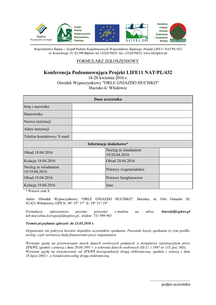 Województwo Śląskie – Zespół Parków Krajobrazowych Województwa Śląskiego; Projekt LIFE11 NAT/PL/432 ul. Krasickiego 25, 42-500 Będzin; tel. (32)2670423, fax. (32)2670422; www.lifezpkws.pl FORMULARZ ZGŁOSZENIOWY Konferencja Podsumowująca Projekt LIFE11 NAT/PL/432 18-20 kwietnia 2016 r. Ośrodek Wypoczynkowy "ORLE GNIAZDO HUCISKO" Hucisko k/ Włodowic Dane uczestnika Imię i nazwisko Stanowisko Nazwa instytucji Adres instytucji Telefon kontaktowy/ E-mail Informacje dodatkowe* Obiad 18.04.2016 Nocleg ze śniadaniem 19/20.04.2016 Kolacja 18.04.2016 Obiad 20.04.2016 Nocleg ze śniadaniem 18/19.04.2016 Potrawy wegetariańskie Obiad 19.04.2016 Potrawy bezglutenowe Kolacja 19.04.2016 Inne * Wstawić znak X. Adres: Ośrodek Wypoczynkowy "ORLE GNIAZDO HUCISKO", Hucisko, ul. Orle Gniazdo 20, 42-421 Włodowice, GPS N: 50° 35" 17" E: 19° 31" 19" Formularze zgłoszeniowe prosimy przesyłać e-mailem lub [email protected]., telefon: 731 999 965. na adres: [email protected] Termin przysyłania zgłoszeń: do 23.03.2016 r. Organizator nie pokrywa kosztów dojazdów uczestników spotkania. Pozostałe koszty spotkania (w tym posiłki, nocleg, część terenowa) będą finansowane przez organizatora. Wyrażam zgodę na przetwarzanie moich danych osobowych podanych w formularzu rejestracyjnym przez ZPKWŚ, zgodnie z ustawą z dnia 29.08.1997 r. o ochronie danych osobowych (Dz.U. z 1997 nr 133, poz. 883). Wyrażam zgodę na otrzymywanie od ZPKWŚ korespondencji drogą elektroniczną, zgodnie z ustawą z dnia 18 lipca 2002 r. o świadczeniu usług drogą elektroniczną. ........................................ podpis uczestnika