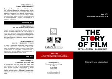 ODYSEJA FILMOWA 12. LATA 80.: PROTEST NA ŚWIECIE Czasy rządów Reagana w Białym Domu i Thatcher na Downing Street były okresem, gdy kino protestowało. To opowieść o tym, jak odważni filmowcy nie bali się głośno mówić prawdy. O amerykańskim kinie opowiada niezależny reżyser John Sayles, w Pekinie obserwujemy rozkwitającą chińską kinematografię, w Związku Radzieckim przeszłość powraca w znakomitych filmach, a w Polsce coraz głośniej jest o Krzysztofie Kieślowskim. kino REJS październik 2013 - maj 2014 kwiecień 2014 ODYSEJA FILMOWA 13. 1990-1998: OSTATNIE DNI CELULOIDU Niewielu potrafiło to przewidzieć, ale światowe kino weszło w swoją złotą erę właśnie w latach 90. Rzecz zaczyna się w Iranie, gdzie spotykamy Abbasa Kiarostamiego, który spojrzał na tworzenie filmu w zupełnie nowy sposób. Na drugim biegunie znajduje się kino japońskie, które stworzyło całkowicie nowe kino grozy. Z Tokio lecimy do Paryża, a na koniec odwiedzamy Meksyk . ODYSEJA FILMOWA 14. LATA 90.: POCZĄTEK EPOKI CYFROWEJ To historia o błyskotliwych, pełnych pasji filmach realizowanych przez anglojęzycznych twórców w latach 90. Przyglądamy się, co nowego dały kinu tarantinowskie dialogi i produkcje braci Coen. W Australii Baz Luhrmann opowiada o „Romeo i Julii” i „Moulin Rouge”, a potem zanurzamy się w cyfrowy świat, który odmienił kino na zawsze. maj 2014 ODYSEJA FILMOWA 15. PO ROKU 2000: PRZYSZŁOŚĆ KINA W ostatniej części „The Story of Film” kino zatacza pełne koło. Z jednej strony staje się poważniejsze po 9/11, a do głosu dochodzi rumuńska kinematografia, z drugiej „Incepcja” zamienia kino w grę. W Moskwie Aleksander Sokurow opowiada o swoich nowatorskich filmowych realizacjach, a na koniec twórcy „The Story of...” ruszają w przyszłość. bilet : 8,00 zł karnet na całość „Odysei filmowej”: 90,00 zł podwójne pokazy dla szkół (dwa odcinki): 10,00 zł kino studyjne REJS Młodzieżowe Centrum Kultury al. 3 Maja 22 76-200 Słupsk 059 843 54 34 e-mail: [email protected] www.kinorejs.emcek.pl historia filmu w 15 odcinkach "The Story of Film - Odyseja filmowa" to projekt zupełnie wyjątkowy - złożona z 15 części i obejmująca 12 dekad - historia kina dziejąca się na 6 kontynentach. Jego niezwykłość polega również na tym, że to bardzo subiektywna opowieść Marka Cousinsa, irlandzkiego reżysera, wybitnego krytyka filmowego i wielkiego pasjonata kina. październik 2013 ODYSEJA FILMOWA 4. LATA 30.: AMERYKAŃSKIE GATUNKI FILMOWE I ZNAKOMITE KINO EUROPEJSKIE Pojawienie się dźwięku w kinie wywróciło wszystko do góry nogami. Widzimy, jak rodziły się nowe filmowe gatunki: komedia screwball, kino gangsterskie, horror, western, musical i poznajemy mistrza wielu z nich – Howarda Hawksa. W Anglii objawia się Alfred Hitchcock, a reżyserzy z Francji stają się mistrzami w budowaniu wyjątkowej atmosfery i nastroju. grudzień 2013 luty 2014 ODYSEJA FILMOWA 9. 1967-1979: NOWE KINO AMERYKAŃSKIE Niezwykła historia dojrzewania amerykańskiego kina na przełomie lat 60. i 70. Buck Henry, scenarzysta „Absolwenta”, opowiada o satyrze tamtych czasów, Paul Schrader wspomina w Nowym Jorku pracę nad „Taksówkarzem”, Robert Towne zdradza mroczne strony „Chinatown”, a Charles Burnett opisuje narodziny Czarnego Kina Ameryki. ODYSEJA FILMOWA 1. 1895-1918: NOWA FORMA SZTUKI ODYSEJA FILMOWA 5. 1939-1952: NOWY JĘZYK KINA ODYSEJA FILMOWA 10. 1969-1979: RADYKALIZM LAT 70. „The Story of Film” rozpoczyna się narodzinami nowej formy sztuki – kina. Odcinek pokazuje, że od samego początku to pasja i pomysły były motorem kina, a nie pieniądze i marketing. Słyszymy historie o pierwszych gwiazdach, zbliżeniach, efektach specjalnych. Wojenna trauma sprawiła, że kino stało się odważniejsze. Ta część historii zaczyna się we Włoszech, potem przenosimy się do Hollywood, poznajemy Orsona Wellesa i mroczną kartę amerykańskiego filmu oraz dramaty epoki maccartyzmu. ODYSEJA FILMOWA 2. 1918-1928: TRIUMF FILMU AMERYKAŃSKIEGO ODYSEJA FILMOWA 6. 1953-1957: CZAS NIEPOKOJU Fascynująca historia kina w szalonych latach 20. Widzimy, jak szybko kino stało się w tamtym czasie przemysłem rozrywkowym, na naszych oczach objawiają się takie reżyserskie gwiazdy jak Charlie Chaplin, czy Buster Keaton. Ówczesne filmowe błyskotki i fantazje zestawiane są z dziełami takich twórców, jak Erich von Stroheim, czy Carl Theodor Dreyer, którzy chcieli kina poważniejszego i dojrzalszego. Realizowany w Hollywood, Danii i Moskwie odcinek przygląda się bitwie o istotę kina i powstawaniu jednych z najwybitniejszych filmów w historii. Bohaterem odcinka jest James Dean i filmowe wyciskacze łez, ale też odwiedzimy Egipt, Indie, Chiny, Meksyk, Wielką Brytanię i Japonię, by odkryć że kino również tam pełne było gniewu i namiętności. Lata 70. to czas, kiedy kino próbowało zmieniać świat. Podróż zaczynamy z Wimem Wendersem w Niemczech, potem ruszamy do Wielkiej Brytanii, by porozmawiać z Kenem Loachem, a następnie przenosimy się do Włoch i Australii, gdzie rodziło się nowe kino. Stamtąd już stosunkowo blisko do Japonii, która wtedy produkowała jedne z najbardziej poruszających filmów na świecie. Niezwykłe rzeczy działy się też w Afryce i Południowej Ameryce, a wszystko kończy się jednym z ulubionych filmów Johna Lennona - „Świętą górą”. listopad 2013 ODYSEJA FILMOWA 3. 1918-1935: WIELCY BUNTOWNICY KINA Lata 20. XX wieku to złota era w dziejach kina. Odwiedzamy Paryż, Berlin, Moskwę, Szanghaj, Tokio. Niemiecki ekspresjonizm, radziecka szkoła montażu, francuski impresjonizm i surrealizm były pełnymi pasji filmowymi ruchami tamtych czasów, ale zdecydowanie mniej wiemy o niezwykłych filmach z Chin, czy Japonii. styczeń 2014 ODYSEJA FILMOWA 7. 1957-1964: NOWOCZESNE KINO W EUROPIE ZACHODNIEJ Na przełomie lat 50. i 60. kino wręcz eksplodowało. W tym odcinku Claudia