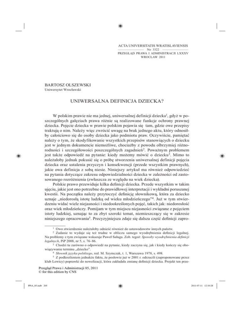 ACTA UNIVERSITATIS WRATISLAVIENSIS ———————— No 3322 ———————— PRZEGLĄD PRAWA I ADMINISTRACJI LXXXV WROCŁAW 2011 BARTOSZ OLSZEWSKI Uniwersytet Wrocławski UNIWERSALNA DEFINICJA DZIECKA? W polskim prawie nie ma jednej, uniwersalnej definicji dziecka1, gdyż w poszczególnych gałęziach prawa różnie są realizowane funkcje ochrony prawnej dziecka. Pojęcie dziecka w prawie polskim pojawia się tam, gdzie owe przepisy traktują o nim. Należy więc zwrócić uwagę na brak jednego aktu, który odnosiłby całościowo się do osoby dziecka jako podmiotu praw. Oczywiście, pamiętać należy o tym, że skodyfikowanie wszystkich przepisów stanowiących o dziecku jest w jednym dokumencie niemożliwe, chociażby z powodu olbrzymiej różnorodności i szczegółowości poszczególnych zagadnień 2. Poważnym problemem jest także odpowiedź na pytanie: kiedy możemy mówić o dziecku3. Mimo to należałoby jednak pokusić się o próbę stworzenia uniwersalnej definicji pojęcia dziecka oraz ustalenia przyczyn i konsekwencji (przede wszystkim prawnych), jakie owa definicja z sobą niesie. Niniejszy artykuł ma również odpowiedzieć na pytania dotyczące zakresu odpowiedzialności dziecka w zależności od zastosowanego rozróżnienia (zwłaszcza ze względu na wiek dziecka). Polskie prawo przewiduje kilka definicji dziecka. Przede wszystkim w takim ujęciu, jakie jest ono potrzebne do prawidłowej interpretacji i wykładni poruszanej kwestii. Na początku należy przytoczyć definicję słownikową, która za dziecko uznaje „niedorosłą istotę ludzką od wieku młodzieńczego”4. Już w tym stwierdzeniu widać wiele niejasności i niedookreślonych pojęć, takich jak: niedorosłość oraz wiek młodzieńczy. Pomijam w tym miejscu niejasności związane z pojęciem istoty ludzkiej, uznając to za zbyt szeroki temat, niemieszczący się w zakresie niniejszego opracowania5. Precyzyjniejsza zdaje się dalsza część definicji zapro1 Owo stwierdzenie należałoby odnieść również do ustawodawstw innych państw. Zadanie to wydaje się też trudne w obliczu samego wyodrębnienia definicji legalnej. Na problemy z tym związane wskazuje Paweł Saługa. Zob. tegoż: Sposoby wyodrębnienia definicji legalnych, PiP 2008, nr 5, s. 76–86. 3 Chodzi tu zarówno o odpowiedź na pytanie, kiedy zaczyna się, jak i kiedy kończy się obowiązywanie terminu „dziecko”. 4 Słownik języka polskiego, red. M. Szymczak, t. 1, Warszawa 1978, s. 498. 5 Z podkreśleniem jednakże faktu, że posłowie już w 2001 r. odrzucili (zaproponowane przez klub Lewicy) poprawki do nowelizacji, która zakładała zmianę definicji dziecka. Projekt ten prze2 Przegląd Prawa i Administracji 85, 2011 © for this edition by CNS PPiA_85.indb 205 2011-07-11 12:10:28 206 BARTOSZ OLSZEWSKI ponowana przez autorów Słownika języka polskiego, która prawdopodobnie jest pokłosiem praw człowieka. Uznaje ona bowiem za dziecko każdego, „niezależnie od wieku potomka swoich rodziców”. Podobne ujęcie prezentują autorzy Małego słownika języka polskiego (pod red. S. Skorupki, M. Auderskiej, Z. Łempickiej, Warszawa 1968, s. 151). Wydaje się, że definicje proponowane przez nieprawników zwracają uwagę jedynie na te elementy, które dotyczą wieku i podkreślenia podmiotowości każdego człowieka, nie precyzując jednak, o jaki wiek chodzi, nie określając też, od którego momentu możemy mówić o owej podmiotowości, ani nie przybliżają, na czym wspomniana podmiotowość miałaby polegać. Precyzyjniejsza wydaje się definicja zawarta w Encyklopedii powszechnej PWN traktująca dziecko jako „człowieka w pierwszym okresie postnatalnego rozwoju osobniczego [...], od chwili urodzenia do zakończenia procesu wzrastania; wg teologii chrześcijańskiej i innych religii — już od poczęcia, do zakończenia procesu dorastania. Odznacza się intensywną przemianą materii, [...] ma też wpływ na dojrzewanie i rozwój psychiki dziecka, gdyż rozwój fizyczny jest ściśle powiązany z rozwojem psychicznym”6. Kolejne elementy charakterystyki tak rozumianego dziecka obejmują: cechy morfologiczne, źródła zmienności międzyosobniczej, stopień oddziaływania dwóch układów czynników (tj. dziedzicznych i środowiskowych). Wydaje się, że użyteczność owej definicji podnosi dokonany przez autorów podział w rozwoju dziecka na okresy. Rozróżniono bowiem pięć podstawowych okresów wraz z przedziałem wiekowym. I tak wyróżniono: okres niemowlęcy (od urodzenia do połowy 2. roku życia), okres poniemowlęcy (2.–3. rok życia), okres wczesnego dzieciństwa (3.–6. rok życia), okres wczesnoszkolny (późnego dzieciństwa, dziewczęta 7.–10., chłopcy 7.–12. rok życia), okres dojrzewania (dziewczęta 11.–16., chłopcy 13.–18. rok życia)7. Istota zastosowanego podziału zdaje się również przejawiać w określeniu cech charakterystycznych, które winny w danym okresie rozwoju wykształcić się u zdrowego dziecka. Wydaje się więc, że niewystarczające są definicje określające dziecko jako „człowieka w pierwszym okresie postnatalnego rozwoju osobniczego, od chwili urodzenia do zakończenia procesu wzrastania”8. W licznych możliwych i proponowanych przez specjalistów wielu dziedzin poglądów dotyczących pojęcia dziecka należy się zatrzymać nad embriologią, działem medycyny, który bada rozwój człowieka i określa, od jakiego momentu widywał, by definicja dziecka operowała sformułowaniem „każdy człowiek do osiągnięcia pełnoletniości”. 6 Por. Nowa encyklopedia powszechna PWN, t. 2 (D–M), red. B. Petrozolin-Skowrońska, Warszawa 1995, s. 166–167. 7 Prawidłowością rozwoju dziecka i fazami tego rozwoju zajmuje się psychologia rozwojowa. Nie jest to jedyny podział. Przyjmuje się istnienie następujących faz rozwoju człowieka: okres prenatalny (do porodu), okres wcześniaczy (w przypadku przedwczesnego porodu), okres nowor