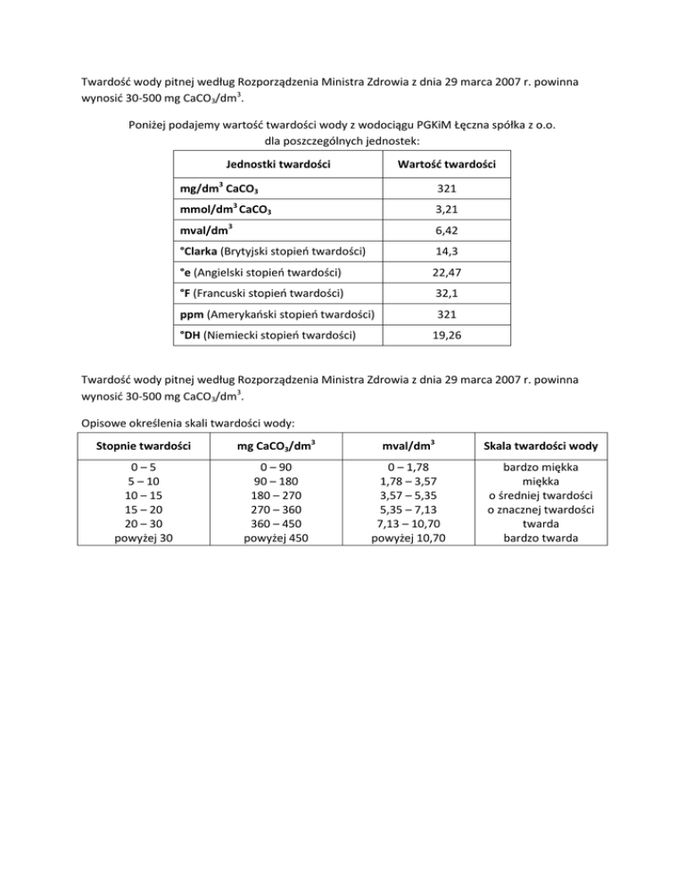 Twardość wody pitnej według Rozporządzenia Ministra Zdrowia z dnia 29 marca 2007 r. powinna wynosić 30-500 mg CaCO3/dm3. Poniżej podajemy wartość twardości wody z wodociągu PGKiM Łęczna spółka z o.o. dla poszczególnych jednostek: Jednostki twardości Wartość twardości mg/dm3 CaCO3 321 mmol/dm3 CaCO3 3,21 mval/dm3 6,42 °Clarka (Brytyjski stopień twardości) 14,3 °e (Angielski stopień twardości) 22,47 °F (Francuski stopień twardości) 32,1 ppm (Amerykański stopień twardości) 321 °DH (Niemiecki stopień twardości) 19,26 Twardość wody pitnej według Rozporządzenia Ministra Zdrowia z dnia 29 marca 2007 r. powinna wynosić 30-500 mg CaCO3/dm3. Opisowe określenia skali twardości wody: Stopnie twardości mg CaCO3/dm3 mval/dm3 Skala twardości wody 0–5 5 – 10 10 – 15 15 – 20 20 – 30 powyżej 30 0 – 90 90 – 180 180 – 270 270 – 360 360 – 450 powyżej 450 0 – 1,78 1,78 – 3,57 3,57 – 5,35 5,35 – 7,13 7,13 – 10,70 powyżej 10,70 bardzo miękka miękka o średniej twardości o znacznej twardości twarda bardzo twarda