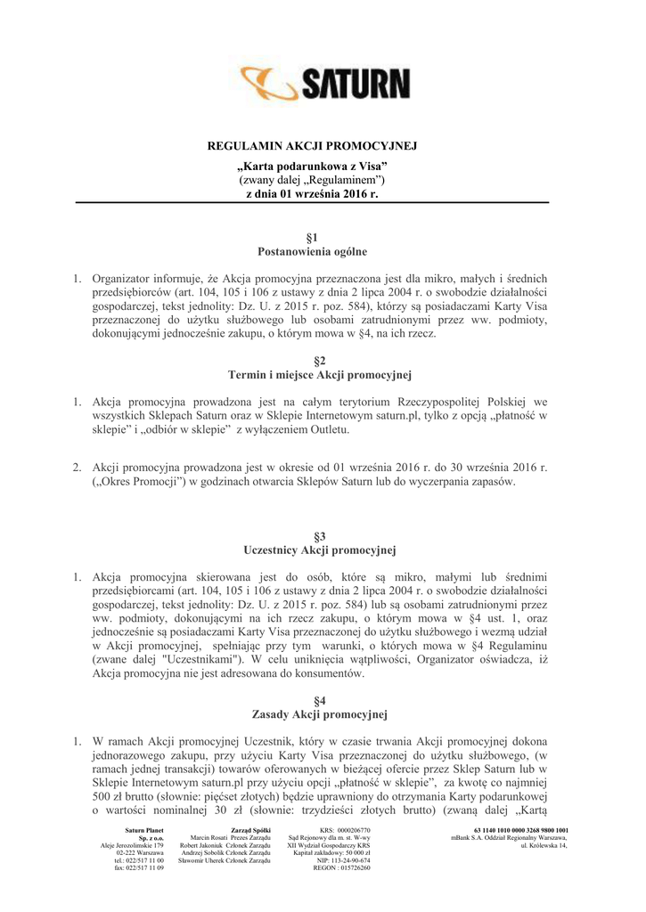 REGULAMIN AKCJI PROMOCYJNEJ „Karta podarunkowa z Visa” (zwany dalej „Regulaminem”) z dnia 01 września 2016 r. §1 Postanowienia ogólne 1. Organizator informuje, że Akcja promocyjna przeznaczona jest dla mikro, małych i średnich przedsiębiorców (art. 104, 105 i 106 z ustawy z dnia 2 lipca 2004 r. o swobodzie działalności gospodarczej, tekst jednolity: Dz. U. z 2015 r. poz. 584), którzy są posiadaczami Karty Visa przeznaczonej do użytku służbowego lub osobami zatrudnionymi przez ww. podmioty, dokonującymi jednocześnie zakupu, o którym mowa w §4, na ich rzecz. §2 Termin i miejsce Akcji promocyjnej 1. Akcja promocyjna prowadzona jest na całym terytorium Rzeczypospolitej Polskiej we wszystkich Sklepach Saturn oraz w Sklepie Internetowym saturn.pl, tylko z opcją „płatność w sklepie” i „odbiór w sklepie” z wyłączeniem Outletu. 2. Akcji promocyjna prowadzona jest w okresie od 01 września 2016 r. do 30 września 2016 r. („Okres Promocji”) w godzinach otwarcia Sklepów Saturn lub do wyczerpania zapasów. §3 Uczestnicy Akcji promocyjnej 1. Akcja promocyjna skierowana jest do osób, które są mikro, małymi lub średnimi przedsiębiorcami (art. 104, 105 i 106 z ustawy z dnia 2 lipca 2004 r. o swobodzie działalności gospodarczej, tekst jednolity: Dz. U. z 2015 r. poz. 584) lub są osobami zatrudnionymi przez ww. podmioty, dokonującymi na ich rzecz zakupu, o którym mowa w §4 ust. 1, oraz jednocześnie są posiadaczami Karty Visa przeznaczonej do użytku służbowego i wezmą udział w Akcji promocyjnej, spełniając przy tym warunki, o których mowa w §4 Regulaminu (zwane dalej "Uczestnikami"). W celu uniknięcia wątpliwości, Organizator oświadcza, iż Akcja promocyjna nie jest adresowana do konsumentów. §4 Zasady Akcji promocyjnej 1. W ramach Akcji promocyjnej Uczestnik, który w czasie trwania Akcji promocyjnej dokona jednorazowego zakupu, przy użyciu Karty Visa przeznaczonej do użytku służbowego, (w ramach jednej transakcji) towarów oferowanych w bieżącej ofercie przez Sklep Saturn lub w Sklepie Internetowym saturn.pl przy użyciu opcji „płatność w sklepie”, za kwotę co najmniej 500 zł brutto (słownie: pięćset złotych) będzie uprawniony do otrzymania Karty podarunkowej o wartości nominalnej 30 zł (słownie: trzydzieści złotych brutto) (zwaną dalej „Kartą Saturn Planet Sp. z o.o. Aleje Jerozolimskie 179 02-222 Warszawa tel.: 022/517 11 00 fax: 022/517 11 09 Zarząd Spółki Marcin Rosati Prezes Zarządu Robert Jakoniuk Członek Zarządu Andrzej Sobolik Członek Zarządu Sławomir Uherek Członek Zarządu KRS: 0000206770 Sąd Rejonowy dla m. st. W-wy XII Wydział Gospodarczy KRS Kapitał zakładowy: 50 000 zł NIP: 113-24-90-674 REGON : 015726260 63 1140 1010 0000 3268 9800 1001 mBank S.A. Oddział Regionalny Warszawa, ul. Królewska 14, podarunkową” lub „Nagrodą”), z zastrzeżeniem ust. 2 poniżej. 2. W przypadku dokonania jednorazowo zakupów na kwotę stanowiącą wielokrotność kwoty PLN 500 (pięćset) brutto, Karta podarunkowa zostanie doładowana odpowiednio wielokrotnością kwoty PLN 30 (słownie: trzydzieści) brutto, z zastrzeżeniem, że maksymalna kwota Nagrody nie może przewyższyć kwoty PLN 750 (słownie: siedemset pięćdziesiąt) brutto. 3. Do otrzymania Karty podarunkowej uprawnia dokonanie płatności za pomocą Karty Visa przeznaczoną do użytku służbowego, za zakupiony towar. 4. Uczestnik może wziąć udział w Akcji promocyjnej wielokrotnie, pod warunkiem każdorazowego spełnienia warunków opisanych w Regulaminie. 5. Karta podarunkowa Saturn, stanowiąca nagrodę w Akcji promocyjnej, jest wystawiana na okaziciela i umożliwia dokonywanie zakupu towarów z oferty handlowej Saturn w dowolnym sklepie Saturn na terenie Rzeczypospolitej Polskiej, zgodnie z Regulaminem aktywacji i użytkowania Karty podarunkowej. 6. Organizator zastrzega, że Akcją promocyjną nie są objęte usługi kwalifikowane i niekwalifikowane (Gwarancja Plus, Power Service, dostawa) oraz sprzedaż biletów na imprezy masowe, co oznacza, że cena tych usług nie jest wliczana do kwoty transakcji o której mowa w §4 ust. 1, powyżej. 7. Uczestnikom Akcji promocyjnej nie przysługuje prawo do otrzymania ekwiwalentu pieniężnego w wysokości Karty podarunkowej (w części ani w całości) za wyjątkiem przypadków określonych w Regulaminie aktywacji i użytkowania Karty podarunkowej Saturn. Szczegóły korzystania z Karty podarunkowej sieci Saturn określa Regulamin Kart podarunkowych zamieszczony na stronie internetowej saturn.pl. 8. Szczegóły i regulamin dotyczący korzystania z Karty podarunkowej dostępne są na stronie saturn.pl/karta-podarunkowa. 9. Organizator nie ponosi żadnej odpowiedzialności w przypadku utraty Karty podarunkowej. 10. Dokument stanowiący dowód zakupu (paragon fiskalny lub faktura VAT) w celu oznaczenia Akcji promocyjnej będzie zawierał w treści hasło Akcji promocyjnej „Karta podarunkowa z Visa”. 11. Akcja promocyjna nie może być łączona z innymi Akcjami promocyjnymi, w tym kodami rabatowymi otrzymanymi w ramach programu Konto Premium. §5 Wydanie Kart podarunkowych 1. Karty podarunkowe zostaną wydane Uczestnikom, którzy spełnią warunki określone w § 4, wyłącznie w dniu nabycia towarów, uprawniających do uzyskania Nagrody (decyduje data nabycia wydrukowana na paragonie fiskalnym lub na fakturze VAT). Nagrody wydawane są wyłącznie w czasie trwania Akcji promocyjnej zgodnie z postanowieniem § 2 pkt 2 niniejszego Regulaminu. Organizator informuje, że wydanie Nagrody będzie uzależnione od Saturn Planet Sp. z o.o. Aleje Jerozolimskie 179 02-222 Warszawa tel.: 022/517 11 00 fax: 022/517 11 09 Zarząd Spółki Marcin Rosati Prezes Zarządu Robert Jakoniuk Członek Zarządu Andrzej Sobolik Członek Zarządu Sławomir Uherek Członek Zarządu KRS: 0000206770 Sąd Rejonowy dla m. st. W-wy XII Wydział Gospodarczy KRS Kapitał zakładowy: 50 000 zł NIP: 11
