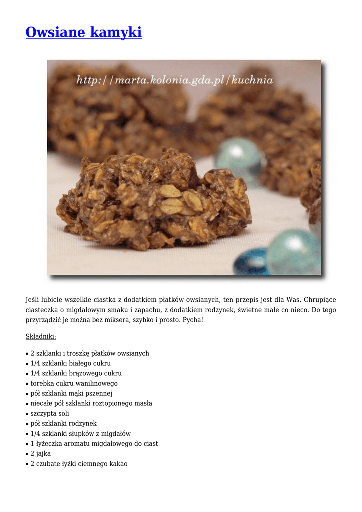 Owsiane kamyki Jeśli lubicie wszelkie ciastka z dodatkiem płatków owsianych, ten przepis jest dla Was. Chrupiące ciasteczka o migdałowym smaku i zapachu, z dodatkiem rodzynek, świetne małe co nieco. Do tego przyrządzić je można bez miksera, szybko i prosto. Pycha! Składniki: ■ ■ ■ ■ ■ ■ ■ ■ ■ ■ ■ ■ 2 szklanki i troszkę płatków owsianych 1/4 szklanki białego cukru 1/4 szklanki brązowego cukru torebka cukru wanilinowego pół szklanki mąki pszennej niecałe pół szklanki roztopionego masła szczypta soli pół szklanki rodzynek 1/4 szklanki słupków z migdałów 1 łyżeczka aromatu migdałowego do ciast 2 jajka 2 czubate łyżki ciemnego kakao Wykonanie: 1. Płatki owsiane wsypujemy na patelni i prażymy na małym ogniu, co jakiś czas mieszając. Kiedy lekko zmienią kolor i zaczną intensywniej pachnieć, wyłączamy gaz. 2. Do miski wsypujemy cukier (biały, brązowy i wanilinowy), dodajemy mąkę oraz kakao i mieszamy. Dosypujemy płatki i mieszamy. 3. Do suchych składników dolewamy aromat, masło, dodajemy migdały, rodzynki i wbijamy jajka. Mieszamy dokładnie łyżką, aż powstanie gęsta masa. 4. Ciastka wykładamy na blachę wyłożoną papierem do pieczenia. Pieczemy 20-25 minut w piekarniku nagrzanym do 180 stopni Celsjusza. Ciasto przekładane twarogiem Ciasto, które wyglądało na przeciętne, ale kiedy je zrobiłam i mój mąż spróbował, orzekł, że jest “boskie”. Rzeczywiście jest idealne na wszelkie spotkania, przyjęcia i na święta. Łączy w sobie lekkość ciasta ze słodyczą czekolady i lekką kwaskową nutą twarogu z cytryną. Proporcje ciasta starczają na blaszkę o wymiarach 28cm x 23cm. Składniki na masę twarogową: ■ ■ ■ ■ 500g chudego twarogu (najlepiej niemielonego, w kostkach) 2 całe jajka 4 łyżki cukru sok wyciśnięty z połowy cytryny Na ciasto: ■ ■ ■ ■ ■ ■ ■ ■ 200g cukru 200g margaryny Kasia lub masła szczypta soli 400g mąki pszennej 4 całe jajka 1 szklanka letniego mleka 15g proszku do pieczenia 4 łyżki kakao (naturalnego, ciemnego) Na polewę: ■ ■ ■ ■ ■ 150g gorzkiej czekolady (półtorej tabliczki) 100g margaryny Kasia lub masła 50g cukru pudru cukier wanilinowy żółtko Wykonanie: 1. Twaróg wrzucamy do miski, rozgniatamy widelcem lub rozcieramy lekko pałką do mieszania ciasta. Dodajemy do niego jajka, cukier i sok z cytryny i wszystko razem ucieramy mikserem na masę. Odstawiamy. 2. Margarynę na ciasto ucieramy z cukrem na gładki krem. Po kolei (i stopniowo) dodajemy do kremu jajka. W drugiej misce mieszamy mąkę, sól, proszek do pieczenia i kakao. Dodajemy mąkę stopniowo do kremu i miksujemy na wolnych obrotach. Nadal ucierając, po trochu (na zmianę z mąką) wlewamy mleko. 3. Piekarnik nagrzewamy do 190-200 stopni Celsjusza. Formę o wymiarach 28cm x 23cm wykładamy papierem do pieczenia, boki blachy natłuszczamy margaryną lub masłem. Połowę ciasta wykładamy do blaszki, rozsmarowujemy mniej więcej równo, na ciasto wykładamy masę twarogową, którą również rozsmarowujemy. Na masę kładziemy resztę ciasta (małymi porcjami) i rozsmarowujemy na wierzchu. Ciasto pieczemy około 40 minut (sprawdzamy patyczkiem). 4. Ciasto zostawiamy na 10 minut w piekarniku. Potem wyjmujemy i odstawiamy do przestygnięcia. 5. Czekolady roztapiamy w kąpieli wodnej (mała miska z połamaną na kawałki czekoladą umieszczamy w garnku z gotującą się wodą). Margarynę ucieramy z cukrem pudrem, cukrem wanilinowym oraz z żółtkiem na krem. Dodajemy roztopioną czekoladę i miksujemy. Masa powinna być na tyle gęsta, by bez problemu dała się rozsmarować na cieście. Wykładamy polewę na ciasto i czekamy aż zastygnie (ok. 20-30 minut). Ciasteczka mocno kakaowe Bardzo kakaowe, nie za słodkie, idealne do popołudniowej kawy, czy herbaty, świetnie się przechowują, nadal świeżutkie i tak samo smaczne. Składniki: ■ ■ 100 g ciemnego kakao (prawdziwego, rozpuszczalne się nie nadaje) 250 g mąki pszennej ■ ■ ■ ■ ■ 200 g margaryny Kasia (lub masła) cukier wanilinowy półtorej łyżeczki proszku do pieczenia 130 g brązowego cukru 3 jajka Wykonanie: 1. Mąkę wsypujemy do miski, dodajemy do niej proszek do pieczenia oraz kakao i mieszamy. 2. Miękką margarynę ucieramy z cukrem i cukrem wanilinowym na puszystą masę. Ucierając dodajemy po jednym jajka. Zanim wbijemy kolejne, poprzednie trzeba utrzeć. 3. Do masy po łyżce dodajemy mąkę z kakao i ucieramy na wolnych obrotach. Następnie rękami zagniatamy ciasto. Ciasto lepi się do rąk, ale unikajmy dosypywania mąki. 4. Blachę wykładamy papierem do pieczenia. Lekko omączonymi dłońmi formujemy z ciasta kulki mniej więcej wielkości orzecha włoskiego, lekko spłaszczamy i kładziemy na blasze. Zachowujemy pomiędzy nimi odległości ok. 2-3 cm. 5. Ciasteczka pieczemy ok. 25-30 minut w temperaturze 180-200 stopni Celsjusza. Wykładamy na kratkę do ostygnięcia. 6. Do ciasta można dodać mielone orzechy lub migdały. Wówczas ilość kakao zmniejszamy o tyle gram, ile gram orzechów dodamy do ciasta. Wedle gustu można też dodać do ciasta łyżeczkę mielonej kawy, skórki cytrynowej lub rodzynki. Muffiny migdałowo-bananowe Aromatyczne i dość zwarte, mało słodkie, więc można po upieczeniu oprószyć cukrem pudrem lub zamiast cukru brązowego dać biały. Mnie smakują z brązowym, bo lubię jego specyficzny smak. Muffiny piekłam dziś rano ze składników, które akurat miałam w domu. Składniki: ■ ■ ■ ■ ■ ■ ■ ■ ■ ■ ■ 2 szklanki mąki 2 miękkie banany cukier wanilinowy pół szklanki białego cukru pół szklanki cukru brązowego 2 łyżeczki proszku do pieczenia 2 łyżeczki zapachu migdałowego 1,5 szklanki mleka 1 całe jajo 80g Kasi lub masła 2 czubate łyżki kakao (naturalnego, ciemnego) Wykonanie: 1. Banany obieramy i rozgniatamy widelcem na papkę. 2. Mąkę, cukry, proszek do pieczenia oraz kakao wsypujemy do miski i 