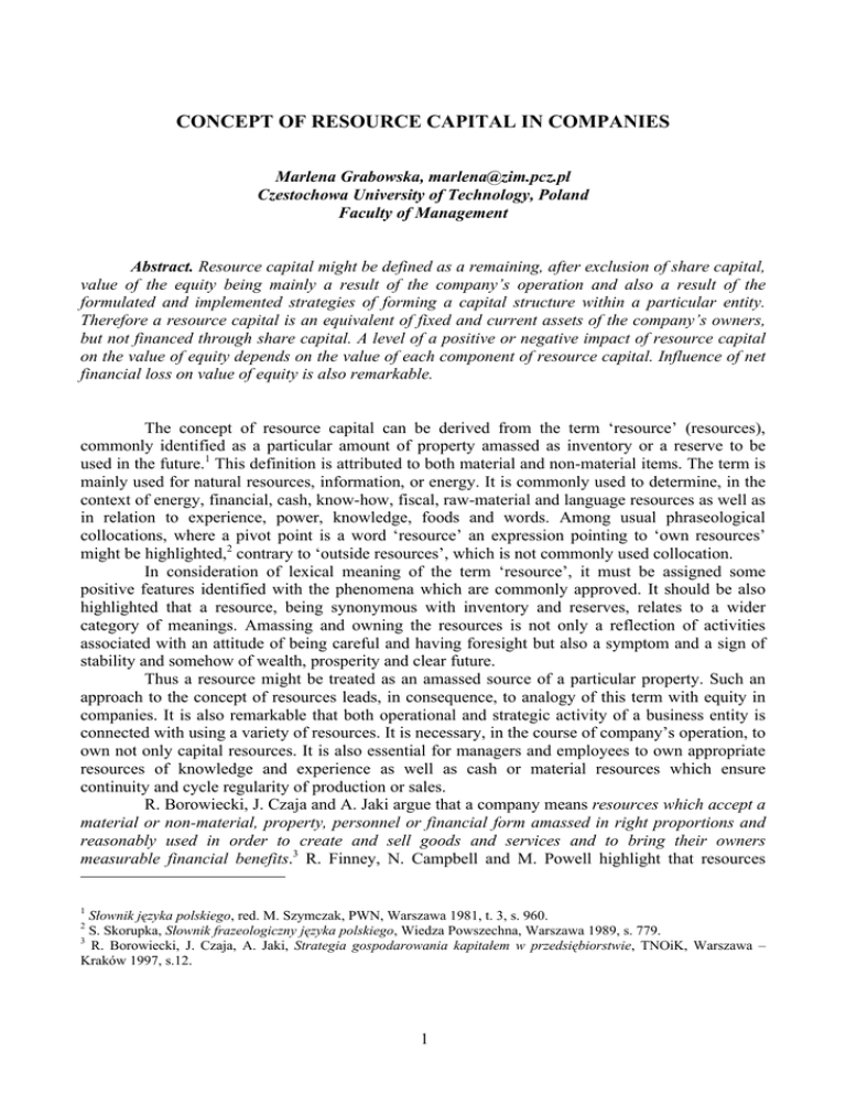 CONCEPT OF RESOURCE CAPITAL IN COMPANIES Marlena Grabowska, [email protected] Czestochowa University of Technology, Poland Faculty of Management Abstract. Resource capital might be defined as a remaining, after exclusion of share capital, value of the equity being mainly a result of the company’s operation and also a result of the formulated and implemented strategies of forming a capital structure within a particular entity. Therefore a resource capital is an equivalent of fixed and current assets of the company’s owners, but not financed through share capital. A level of a positive or negative impact of resource capital on the value of equity depends on the value of each component of resource capital. Influence of net financial loss on value of equity is also remarkable. The concept of resource capital can be derived from the term ‘resource’ (resources), commonly identified as a particular amount of property amassed as inventory or a reserve to be used in the future.1 This definition is attributed to both material and non-material items. The term is mainly used for natural resources, information, or energy. It is commonly used to determine, in the context of energy, financial, cash, know-how, fiscal, raw-material and language resources as well as in relation to experience, power, knowledge, foods and words. Among usual phraseological collocations, where a pivot point is a word ‘resource’ an expression pointing to ‘own resources’ might be highlighted,2 contrary to ‘outside resources’, which is not commonly used collocation. In consideration of lexical meaning of the term ‘resource’, it must be assigned some positive features identified with the phenomena which are commonly approved. It should be also highlighted that a resource, being synonymous with inventory and reserves, relates to a wider category of meanings. Amassing and owning the resources is not only a reflection of activities associated with an attitude of being careful and having foresight but also a symptom and a sign of stability and somehow of wealth, prosperity and clear future. Thus a resource might be treated as an amassed source of a particular property. Such an approach to the concept of resources leads, in consequence, to analogy of this term with equity in companies. It is also remarkable that both operational and strategic activity of a business entity is connected with using a variety of resources. It is necessary, in the course of company’s operation, to own not only capital resources. It is also essential for managers and employees to own appropriate resources of knowledge and experience as well as cash or material resources which ensure continuity and cycle regularity of production or sales. R. Borowiecki, J. Czaja and A. Jaki argue that a company means resources which accept a material or non-material, property, personnel or financial form amassed in right proportions and reasonably used in order to create and sell goods and services and to bring their owners measurable financial benefits.3 R. Finney, N. Campbell and M. Powell highlight that resources 1 polskiego, red. M. Szymczak, PWN, Warszawa 1981, t. 3, s. 960. S. Skorupka, frazeologiczny polskiego, Wiedza Powszechna, Warszawa 1989, s. 779. 3 R. Borowiecki, J. Czaja, A. Jaki, Strategia gospodarowania w , TNOiK, Warszawa – Kraków 1997, s.12. 2 1 mean specific, for a particular business, components of property and competence controlled and used by the companies to develop and implement their strategies.4 ‘Resource’ strategy is also 5 emphasized by J. and M. According to this theory, a company is a set of resources and abilities which determine effectiveness and efficiency of the entity in terms of execution of its goals. Company’s operation is more efficient if the company owns more appropriate resources and knowledge within its strategy. The literature survey indicates identification of the concept of company’s capital with a concept of resource.6 In this light a capital as a resource is one of the productivity factors used during production and exchange.7 H. Walica indicates that capital resources in companies impact on both current operation of a company and the possibility to finance restructuring and development initiatives, and they usually determine a company’s value and the benefits to the owners.8 Similar approach adopted B. – Sobczak who argued that capital resources determine existence of a business and they essentially influence its condition, continuity and development.9 The abovementioned meaning relates to the capital in total as an economic resource in a company necessary to finance property of the unit.10 Resource capital, however, is a narrower concept associated with a part of company’s equity. R. Borowiecki identifies resource capital with reserve (supplementary) capital while emphasizing that it is created by a company from the profit and becomes a reflection of its selffinancing.11 Thus this capital should be treated as a part of equity separated from the share capital. This definition might be attributed a narrower approach to a resource capital which suggests that such a capital assumes only positive values. H. Towarnicka presents similar division of equity. The author highlights in own sources of financing of a particular entity, two fundamental components: share capital and reserve capital, emphasizing that the latter might be defined as a resource or reserve capital.12 D. Kania and E. Dreliszek also associate level of resource capital with reserve capital in a company and claim that it increases the net value of the assets i.e. contribution of share capital to financing of property resources.13 J. Duraj, M. Gmytrasiewicz, A. and I. Olchowicz also treat resource capital as a part of the equity. However, their approach to resource capital is more complex. This capital is composed of three fundamental components: supplementary capital, reserve capital (encompassing revaluation reserve and oth