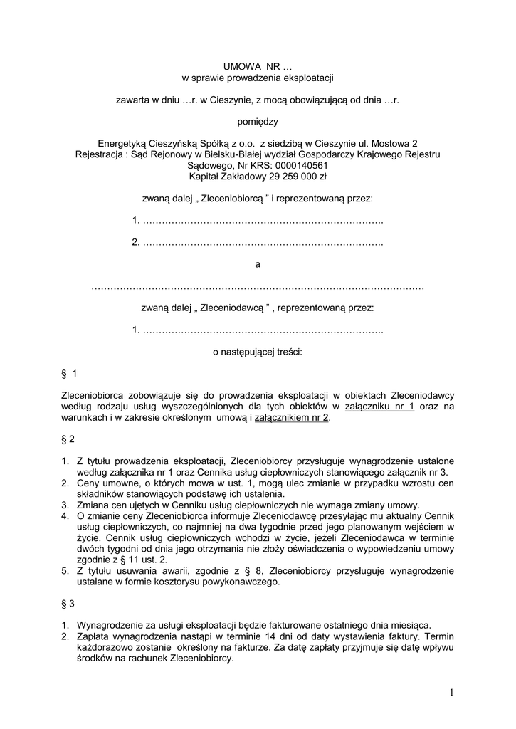 UMOWA NR … w sprawie prowadzenia eksploatacji zawarta w dniu …r. w Cieszynie, z mocą obowiązującą od dnia …r. pomiędzy Energetyką Cieszyńską Spółką z o.o. z siedzibą w Cieszynie ul. Mostowa 2 Rejestracja : Sąd Rejonowy w Bielsku-Białej wydział Gospodarczy Krajowego Rejestru Sądowego, Nr KRS: 0000140561 Kapitał Zakładowy 29 259 000 zł zwaną dalej „ Zleceniobiorcą ” i reprezentowaną przez: 1. …………………………………………………………………. 2. …………………………………………………………………. a …………………………………………………………………………………………… zwaną dalej „ Zleceniodawcą ” , reprezentowaną przez: 1. …………………………………………………………………. o następującej treści: § 1 Zleceniobiorca zobowiązuje się do prowadzenia eksploatacji w obiektach Zleceniodawcy według rodzaju usług wyszczególnionych dla tych obiektów w załączniku nr 1 oraz na warunkach i w zakresie określonym umową i załącznikiem nr 2. §2 1. Z tytułu prowadzenia eksploatacji, Zleceniobiorcy przysługuje wynagrodzenie ustalone według załącznika nr 1 oraz Cennika usług ciepłowniczych stanowiącego załącznik nr 3. 2. Ceny umowne, o których mowa w ust. 1, mogą ulec zmianie w przypadku wzrostu cen składników stanowiących podstawę ich ustalenia. 3. Zmiana cen ujętych w Cenniku usług ciepłowniczych nie wymaga zmiany umowy. 4. O zmianie ceny Zleceniobiorca informuje Zleceniodawcę przesyłając mu aktualny Cennik usług ciepłowniczych, co najmniej na dwa tygodnie przed jego planowanym wejściem w życie. Cennik usług ciepłowniczych wchodzi w życie, jeżeli Zleceniodawca w terminie dwóch tygodni od dnia jego otrzymania nie złoży oświadczenia o wypowiedzeniu umowy zgodnie z § 11 ust. 2. 5. Z tytułu usuwania awarii, zgodnie z § 8, Zleceniobiorcy przysługuje wynagrodzenie ustalane w formie kosztorysu powykonawczego. §3 1. Wynagrodzenie za usługi eksploatacji będzie fakturowane ostatniego dnia miesiąca. 2. Zapłata wynagrodzenia nastąpi w terminie 14 dni od daty wystawienia faktury. Termin każdorazowo zostanie określony na fakturze. Za datę zapłaty przyjmuje się datę wpływu środków na rachunek Zleceniobiorcy. 1 3. Nie zapłacenie w terminie ustalonej należności spowoduje naliczenie odsetek zgodnie z obowiązującymi przepisami. 4. Konto Zleceniobiorcy: ING Bank Śląski SA Oddział Cieszyn, nr konta 89 1050 1070 1000 0001 0075 9976 5. NIP: 548 - 007 - 52 - 93 6. Konto Zleceniodawcy: …………………………………………………………………………. 7. NIP: …………………………………………………………………………. 8. O zmianach w brzmieniu kont bankowych strony winny się wzajemnie powiadamiać pod rygorem poniesienia kosztów związanych z błędnymi operacjami bankowymi. §4 Interwencje o niedogrzewaniach, awariach i innych zakłóceniach w pracy urządzeń grzewczych Zleceniodawca zgłasza pisemnie na adres: Energetyka Cieszyńska sp. z o.o., ul. Mostowa 2 w Cieszynie, e-mail: [email protected] lub faks (033) 8576-707, bądź ustnie na Pogotowie Ciepłownicze - tel. 993. §5 Nieuzasadnione wezwanie pogotowia ciepłowniczego podlegać będzie jednorazowej opłacie wg. Cennika usług ciepłowniczych pozycja „Usługi pogotowia ciepłowniczego”. §6 Zleceniobiorca ma prawo odstąpić od prowadzenia eksploatacji urządzeń grzewczych w przypadku nie wykonania jego zaleceń umożliwiających prowadzenie prawidłowej eksploatacji. §7 Zleceniobiorca i Zleceniodawca, każdy w swoim zakresie zobowiązani są do przestrzegania zasad i przepisów obowiązujących w zakresie eksploatacji urządzeń cieplnych. §8 Usunięcie awarii wymagających demontażu urządzeń, zgłoszone Zleceniodawcy przez Zleceniobiorcę, rozliczone będzie na podstawie odrębnej umowy i sporządzonego kosztorysu powykonawczego, zatwierdzonego przez obie strony. §9 Zmiany niniejszej umowy wymagają formy pisemnej pod rygorem nieważności, z zastrzeżeniem wyjątków w umowie przewidzianych. § 10 Wszelkie sprawy sporne wynikłe w trakcie obowiązywania umowy rozpatrywane będą przez sąd właściwy dla siedziby pozwanego. § 11 1. Umowę zawarto na czas nieokreślony. 2. Umowa niniejsza może być rozwiązana przez każdą ze stron w drodze pisemnego oświadczenia z zachowaniem 3 - miesięcznego okresu wypowiedzenia. 2 3. Zleceniobiorca może rozwiązać niniejszą umowę w drodze pisemnego oświadczenia z zachowaniem 2 - tygodniowego okresu wypowiedzenia, w przypadku: a. zalegania przez Zleceniodawcę z zapłatą należnego wynagrodzenia za usługi eksploatacji za okres co najmniej 1 - go miesiąca, b. o którym mowa w § 6, c. naruszenia przez Zleceniodawcę postanowień niniejszej umowy. 4. Zleceniodawca może rozwiązać niniejszą umowę w drodze pisemnego oświadczenia z zachowaniem 2 - tygodniowego okresu wypowiedzenia, w przypadku naruszenia przez Zleceniobiorcę postanowień niniejszej umowy. § 12 1. Umowę niniejszą sporządzono w dwóch egzemplarzach, po jednym dla każdej ze stron. 2. Integralną część umowy stanowią załączniki : a. Nr 1 – Obiekt, rodzaj usług i wynagrodzenie, b. Nr 2 – Warunki i zakres prowadzenia eksploatacji, c. Nr 3 – Cennik usług ciepłowniczych. Zleceniobiorca: Zleceniodawca: 3 Załącznik nr 1 z dnia ………….. Nazwa i adres Odbiorcy: dotyczący prowadzenia eksploatacji do umowy nr ………………. obowiązujący od dnia ………….. Zgodnie z § 2 umowy Dostawca zobowiązuje się prowadzić eksploatację w wymienionych obiektach Odbiorcy EKSPLOATACJA LP. NAZWA I ADRES OBIEKTU ADRES WĘZŁA / INSTALACJI WEWNĘTRZNEJ WĘZŁA INSTALACJI CIEPLNEGO WEWNĘTRZNYCH zł/m-c szt. grzejników Postanowienia specjalne: PODPISY ZLECENIOBIORCY: PODPISY ZLECENIODAWCY: 4