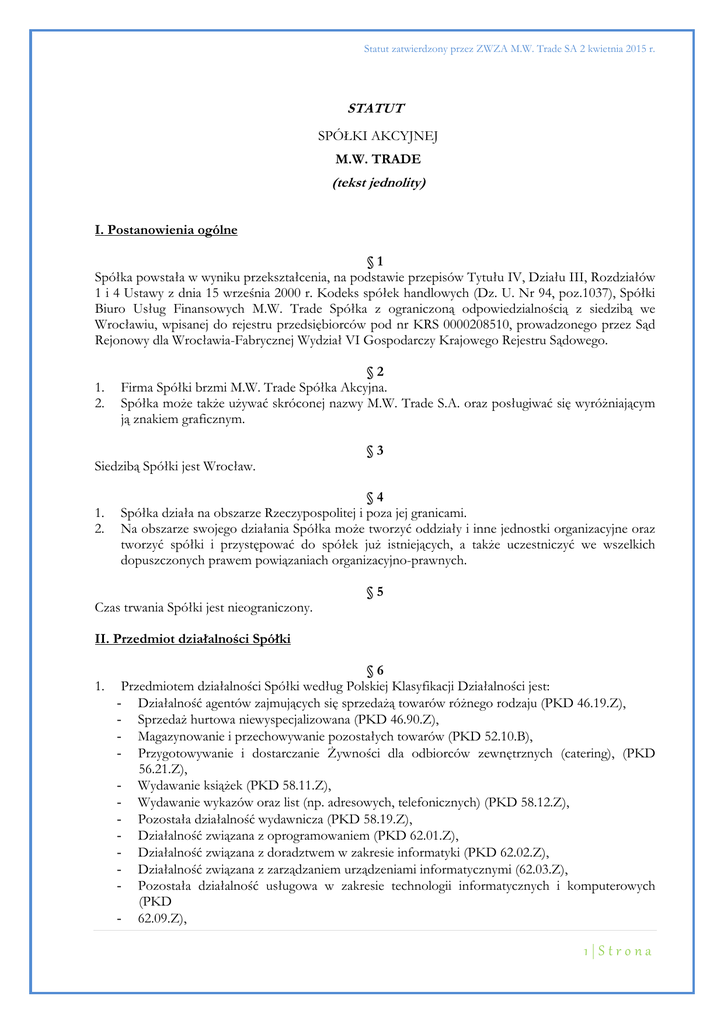 Statut zatwierdzony przez ZWZA M.W. Trade SA 2 kwietnia 2015 r. STATUT SPÓŁKI AKCYJNEJ M.W. TRADE (tekst jednolity) I. Postanowienia ogólne §1 Spółka powstała w wyniku przekształcenia, na podstawie przepisów Tytułu IV, Działu III, Rozdziałów 1 i 4 Ustawy z dnia 15 września 2000 r. Kodeks spółek handlowych (Dz. U. Nr 94, poz.1037), Spółki Biuro Usług Finansowych M.W. Trade Spółka z ograniczoną odpowiedzialnością z siedzibą we Wrocławiu, wpisanej do rejestru przedsiębiorców pod nr KRS 0000208510, prowadzonego przez Sąd Rejonowy dla Wrocławia-Fabrycznej Wydział VI Gospodarczy Krajowego Rejestru Sądowego. 1. 2. §2 Firma Spółki brzmi M.W. Trade Spółka Akcyjna. Spółka może także używać skróconej nazwy M.W. Trade S.A. oraz posługiwać się wyróżniającym ją znakiem graficznym. §3 Siedzibą Spółki jest Wrocław. 1. 2. §4 Spółka działa na obszarze Rzeczypospolitej i poza jej granicami. Na obszarze swojego działania Spółka może tworzyć oddziały i inne jednostki organizacyjne oraz tworzyć spółki i przystępować do spółek już istniejących, a także uczestniczyć we wszelkich dopuszczonych prawem powiązaniach organizacyjno-prawnych. §5 Czas trwania Spółki jest nieograniczony. II. Przedmiot działalności Spółki 1. §6 Przedmiotem działalności Spółki według Polskiej Klasyfikacji Działalności jest: - Działalność agentów zajmujących się sprzedażą towarów różnego rodzaju (PKD 46.19.Z), - Sprzedaż hurtowa niewyspecjalizowana (PKD 46.90.Z), - Magazynowanie i przechowywanie pozostałych towarów (PKD 52.10.B), - Przygotowywanie i dostarczanie Żywności dla odbiorców zewnętrznych (catering), (PKD 56.21.Z), - Wydawanie książek (PKD 58.11.Z), - Wydawanie wykazów oraz list (np. adresowych, telefonicznych) (PKD 58.12.Z), - Pozostała działalność wydawnicza (PKD 58.19.Z), - Działalność związana z oprogramowaniem (PKD 62.01.Z), - Działalność związana z doradztwem w zakresie informatyki (PKD 62.02.Z), - Działalność związana z zarządzaniem urządzeniami informatycznymi (62.03.Z), - Pozostała działalność usługowa w zakresie technologii informatycznych i komputerowych (PKD - 62.09.Z), 1|Strona Statut zatwierdzony przez ZWZA M.W. Trade SA 2 kwietnia 2015 r. - Przetwarzanie danych; zarządzanie stronami internetowymi (hosting) i podobna działalność (PKD 63.11.Z), Działalność portali internetowych (PKD 63.12.Z), Pozostała działalność usługowa w zakresie informacji, gdzie indziej niesklasyfikowana (PKD 63.99.Z), Pozostałe pośrednictwo pieniężne (PKD 64.19.Z), Działalność holdingów finansowych (PKD 64.20.Z), Działalność trustów, funduszów i podobnych instytucji finansowych (PKD 64.30.Z), Leasing finansowy (PKD 64.91.Z), Pozostałe formy udzielania kredytów (PKD 64.92.Z), Pozostała finansowa działalność usługowa, gdzie indziej niesklasyfikowana, z wyłączeniem ubezpieczeń i funduszów emerytalnych (PKD 64.99.Z), Pozostała działalność wspomagająca usługi finansowe, z wyłączeniem ubezpieczeń i funduszów emerytalnych (PKD 66.19.Z), Kupno i sprzedaż nieruchomości na własny rachunek (PKD 68.10.Z), Wynajem i zarządzanie nieruchomościami własnymi lub dzierżawionymi (PKD 68.20.Z), Pośrednictwo w obrocie nieruchomościami (PKD 68.31.Z), Zarządzanie nieruchomościami wykonywane na zlecenie (PKD 68.32.Z), Działalność prawnicza (PKD 69.10.Z ), Działalność rachunkowo-księgowa; doradztwo podatkowe (PKD 69.20.Z), Działalność firm centralnych (head offices) i holdingów, z wyłączeniem holdingów finansowych (PKD 70.10.Z), Stosunki międzyludzkie (public relations) i komunikacja (PKD 70.21.Z), Pozostałe doradztwo w zakresie prowadzenia działalności gospodarczej i zarządzania (PKD 70.22.Z), Działalność agencji reklamowych (PKD 73.11.Z), Pośrednictwo w sprzedaży miejsca na cele reklamowe w mediach elektronicznych (Internet) (PKD 73.12.C), Pośrednictwo w sprzedaży miejsca na cele reklamowe w pozostałych mediach (PKD 73.12.D), Badanie rynku i opinii publicznej (PKD 73.20.Z), Działalność w zakresie specjalistycznego projektowania (PKD 74.10.Z), Działalność związana z tłumaczeniami (PKD 74.30.Z), Pozostała działalność profesjonalna, naukowa i techniczna, gdzie indziej niesklasyfikowana (PKD 74.90.Z), Wynajem i dzierżawa samochodów osobowych i furgonetek (PKD 77.11.Z), Wynajem i dzierżawa maszyn i urządzeń biurowych, włączając komputery (PKD 77.33.Z), Wynajem i dzierżawa pozostałych maszyn, urządzeń oraz dóbr materialnych, gdzie indziej niesklasyfikowane (PKD 77.39.Z), Dzierżawa własności intelektualnej i podobnych produktów, z wyłączeniem prac chronionych prawem autorskim (PKD 77.40.Z), Działalność związana z wyszukiwaniem miejsc pracy i pozyskiwaniem pracowników (PKD 78.10.Z), Działalność agencji pracy tymczasowej (PKD 78.20.Z), Pozostała działalność związana z udostępnianiem pracowników (PKD 78.30.Z), Działalność detektywistyczna (PKD 80.30.Z), 2|Strona Statut zatwierdzony przez ZWZA M.W. Trade SA 2 kwietnia 2015 r. Działalność usługowa związana z administracyjną obsługą biura (PKD 82.11.Z), Wykonywanie fotokopii, przygotowywanie dokumentów i pozostała specjalistyczna działalność wspomagająca prowadzenie biura (PKD 82.19.Z), - Działalność związana z organizacją targów, wystaw i kongresów (PKD 82.30.Z), - Działalność świadczona przez agencje inkasa i biura kredytowe (PKD 82.91.Z), - Pozostała działalność wspomagająca prowadzenie działalności gospodarczej, gdzie indziej niesklasyfikowana (PKD 82.99.Z), - Pozostałe pozaszkolne formy edukacji, gdzie indziej niesklasyfikowane (PKD 85.59.B), - Wynajem i dzierżawa maszyn i urządzeń rolniczych (PKD 77.31.Z), - Wynajem i dzierżawa maszyn i urządzeń budowlanych (PKD 77.32.Z), - Wynajem i dzierżawa pozostałych maszyn, urządzeń oraz dóbr materialnych, gdzie indziej niesklasyfikowane (PKD 77.39.Z), - Dzierżawa własności 