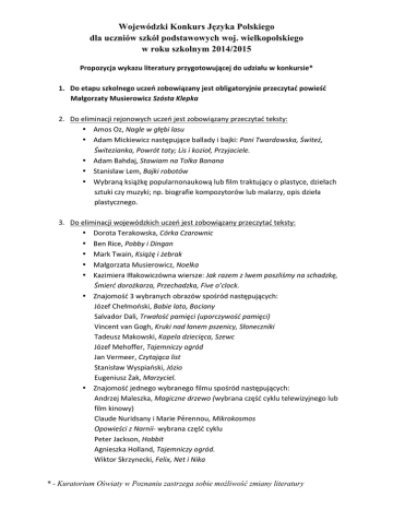 Wojewódzki Konkurs Języka Polskiego dla uczniów szkół podstawowych woj. wielkopolskiego w roku szkolnym 2014/2015 Propozycja wykazu literatury przygotowującej do udziału w konkursie* 1. Do etapu szkolnego uczeń zobowiązany jest obligatoryjnie przeczytać powieść Małgorzaty Musierowicz Szósta Klepka 2. Do eliminacji rejonowych uczeń jest zobowiązany przeczytać teksty: • Amos Oz, Nagle w głębi lasu • Adam Mickiewicz następujące ballady i bajki: Pani Twardowska, Świteź, Świtezianka, Powrót taty; Lis i kozioł, Przyjaciele. • Adam Bahdaj, Stawiam na Tolka Banana • Stanisław Lem, Bajki robotów • Wybraną książkę popularnonaukową lub film traktujący o plastyce, dziełach sztuki czy muzyki; np. biografie kompozytorów lub malarzy, opis dzieła plastycznego. 3. Do eliminacji wojewódzkich uczeń jest zobowiązany przeczytać teksty: • Dorota Terakowska, Córka Czarownic • Ben Rice, Pobby i Dingan • Mark Twain, Książę i żebrak • Małgorzata Musierowicz, Noelka • Kazimiera Iłłakowiczówna wiersze: Jak razem z lwem poszliśmy na schadzkę, Śmierć dorożkarza, Przechadzka, Five o’clock. • Znajomość 3 wybranych obrazów spośród następujących: Józef Chełmoński, Babie lato, Bociany Salvador Dali, Trwałość pamięci (uporczywość pamięci) Vincent van Gogh, Kruki nad łanem pszenicy, Słoneczniki Tadeusz Makowski, Kapela dziecięca, Szewc Józef Mehoffer, Tajemniczy ogród Jan Vermeer, Czytająca list Stanisław Wyspiański, Józio Eugeniusz Żak, Marzyciel. • Znajomość jednego wybranego filmu spośród następujących: Andrzej Maleszka, Magiczne drzewo (wybrana część cyklu telewizyjnego lub film kinowy) Claude Nuridsany i Marie Pẻrennou, Mikrokosmos Opowieści z Narnii-‐ wybrana część cyklu Peter Jackson, Hobbit Agnieszka Holland, Tajemniczy ogród. Wiktor Skrzynecki, Felix, Net i Nika * - Kuratorium Oświaty w Poznaniu zastrzega sobie możliwość zmiany literatury