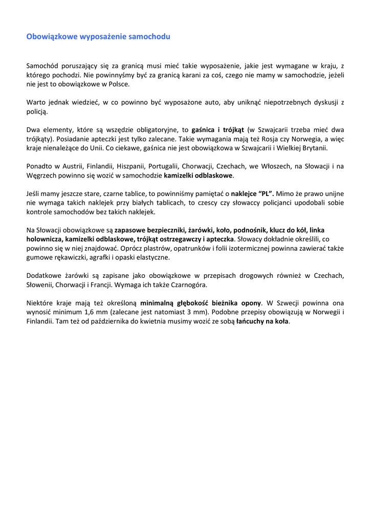 Obowi zkowe wyposa enie samochodu Samochód poruszaj cy si za granic musi mie takie wyposa enie, jakie jest wymagane w kraju, z którego pochodzi. Nie powinny my by za granic karani za co , czego nie mamy w samochodzie, je eli nie jest to obowi zkowe w Polsce. Warto jednak wiedzie , w co powinno by wyposa one auto, aby unikn policj . niepotrzebnych dyskusji z Dwa elementy, które s wsz dzie obligatoryjne, to ga nica i trójk t (w Szwajcarii trzeba mie dwa trójk ty). Posiadanie apteczki jest tylko zalecane. Takie wymagania maj te Rosja czy Norwegia, a wi c kraje nienale ce do Unii. Co ciekawe, ga nica nie jest obowi zkowa w Szwajcarii i Wielkiej Brytanii. Ponadto w Austrii, Finlandii, Hiszpanii, Portugalii, Chorwacji, Czechach, we W oszech, na S owacji i na grzech powinno si wozi w samochodzie kamizelki odblaskowe. Je li mamy jeszcze stare, czarne tablice, to powinni my pami ta o naklejce “PL”. Mimo e prawo unijne nie wymaga takich naklejek przy bia ych tablicach, to czescy czy s owaccy policjanci upodobali sobie kontrole samochodów bez takich naklejek. Na S owacji obowi zkowe s zapasowe bezpieczniki, arówki, ko o, podno nik, klucz do kó , linka holownicza, kamizelki odblaskowe, trójk t ostrzegawczy i apteczka. S owacy dok adnie okre lili, co powinno si w niej znajdowa . Oprócz plastrów, opatrunków i folii izotermicznej powinna zawiera tak e gumowe r kawiczki, agrafki i opaski elastyczne. Dodatkowe arówki s zapisane jako obowi zkowe w przepisach drogowych równie w Czechach, owenii, Chorwacji i Francji. Wymaga ich tak e Czarnogóra. Niektóre kraje maj te okre lon minimaln g boko bie nika opony. W Szwecji powinna ona wynosi minimum 1,6 mm (zalecane jest natomiast 3 mm). Podobne przepisy obowi zuj w Norwegii i Finlandii. Tam te od pa dziernika do kwietnia musimy wozi ze sob cuchy na ko a.