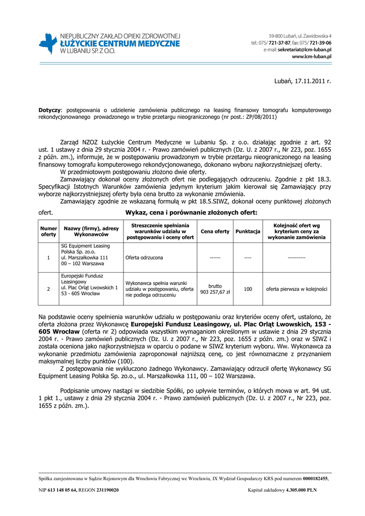 Lubań, 17.11.2011 r. Dotyczy: postępowania o udzielenie zamówienia publicznego na leasing finansowy tomografu komputerowego rekondycjonowanego prowadzonego w trybie przetargu nieograniczonego (nr post.: ZP/08/2011) Zarząd NZOZ ŁuŜyckie Centrum Medyczne w Lubaniu Sp. z o.o. działając zgodnie z art. 92 ust. 1 ustawy z dnia 29 stycznia 2004 r. - Prawo zamówień publicznych (Dz. U. z 2007 r., Nr 223, poz. 1655 z późn. zm.), informuje, Ŝe w postępowaniu prowadzonym w trybie przetargu nieograniczonego na leasing finansowy tomografu komputerowego rekondycjonowanego, dokonano wyboru najkorzystniejszej oferty. W przedmiotowym postępowaniu złoŜono dwie oferty. Zamawiający dokonał oceny złoŜonych ofert nie podlegających odrzuceniu. Zgodnie z pkt 18.3. Specyfikacji Istotnych Warunków zamówienia jedynym kryterium jakim kierował się Zamawiający przy wyborze najkorzystniejszej oferty była cena brutto za wykonanie zmówienia. Zamawiający zgodnie ze wskazaną formułą w pkt 18.5.SIWZ, dokonał oceny punktowej złoŜonych ofert. Numer oferty 1 2 Wykaz, cena i porównanie złoŜonych ofert: Nazwy (firmy), adresy Wykonawców SG Equipment Leasing Polska Sp. zo.o. ul. Marszałkowka 111 00 – 102 Warszawa Europejski Fundusz Leasingowy ul. Plac Orląt Lwowskich 1 53 - 605 Wrocław Streszczenie spełniania warunków udziału w postępowaniu i oceny ofert Oferta odrzucona Wykonawca spełnia warunki udziału w postępowaniu, oferta nie podlega odrzuceniu Cena oferty Punktacja Kolejność ofert wg kryterium ceny za wykonanie zamówienia ------ ---- ---------- brutto 903 257,67 zł 100 oferta pierwsza w kolejności Na podstawie oceny spełnienia warunków udziału w postępowaniu oraz kryteriów oceny ofert, ustalono, Ŝe oferta złoŜona przez Wykonawcę Europejski Fundusz Leasingowy, ul. Plac Orląt Lwowskich, 153 605 Wrocław (oferta nr 2) odpowiada wszystkim wymaganiom określonym w ustawie z dnia 29 stycznia 2004 r. - Prawo zamówień publicznych (Dz. U. z 2007 r., Nr 223, poz. 1655 z późn. zm.) oraz w SIWZ i została oceniona jako najkorzystniejsza w oparciu o podane w SIWZ kryterium wyboru. Ww. Wykonawca za wykonanie przedmiotu zamówienia zaproponował najniŜszą cenę, co jest równoznaczne z przyznaniem maksymalnej liczby punktów (100). Z postępowania nie wykluczono Ŝadnego Wykonawcy. Zamawiający odrzucił ofertę Wykonawcy SG Equipment Leasing Polska Sp. zo.o., ul. Marszałkowka 111, 00 – 102 Warszawa. Podpisanie umowy nastąpi w siedzibie Spółki, po upływie terminów, o których mowa w art. 94 ust. 1 pkt 1., ustawy z dnia 29 stycznia 2004 r. - Prawo zamówień publicznych (Dz. U. z 2007 r., Nr 223, poz. 1655 z późn. zm.). ========================================================================================================== Spółka zarejestrowana w Sądzie Rejonowym dla Wrocławia Fabrycznej we Wrocławiu, IX Wydział Gospodarczy KRS pod numerem 0000182455, NIP 613 148 05 64, REGON 231190020 Kapitał zakładowy 4.305.000 PLN