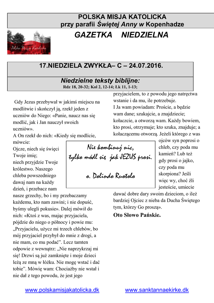 POLSKA MISJA KATOLICKA przy parafii Świętej Anny w Kopenhadze GAZETKA NIEDZIELNA 17.NIEDZIELA ZWYKŁA– C – 24.07.2016. Niedzielne teksty biblijne: Rdz 18, 20-32; Kol 2, 12-14; Łk 11, 1-13; przyjacielem, to z powodu jego natręctwa wstanie i da mu, ile potrzebuje. Gdy Jezus przebywał w jakimś miejscu na I Ja wam powiadam: Proście, a będzie modlitwie i skończył ją, rzekł jeden z wam dane; szukajcie, a znajdziecie; uczniów do Niego: «Panie, naucz nas się kołaczcie, a otworzą wam. Każdy bowiem, modlić, jak i Jan nauczył swoich kto prosi, otrzymuje; kto szuka, znajduje; a uczniów». kołaczącemu otworzą. Jeżeli którego z was A On rzekł do nich: «Kiedy się modlicie, ojców syn poprosi o mówcie: chleb, czy poda mu Nie kombinuj nic, Ojcze, niech się święci Lub też Twoje imię; tylko módl się jak JEZUS prosi. kamień? gdy prosi o jajko, niech przyjdzie Twoje czy poda mu królestwo. Naszego skorpiona? Jeśli chleba powszedniego o. Dolindo Ruotolo więc wy, choć źli dawaj nam na każdy jesteście, umiecie dzień, i przebacz nam dawać dobre dary swoim dzieciom, o ileż nasze grzechy, bo i my przebaczamy bardziej Ojciec z nieba da Ducha Świętego każdemu, kto nam zawini; i nie dopuść, tym, którzy Go proszą». byśmy ulegli pokusie». Dalej mówił do nich: «Ktoś z was, mając przyjaciela, pójdzie do niego o północy i powie mu: „Przyjacielu, użycz mi trzech chlebów, bo mój przyjaciel przybył do mnie z drogi, a nie mam, co mu podać”. Lecz tamten odpowie z wewnątrz: „Nie naprzykrzaj mi się! Drzwi są już zamknięte i moje dzieci leżą ze mną w łóżku. Nie mogę wstać i dać tobie”. Mówię wam: Chociażby nie wstał i nie dał z tego powodu, że jest jego www.polskamisjakatolicka.dk Oto Słowo Pańskie. www.sanktannaekirke.dk Medytacja niedzielna: "Módlcie się tak, jakby wszystko zależało od Boga, a pracujcie tak, jakby wszystko zależało od was" KATECHIZM KOŚCIOŁA KATOLICKIEGO, KKK 2834 Tym, którzy szukają Królestwa i sprawiedliwości Bożej, przyrzeka On udzielić wszystkiego w nadmiarze. W rzeczywistości wszystko należy do Boga: temu, kto posiada Boga, nie brakuje niczego, jeśli sam należy do Boga. KKK, 2830 Ten tylko modli się nieustannie, kto modlitwę łączy z czynami, a czyny z modlitwą. Tylko w ten sposób możemy uznać za możliwą do urzeczywistnienia zasadę nieustannej modlitwy.KKK, 2745 Kto się modli, z pewnością się zbawia; kto się nie modli, z pewnością się potępia. KKK,, 2744 Nic nie jest tak ważne jak modlitwa; sprawia ona, że to co niemożliwe, staje się możliwe, to, co trudne, staje się łatwe. Jest niemożliwe, aby grzeszył człowiek, który się modli. KKK 2744 Modlitwa jest życiową koniecznością. KKK 2744 Można modlić się często i gorąco. Nawet na targu czy w czasie samotnej przechadzki, siedząc w swoim sklepiku czy też kupując lub sprzedając, a nawet przy gotowaniu. KKK 2743 Zawsze modlitwę w ciszy, ponieważ Bóg przemawia w ciszy serca. Bóg jest przyjacielem ciszy – powinniśmy rozpoczynam słuchać Boga, bo istotne jest nie to, co my mówimy, ale to, co On pragnie nam powiedzieć. Matka Teresa z Kalkuty Miłość zaczyna się w domu, dlatego tak ważna jest rodzinna modlitwa. Jeśli razem będziecie się modlić, pozostaniecie razem, będziecie wzajemnie darzyć się miłością, jaką Bóg obdarza każdą i każdego z was. Dzieci trzeba uczyć modlitwy, a rodzice powinni modlić się razem z dziećmi. Matka Teresa z Kalkuty www.polskamisjakatolicka.dk www.sanktannaekirke.dk „Boże, Ojcze Miłosierny, który objawiłeś swoją miłość w Twoim Synu Jezusie Chrystusie, i wylałeś ją na nas w Duchu Świętym, Pocieszycielu, Tobie zawierzamy dziś losy świata i każdego człowieka. Zawierzamy Ci szczególnie ludzi młodych ze wszystkich narodów, ludów i języków. Prowadź ich bezpiecznie po zawiłych ścieżkach współczesnego świata i daj im łaskę owocnego przeżycia Światowych Dni Młodzieży w Krakowie. Ojcze niebieski, uczyń nas świadkami Twego miłosierdzia. Naucz nieść wiarę wątpiącym, nadzieję zrezygnowanym, miłość oziębłym, przebaczenie winnym i radość smutnym. Niech iskra miłosiernej miłości, którą w nas zapaliłeś, stanie się ogniem przemieniającym ludzkie serca i odnawiającym oblicze ziemi. Maryjo, Matko Miłosierdzia, módl się za nami. Święty Janie Pawle II, módl się za nami. Święta Siostro Faustyno, módl się za nami.” Niedziela 24.VII.2016 Poniedziałek 25.VII.2016 Wtorek 26.VII.2016 Środa 27.VII.2016 Czwartek 28.VI.2016. Piątek 29.VII.2016 Sobota 30.VII.2016 17.NIEDZIELA ZWYKŁA –– „C”. 24.07.2016 Rdz 18, 20-32; Ps 138 Kol 2, 12-14; Łk 11, 1-13; Św. Jakuba Apostoła 2 Kor 4, 7-15; Mt 20, 20-28 Św.Joachima i Anny Rodziców NMP Syr 44, 1. 10-15; Mt 13, 16-17 Natalii Jr 15, 10. 16-21; Mt 13, 44-46 Wiktora Jr 2,1-3.7-8.12-13; Mt 13,10-17 Św. Marty 1 J 4, 7-16; Łk 10, 38-42 Piotra Jr 26, 11-16. 24; Mt 14, 1-12 www.polskamisjakatolicka.dk www.sanktannaekirke.dk OGŁOSZENIA DUSZPASTERSKIE 16.NIEDZIELA ZWYKŁA – C – 24.VII.2016. 1. 2. 3. W dzisiejszą niedzielę jesteśmy zachęceni do modlitwy. Niech słowa Pana Jezusa będą zachętą do głębszej modlitwy, zwłaszcza w intencji Światowych Dni Młodzieży. Zachęcamy wszystkich wiernych do modlitwy o bezpieczeństwo i głęboki duchowy przebieg ŚWIATOWYCH DNI MŁODZIEZY w Krakowie, ale także do śledzenia w mediach spotkań młodzieży z PAPIEŻEM FRANCISZKIEM. W tym tygodniu we wtorek obchodzimy wspomnienie św. Joachima i Anny, Rodziców NMP. Jest to również dzień Patronki naszej Parafii, św. Anny. Jednak uroczystość odpustowa jest przeniesiona na 10 i 11 września, gdy we wspólnocie trzech naszych grup językowych będziemy obchodzić SANKT ANNAE DAGE. Zachęcamy do kupienia losów na LOTERIĘ i zapoznania z programem na plakatach Wszystkie dochody przeznaczone są na remont naszego kościoła. Wszystkim Wam Drodzy siost