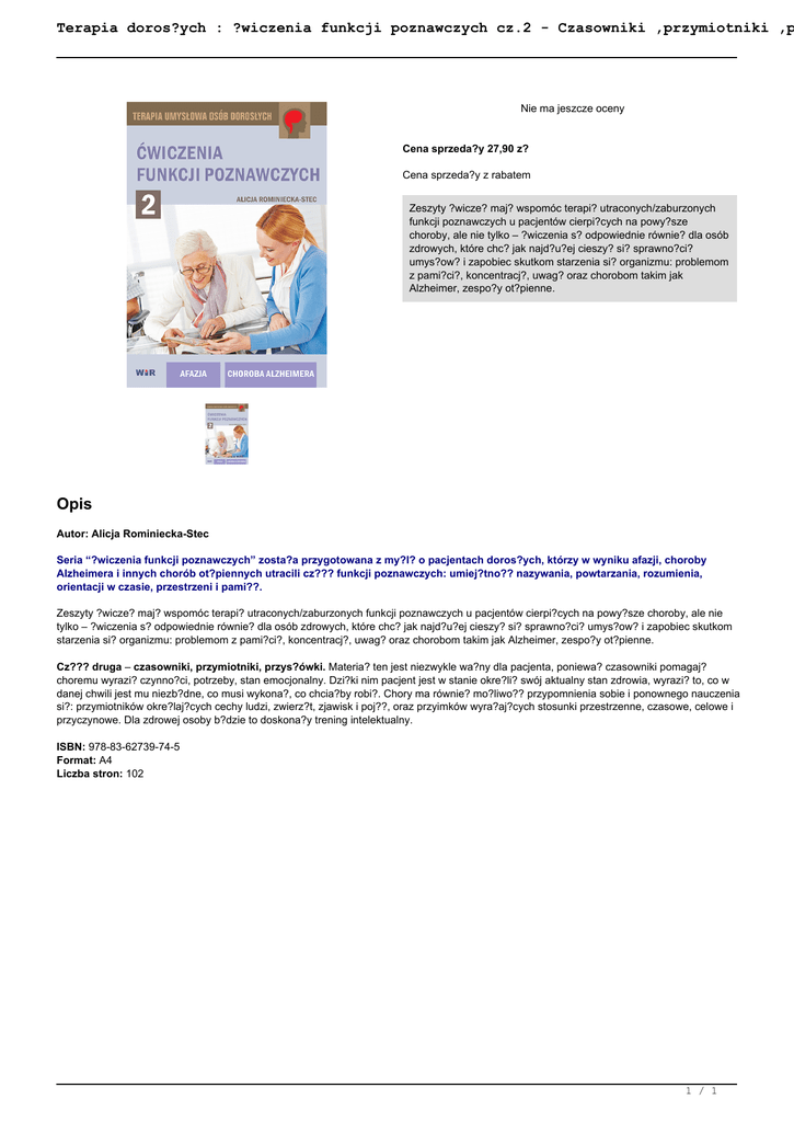 Terapia doros?ych : ?wiczenia funkcji poznawczych cz.2 - Czasowniki ,przymiotniki ,p Nie ma jeszcze oceny Cena sprzeda?y 27,90 z? Cena sprzeda?y z rabatem Zeszyty ?wicze? maj? wspomóc terapi? utraconych/zaburzonych funkcji poznawczych u pacjentów cierpi?cych na powy?sze choroby, ale nie tylko – ?wiczenia s? odpowiednie równie? dla osób zdrowych, które chc? jak najd?u?ej cieszy? si? sprawno?ci? umys?ow? i zapobiec skutkom starzenia si? organizmu: problemom z pami?ci?, koncentracj?, uwag? oraz chorobom takim jak Alzheimer, zespo?y ot?pienne. Opis Autor: Alicja Rominiecka-Stec Seria “?wiczenia funkcji poznawczych” zosta?a przygotowana z my?l? o pacjentach doros?ych, którzy w wyniku afazji, choroby Alzheimera i innych chorób ot?piennych utracili cz??? funkcji poznawczych: umiej?tno?? nazywania, powtarzania, rozumienia, orientacji w czasie, przestrzeni i pami??. Zeszyty ?wicze? maj? wspomóc terapi? utraconych/zaburzonych funkcji poznawczych u pacjentów cierpi?cych na powy?sze choroby, ale nie tylko – ?wiczenia s? odpowiednie równie? dla osób zdrowych, które chc? jak najd?u?ej cieszy? si? sprawno?ci? umys?ow? i zapobiec skutkom starzenia si? organizmu: problemom z pami?ci?, koncentracj?, uwag? oraz chorobom takim jak Alzheimer, zespo?y ot?pienne. Cz??? druga – czasowniki, przymiotniki, przys?ówki. Materia? ten jest niezwykle wa?ny dla pacjenta, poniewa? czasowniki pomagaj? choremu wyrazi? czynno?ci, potrzeby, stan emocjonalny. Dzi?ki nim pacjent jest w stanie okre?li? swój aktualny stan zdrowia, wyrazi? to, co w danej chwili jest mu niezb?dne, co musi wykona?, co chcia?by robi?. Chory ma równie? mo?liwo?? przypomnienia sobie i ponownego nauczenia si?: przymiotników okre?laj?cych cechy ludzi, zwierz?t, zjawisk i poj??, oraz przyimków wyra?aj?cych stosunki przestrzenne, czasowe, celowe i przyczynowe. Dla zdrowej osoby b?dzie to doskona?y trening intelektualny. ISBN: 978-83-62739-74-5 Format: A4 Liczba stron: 102 1 / 1 Powered by TCPDF (www.tcpdf.org)