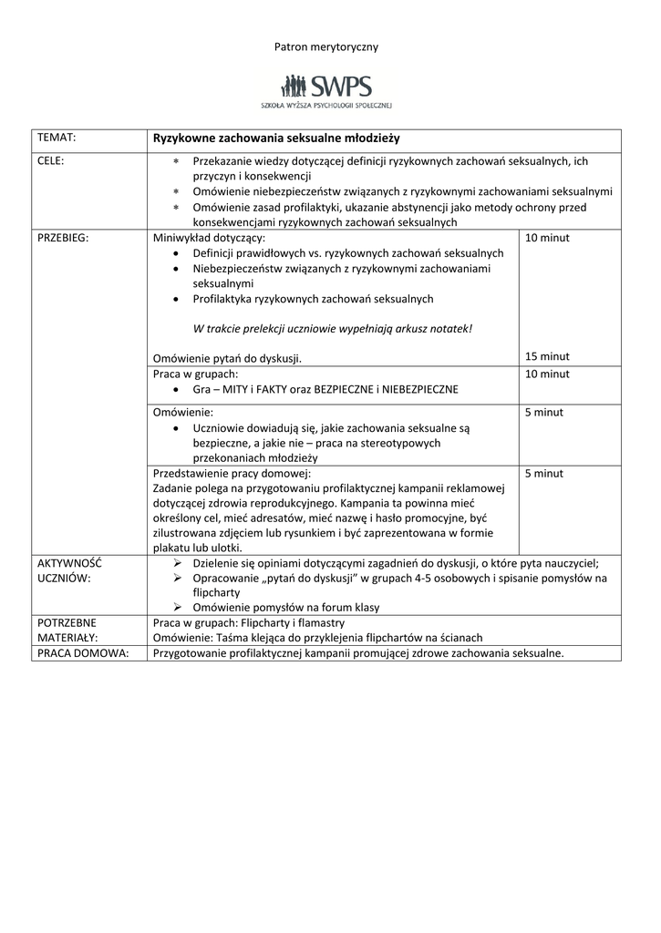 Patron merytoryczny TEMAT: CELE: PRZEBIEG: Ryzykowne zachowania seksualne młodzieży Przekazanie wiedzy dotyczącej definicji ryzykownych zachowań seksualnych, ich przyczyn i konsekwencji Omówienie niebezpieczeństw związanych z ryzykownymi zachowaniami seksualnymi Omówienie zasad profilaktyki, ukazanie abstynencji jako metody ochrony przed konsekwencjami ryzykownych zachowań seksualnych Miniwykład dotyczący: 10 minut Definicji prawidłowych vs. ryzykownych zachowań seksualnych Niebezpieczeństw związanych z ryzykownymi zachowaniami seksualnymi Profilaktyka ryzykownych zachowań seksualnych W trakcie prelekcji uczniowie wypełniają arkusz notatek! Omówienie pytań do dyskusji. Praca w grupach: Gra – MITY i FAKTY oraz BEZPIECZNE i NIEBEZPIECZNE AKTYWNOŚĆ UCZNIÓW: POTRZEBNE MATERIAŁY: PRACA DOMOWA: 15 minut 10 minut Omówienie: 5 minut Uczniowie dowiadują się, jakie zachowania seksualne są bezpieczne, a jakie nie – praca na stereotypowych przekonaniach młodzieży Przedstawienie pracy domowej: 5 minut Zadanie polega na przygotowaniu profilaktycznej kampanii reklamowej dotyczącej zdrowia reprodukcyjnego. Kampania ta powinna mieć określony cel, mieć adresatów, mieć nazwę i hasło promocyjne, być zilustrowana zdjęciem lub rysunkiem i być zaprezentowana w formie plakatu lub ulotki. Dzielenie się opiniami dotyczącymi zagadnień do dyskusji, o które pyta nauczyciel; Opracowanie „pytań do dyskusji” w grupach 4-5 osobowych i spisanie pomysłów na flipcharty Omówienie pomysłów na forum klasy Praca w grupach: Flipcharty i flamastry Omówienie: Taśma klejąca do przyklejenia flipchartów na ścianach Przygotowanie profilaktycznej kampanii promującej zdrowe zachowania seksualne. Patron merytoryczny I. PRAWIDŁOWE VS. RYZYKOWNE ZACHOWANIA SEKSUALNE MŁODZIEŻY Seksualność człowieka towarzyszy mu od początku jego istnienia i na każdym etapie życia charakteryzuje się różnymi formami ekspresji. Wiele zachowań przejawianych przez nastolatków jest naturalnym etapem rozwoju psychoseksualnego, jednak wiele jest takich, które mogą stanowić realne zagrożenie. Zdaniem specjalistów aktywność seksualna młodzieży mieści się w granicach normy, jeżeli: 1 NIE ZABURZA INNYCH ZADAŃ ŻYCIOWYCH Ekspresja seksualna nie powoduje trudności w planowaniu i realizowaniu innych zadań (np. nauki, rozwijania hobby) 2 ZACHOWANIE JEST WŁAŚCIWE DLA DANEGO WIEKU Zachowania seksualne nie występują zbyt wcześnie, (zachowana jest kolejność rozwoju związku: poznawanie się, dotyk, pocałunek, petting, współżycie) 3 POMIĘDZY PARTNERAMI NIE MA ZBYT DUŻEJ RÓŻNICY WIEKOWEJ Ważne by osoby podejmujące aktywność seksualną były na podobnym poziomie rozwoju: intelektualnego, fizycznego, społecznego (może się tak zdarzyć, gdy np. osoba starsza, manipuluje osobą „młodszą” i jej zachowaniami). 4 JEST DOBROWOLNA Na każde zachowanie seksualne, zaangażowana w nie osoba wyraża zgodę. Dobre nigdy nie są zachowania, które zawierają elementy przemocy lub przymusu. 5 PROWADZI DO OSIĄGNIĘCIA CELÓW SEKSUALNYCH Każdy młody człowiek powinien uświadamiać sobie motywację, która kieruje go do podjęcia kontaktów seksualnych i unikać podejmowania aktywności seksualnej z innych powodów (np. chęci zatrzymania przy sobie partnera). 6 NIE NARUSZA ZDROWIA Jest wolne od ryzykownych zachowań mogących prowadzić do chorób lub niepożądanej ciąży W przypadku, gdy któryś z ww. punktów nie jest spełniony, dorastający człowiek zostaje narażony na ryzyko podejmowania niebezpiecznych zachowań seksualnych, których negatywne konsekwencje mogą mieć wpływ na dalszy jego rozwój i przyszłe życie seksualne. Do ryzykownych zachowań seksualnych, seksuolodzy zaliczają: (Uczniowie notują na Karcie Notatek) Kontakty seksualne bez zabezpieczenia Kontakty seksualne z wieloma partnerami/ gry seksualne Przygodne kontakty seksualne z nieznajomymi osobami Kontakty seksualne pod wpływem alkoholu/ narkotyków Kontakty seksualne ze starszymi osobami Kontakty seksualne za wynagrodzenie (tzw. sponsoring) Patron merytoryczny II. KONSEKWENCJE RYZYKOWNYCH ZACHOWAŃ SEKSUALNYCH Wśród konsekwencji ryzykownych zachowań seksualnych wymienia się takie, które mogą mieć negatywne konsekwencje zarówno w sferze emocjonalnej, jak i zdrowotnej: Choroby przenoszone drogą płciową Niechciane ciąże Rozczarowanie, wstyd, niechęć do seksu Pytania do dyskusji (nauczyciel powinien najpierw wysłuchać opinii uczniów, a potem powiedzieć jak jest naprawdę i dlaczego): Będziemy zajmować się dziś dwoma pojęciami: ABSTYNENCJA i PROMISKUITYZM ABSTYNENCJA jest jedynym w 100% skutecznym sposobem uniknięcia niepożądanych skutków współżycia seksualnego w okresie dojrzewania. 1. Co Waszym zdaniem oznacza to pojęcie? Nauczyciel zapisuje opinie uczniów. Jeżeli wśród odpowiedzi nie pojawiają się poniże kwestie, należy wyraźnie zapisać je na tablicy i przedyktować uczniom do Karty Notatek. a. ABSTYNENCJA jest świadomą i dobrowolną decyzją dotyczącą unikania lub nie robienia czegoś. Ludzie decydują się na abstynencję w wielu sytuacjach: rezygnując z alkoholu, papierosów lub innych używek; mięsa; słodyczy; niektórych form aktywności seksualnej. b. ABSTYNENCJA wynika z wielu powodów: zdrowotnych (dlatego np. stosujemy diety); przekonań religijnych (np. unikając mięsa lub alkoholu, czekając ze współżyciem do zawarcia związku małżeńskiego); z powodu lęku (przed negatywnymi konsekwencjami lub karą). c. Ludzie definiują ABSTYNENCJĘ SEKSUALNA na różne sposoby: a. Niektórzy uważają, że abstynencja oznacza całkowity brak kontaktów seksualnych – unikanie intymnego dotyku, pocałunków, przytulania. b. Inni uważają, że polega ona na unikaniu współżycia seksualnego w okresie adolescencji – aż do momentu zawarcia stałego związku. c. Wielu sądzi, że oczekiwanie abstynencji od osób nastoletnich jest nierealn