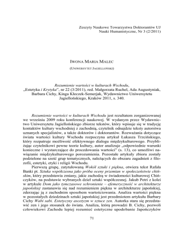 Zeszyty Naukowe Towarzystwa Doktorantów UJ Nauki Humanistyczne, Nr 3 (2/2011) IWONA MARIA MALEC (UNIWERSYTET JAGIELLOŃSKI) Rozumienie wartości w kulturach Wschodu, „Estetyka i Krytyka”, nr 22 (3/2011), red. Małgorzata Ruchel, Ada Augustyniak, Barbara Cichy, Kinga Kłeczek-Semerjak, Wydawnictwo Uniwersytetu Jagiellońskiego, Kraków 2011, s. 340. Rozumienie wartości w kulturach Wschodu jest rezultatem zorganizowanej we wrześniu 2009 roku konferencji naukowej. W wydanym przez Wydawnictwo Uniwersytetu Jagiellońskiego zbiorze tekstów, który wpisuje się w tradycję kontaktów kultury wschodniej z zachodnią, czytelnik odnajdzie teksty autorstwa uznanych specjalistów, a także doktorów i doktorantów. Rozważania dotyczące świata wartości kultury Wschodu rozpoczyna artykuł Łukasza Trzcińskiego, który rozpatruje możliwość efektywnego dialogu międzykulturowego. Przybliżając czytelnikowi pewne teorie kultury, autor analizuje „odpowiednie warunki konieczne i wystarczające do procedowania wartości” (s. 13), co umożliwi nawiązanie międzykulturowego porozumienia. Pozostałe artykuły zbioru zostały podzielone na sześć grup tematycznych, należących do obszaru zagadnień z filozofii, estetyki, etyki i religii Wschodu. Pierwszą grupę, zatytułowaną Wokół sztuki i piękna, otwiera tekst Rafała Banki pt. Sztuka współczesna jako próba oceny przemian w społeczeństwie chińskim, który przedstawia zmiany, jakie zachodzą w świadomości kulturowej Chińczyków, na podstawie wybranych dzieł sztuki współczesnej. Jakub Petri z kolei w artykule Dom jako tymczasowe schronienie – efemeryczność w architekturze japońskiej zastanawia się nad rozumieniem piękna w architekturze japońskiej, zderzając ją z zachodnim sposobem wartościowania. Analiza wartości piękna w pozostałych dziedzinach sztuki japońskiej jest przedmiotem artykułu Barbary Cichy Wabi sabi. Estetyczny ascetyzm w sztuce zen. Autorka stara się przedstawić zen i jego stosunek do świata. Analiza, którą prowadzi B. Cichy, pozwoli człowiekowi Zachodu lepiej rozumieć estetyczne upodobanie Japończyków 71 Iwona Maria Malec __________________________________________________________________________________________________________________________________________________________________________________________________________________________________ do przedmiotów niedoskonałych. Ostatni artykuł tej części, autorstwa Vlatislava Matouška, dotyczy muzyki i jej roli na drodze do wyzwolenia w tradycji zen. Artykuł ten z punktu widzenia muzykologii tłumaczy współczesne trendy muzyczne w religii japońskiej i praktyce medytacji. Teksty zamieszczone w drugiej grupie łączy zagadnienie etyki. Pierwszy w kręgu rozważań etycznych jest tekst Beaty Szymańskiej O bezwartościowych wartościach, w którym autorka omawia postulat nieoceniania – charakterystyczną postawę rozumienia świata wartości przez buddyzmu chan i zen. Źródła tybetańskiej etyki Joanny Greli to artykuł, który pozwoli poznać poglądy społeczności tybetańskiej na naturę świata, jej podejście do kwestii dobra i zła, a także pozwoli lepiej zrozumieć jej niejednorodny system wartościowania. Szczegółowiej temat etyki wschodniej podejmuje w swoim artykule Prawda metafizyki – prawda etyki. Problem etycznego statusu człowieka na gruncie filozofii Śankary Kinga Kłeczek-Semerjak. Prowadzi w nim rozważania nad problemami etycznymi, nad sensem ludzkiej egzystencji w filozofii indyjskiej. Ostatnim artykułem z kręgu rozważań etycznych jest tekst Marty Kudelskiej Determinizm – wolność – konieczność w ortodoksyjnej myśli indyjskiej, w którym autorka analizuje tytułowe pojęcia na gruncie metafizyki filozofii indyjskiej. Kolejna grupa tekstów dotyczy społecznego wymiaru jednostki. Czytelnik odnajdzie tu trzy artykuły: Pawła Sajdka Rytuał u Xunzi, Svena Sellmera Indyjski schemat „celów człowieka” oraz Leszka Sosnowskiego Natura – ciało – kultura. Uwagi na temat Japonii. Pierwszy analizuje zagadnienia rytuału, obrzędowości z punktu widzenia filozofii konfucjańskiej. W drugim autor rozpatruje dogłębnie cele życia ludzkiego z punktu widzenia kultury indyjskiej. Trzeci, natomiast przenosi nas do Japonii. Autor ukazuje w nim odmienną od zachodniej relację Japończyków do natury, do cielesności własnej i innego, co stanowi ważną część japońskiej tożsamości kulturowej. Artykuły zamieszczone w grupie zatytułowanej Człowiek w perspektywie religijnej dotyczą w dużej mierze relacji człowieka do bóstw, sposobu percepcji bóstwa w odniesieniu do tradycji islamu, hinduizmu i buddyzmu. Tę część otwiera artykuł Przemysława Piekarskiego Po to bóg przestał być człowiekiem, żeby człowiek stał się bogiem. Horyzontalny wymiar nirgunicznego bhakti, pokazujący przeobrażenie postawy religijnej w indyjskim średniowieczu i rozumienie Boga i człowieka na podstawie poezji bhakti. Rozumienie natury ludzkiej i analizę żeńskiego pierwiastka każdej istoty ludzkiej na płaszczyźnie tybetańskiego buddyzmu odnajdziemy w artykule Karoliny Pospisilovej The Female Wisdom. The Female Aspect in Buddhism. Dwa kolejne artykuły, a zarazem ostanie w tym zestawieniu, to różne ujęcia interpretacji myśli Shinrana. Maciej Kanert w artykule Pojęcie „wiary” u Shinrana pyta o związek wiary jako daru Amidy z wolnością człowieka w kontekście koncepcji religijnej japońskiego filozofa. Robert Szuksztul z kolei w artykule O darze i obdarowanym, czyli problem z soteriologią Shinrana zastanawia się, dlaczego tak niewielu osiąga wyzwolenie, skoro jest ono „uzależnione od mocy Amidy, w której mogą partycypować wszystkie istoty” (s. 205). 72 „Rozumienie wartości w kulturach Wschodu” – recenzja ________________________________________________________________________________________________________________________________________________________________