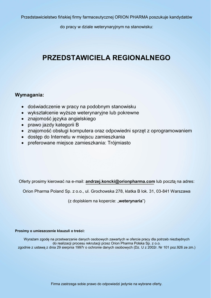 Przedstawicielstwo fi skiej firmy farmaceutycznej ORION PHARMA poszukuje kandydatów do pracy w dziale weterynaryjnym na stanowisku: PRZEDSTAWICIELA REGIONALNEGO Wymagania: do wiadczenie w pracy na podobnym stanowisku wykszta cenie wy sze weterynaryjne lub pokrewne znajomo j zyka angielskiego prawo jazdy kategorii B znajomo obs ugi komputera oraz odpowiedni sprz t z oprogramowaniem dost p do Internetu w miejscu zamieszkania preferowane miejsce zamieszkania: Trójmiasto Oferty prosimy kierowa na e-mail: [email protected] lub poczt na adres: Orion Pharma Poland Sp. z o.o., ul. Grochowska 278, klatka B lok. 31, 03-841 Warszawa (z dopiskiem na kopercie: „weterynaria”) Prosimy o umieszczenie klauzuli o tre ci: Wyra am zgod na przetwarzanie danych osobowych zawartych w ofercie pracy dla potrzeb niezb dnych do realizacji procesu rekrutacji przez Orion Pharma Polska Sp. z o.o. zgodnie z ustaw z dnia 29 sierpnia 1997r o ochronie danych osobowych (Dz. U z 2002r. Nr 101 poz.926 ze zm.) Firma zastrzega sobie prawo do odpowiedzi jedynie na wybrane oferty.