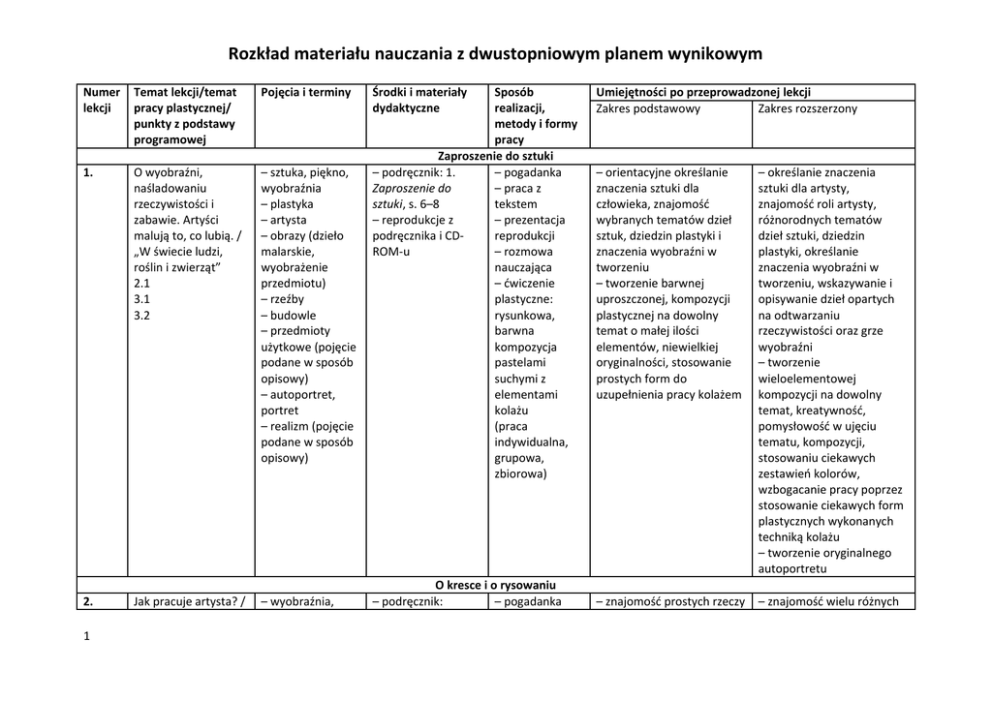 Rozkład materiału nauczania z dwustopniowym planem wynikowym Numer lekcji Temat lekcji/temat pracy plastycznej/ punkty z podstawy programowej Pojęcia i terminy 1. O wyobraźni, naśladowaniu rzeczywistości i zabawie. Artyści malują to, co lubią. / „W świecie ludzi, roślin i zwierząt” 2.1 3.1 3.2 – sztuka, piękno, wyobraźnia – plastyka – artysta – obrazy (dzieło malarskie, wyobrażenie przedmiotu) – rzeźby – budowle – przedmioty użytkowe (pojęcie podane w sposób opisowy) – autoportret, portret – realizm (pojęcie podane w sposób opisowy) 2. Jak pracuje artysta? / – wyobraźnia, 1 Środki i materiały dydaktyczne Sposób realizacji, metody i formy pracy Zaproszenie do sztuki – podręcznik: 1. – pogadanka Zaproszenie do – praca z sztuki, s. 6–8 tekstem – reprodukcje z – prezentacja podręcznika i CDreprodukcji ROM-u – rozmowa nauczająca – ćwiczenie plastyczne: rysunkowa, barwna kompozycja pastelami suchymi z elementami kolażu (praca indywidualna, grupowa, zbiorowa) O kresce i o rysowaniu – podręcznik: – pogadanka Umiejętności po przeprowadzonej lekcji Zakres podstawowy Zakres rozszerzony – orientacyjne określanie znaczenia sztuki dla człowieka, znajomość wybranych tematów dzieł sztuk, dziedzin plastyki i znaczenia wyobraźni w tworzeniu – tworzenie barwnej uproszczonej, kompozycji plastycznej na dowolny temat o małej ilości elementów, niewielkiej oryginalności, stosowanie prostych form do uzupełnienia pracy kolażem – określanie znaczenia sztuki dla artysty, znajomość roli artysty, różnorodnych tematów dzieł sztuki, dziedzin plastyki, określanie znaczenia wyobraźni w tworzeniu, wskazywanie i opisywanie dzieł opartych na odtwarzaniu rzeczywistości oraz grze wyobraźni – tworzenie wieloelementowej kompozycji na dowolny temat, kreatywność, pomysłowość w ujęciu tematu, kompozycji, stosowaniu ciekawych zestawień kolorów, wzbogacanie pracy poprzez stosowanie ciekawych form plastycznych wykonanych techniką kolażu – tworzenie oryginalnego autoportretu – znajomość prostych rzeczy – znajomość wielu różnych „Wśród gałązek, krzewów i pajęczyn” 1.2 2.1 3.1 wyobrażenie – obraz (dzieło malarskie) – malarz – rysunek – kreska – podstawowe przybory i materiały rysunkowe (kredki, ołówek, pióro, papier) – pracownia 2. Bogactwo natury a narzędzia sztuki, s. 10–11 – zeszyt ćwiczeń: 1. Kreska może zmieniać swoją postać – reprodukcje z podręcznika i CDROM-u – film z DC-ROM-u – prezentacja i omówienie reprodukcji – praca z tekstem – rozmowa nauczająca – ćwiczenie plastyczne: linearna, rysunkowa kompozycja wybranymi narzędziami – prezentacja i omówienie prac uczniów (praca indywidualna, zbiorowa) w naturze przypominających kreskę – określanie związku używanego narzędzia z różnorodnością uzyskiwanych kresek w rysunku na podstawie własnej twórczości i wybranego dzieła plastycznego – posługiwanie się kilkoma rodzajami zróżnicowanych kresek w rysunku – znajomość wybranych narzędzi z pracowni artysty i ich zastosowania – tworzenie prostej, linearnej kompozycji plastycznej przedstawiającej naturę, przedmioty zbliżone kształtem do kreski, praca o niewielkim stopniu oryginalności rzeczy w naturze przypominających kreskę – określanie wpływu używanego narzędzia na tworzenie różnorodnych kresek w rysunku, określanie charakteru kresek we własnych pracach i opisywanie ich w różnych poznanych dziełach plastycznych – posługiwanie się wieloma rodzajami zróżnicowanych kresek w rysunku dostosowanymi do przedstawianych przedmiotów, umiejętność różnicowania formy i charakteru kresek, dobre wykorzystywanie możliwości określonych narzędzi podczas tworzenia różnych linii – tworzenie oryginalnej, wieloelementowej kompozycji linearnej inspirowanej naturą, przedstawiającej przedmioty zbliżone formą do kreski – trafne oddawanie kreską formy i charakteru przedstawianych obiektów 3. Teatr cieni. / „O kocie i jego wąsach – zwierzęta domowe i dzikie” lub „W gospodarstwie wiejskim, ogrodzie zoologicznym i cyrku” 2.1 3.1 3.2 – kreska – kontur – rysunek – rysunek konturowy – przybory rysunkowe, techniki rysunku – podręcznik: 3. Kreska jako kontur, s. 12–13 – zeszyt ćwiczeń: 2. Kreska pomoże ci wyrazić siebie – ilustracje z podręcznika i CDROM-u – lampa biurowa – albumy ze zdjęciami zwierząt – pogadanka – ćwiczenie – prezentacja i omówienie reprodukcji – rozmowa nauczająca – praca z tekstem – ćwiczenie plastyczne: linearna kompozycja wybranym narzędziem, wycinanka – prezentacja i omówienie prac uczniów (praca indywidualna lub/i grupowa, zbiorowa) – znajomość pojęcia konturu, narysowanie określonych przedmiotów za pomocą rysunku konturowego – wskazywanie konturu w wybranym dziele plastycznym – zakomponowanie prostej, typowej pracy plastycznej na określony temat, posługiwanie się konturem, kreską wykonaną różnymi narzędziami, umieszczenie niewielkiej ilości elementów w kompozycji – znajomość wybranych cech przedstawianych zwierząt i ich otoczenia 4. Kreska jako środek wyrazu – kreska – kreska jako – podręcznik: 4. Kreska jako środek – pogadanka – prezentacja i – tworzenie za pomocą kreski napisu, którego – znajomość pojęcia konturu, rozumienie abstrakcyjnego charakteru tego pojęcia, określanie konturów różnorodnych przedmiotów, szkicowanie konturów różnymi narzędziami – wskazywanie różnorodnego sposobu posługiwania się konturem przez artystów – zakomponowanie wieloelementowej, oryginalnej i nietypowej kompozycji plastycznej na zadany temat, posługiwanie się konturem, ciekawą kreską wykonaną różnymi narzędziami – inspirowanie się naturą, oddawanie najbardziej charakterystycznych cech zwierząt i ich otoczenia w pracy plastycznej – posługiwanie się konturem 