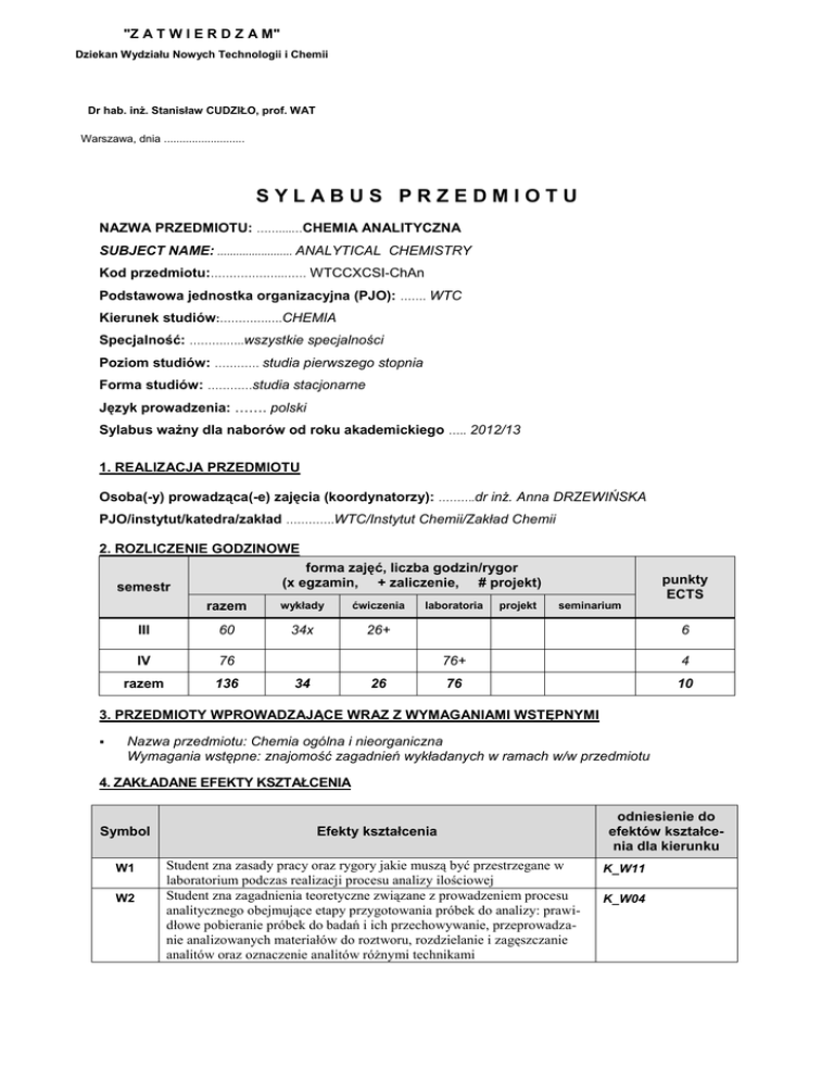 "Z A T W I E R D Z A M" Dziekan Wydziału Nowych Technologii i Chemii Dr hab. inż. Stanisław CUDZIŁO, prof. WAT Warszawa, dnia .......................... SYLABUS PRZEDMIOTU NAZWA PRZEDMIOTU: ……....…CHEMIA ANALITYCZNA SUBJECT NAME: ........................ ANALYTICAL CHEMISTRY Kod przedmiotu:………………..…… WTCCXCSI-ChAn Podstawowa jednostka organizacyjna (PJO): ……. WTC Kierunek studiów:………….….CHEMIA Specjalność: ……….…..wszystkie specjalności Poziom studiów: ………… studia pierwszego stopnia Forma studiów: …………studia stacjonarne Język prowadzenia: ……. polski Sylabus ważny dla naborów od roku akademickiego ….. 2012/13 1. REALIZACJA PRZEDMIOTU Osoba(-y) prowadząca(-e) zajęcia (koordynatorzy): ……….dr inż. Anna DRZEWIŃSKA PJO/instytut/katedra/zakład ………….WTC/Instytut Chemii/Zakład Chemii 2. ROZLICZENIE GODZINOWE forma zajęć, liczba godzin/rygor (x egzamin, + zaliczenie, # projekt) semestr razem wykłady ćwiczenia III 60 34x 26+ IV 76 razem 136 34 laboratoria 26 projekt punkty ECTS seminarium 6 76+ 4 76 10 3. PRZEDMIOTY WPROWADZAJĄCE WRAZ Z WYMAGANIAMI WSTĘPNYMI Nazwa przedmiotu: Chemia ogólna i nieorganiczna Wymagania wstępne: znajomość zagadnień wykładanych w ramach w/w przedmiotu 4. ZAKŁADANE EFEKTY KSZTAŁCENIA Symbol W1 W2 Efekty kształcenia Student zna zasady pracy oraz rygory jakie muszą być przestrzegane w laboratorium podczas realizacji procesu analizy ilościowej Student zna zagadnienia teoretyczne związane z prowadzeniem procesu analitycznego obejmujące etapy przygotowania próbek do analizy: prawidłowe pobieranie próbek do badań i ich przechowywanie, przeprowadzanie analizowanych materiałów do roztworu, rozdzielanie i zagęszczanie analitów oraz oznaczenie analitów różnymi technikami odniesienie do efektów kształcenia dla kierunku K_W11 K_W04 W3 W4 W5 W6 U1 U2 U3 U4 U5 U6 K1 Student zna teoretyczne podstawy klasycznych metod analitycznych: metody grawimetryczne – analiza wagowa; metody analizy objętościowej – alkacymetria, kompleksometria, redoksometria, analiza strąceniowa. Student zna podstawy i możliwości analityczne podstawowych metod instrumentalnych wykorzystywanych w analizie ilościowej: metody spektroskopowe – spektrofotometria UV-VIS, absorpcyjna spektrometria atomowa, fotometria płomieniowa, spektrografia emisyjna ICP-AES; metody elektroanalityczne – potencjometria, polarografia; podstawowe metody chromatograficzne Student zna podstawowe metody wydzielania i rozdzielania składników z próbek złożonych: metody ekstrakcyjne, metody oparte na wymianie jonowej, metody oparte na lotności substancji Student zna podstawowe rodzaje błędów popełnianych w ilościowej analizie chemicznej i przyczyny ich powstawania Student umie przeprowadzić obliczenia stechiometryczne w zakresie wykonywanych oznaczeń ilościowych Student potrafi ocenić uzyskany wynik analizy ilościowej z punktu widzenia dokładności i precyzji Student umie przeprowadzić podstawowe oznaczenia ilościowe stosując metody analizy klasycznej. Student umie wykorzystać podstawowy sprzęt laboratoryjny w prowadzonym procesie analitycznym. Student ma umiejętność wykonania analizy ilościowej w oparciu o opracowaną procedurę analityczną Student ma umiejętność poszerzania wiedzy w oparciu o umiejętność korzystania z literatury naukowej, odpowiednich norm i aktów prawnych Student potrafi współdziałać w grupie K_W04 K_W04 K_W04 K_W04 K_U02 K_U02 K_U03 K_U11 K_U03 K_U07 K_K02 5. METODY DYDAKTYCZNE Wykład przedstawiony w formie audiowizualnej (slajdy w programie Power Point - fragmenty wykładu przekazywane studentom w formie materiałów wykładowych), okresowo prowadzone repetycje podsumowujące wyłożony materiał aktywujące dyskusję studentów, analiza literatury przez studentów. Ćwiczenia audytoryjne obejmujące obliczenia rachunkowe związane z oznaczeniami ilościowymi analitów metodami analizy klasycznej (wagowej i objętościowej), zajęcia komputerowe obejmujące zagadnienia związane z zastosowaniem programu EXCEL w obliczeniach analitycznych. Zajęcia laboratoryjne mające na celu praktyczne wykonywanie przez studentów analiz ilościowych metodami klasycznymi oraz wybranymi metodami instrumentalnymi omawianymi w kursie wykładu. 6. TREŚCI PROGRAMOWE lp temat/tematyka zajęć 1. Wprowadzenie do przedmiotu - chemia analityczna Ogólna charakterystyka przedmiotu. Podstawowe metody analityczne i ich klasyfikacja. Zasady pracy w laboratorium, sprzęt laboratoryjny, odczynniki i roztwory. 2. 3. Chemiczne metody analizy - wprowadzenie. Reakcje analityczne stanowiące podstawę klasycznych metod analizy – metody grawimetryczne i miareczkowe. Alkacymetryczne metody analizy. liczba godzin wykł. ćwicz. lab. 5 18 2 2 5 proj. semin. Definicje kwasu i zasady wg różnych teorii, równowagi wymiany protonu wg teorii Brönsteda, roztwory wodne kwasów i zasad, rola rozpuszczalnika, rodzaje reakcji kwas- zasada, rola roztworów buforowych, metody analizy ilościowej oparte na reakcji kwas – zasada, krzywe miareczkowania, wskaźniki PK miareczkowania alkacymetrycznego. Zastosowanie metod alkacymetrycznych. Obliczanie wyników analiz. 4. 5. 6. 7. 8. 9. 10. 11. 12. 13. Analiza kompleksometryczna Teoretyczne podstawy reakcji tworzenia związków kompleksowych i ich klasyfikacja, własności kompleksów, kompleksometria i wskaźniki stosowane w kompleksometrii. Techniki miareczkowania kompleksometrycznego. Obliczanie wyników analiz. Redoksometryczne metody miareczkowe. Równowagi w układach redoks, sterowanie przebiegiem tych reakcji, wpływ środowiska, wskaźniki PK reakcji redoks. Zastosowanie redoksometrycznych metod oznaczania. Obliczanie wyników analiz. Reakcje strącania związków trudno rozpuszczalnych Produkt rozpuszczenia (iloczyn rozpuszczalności). Osady w analizie wagowej; miareczkowa analiza strąceniowa, wskaźniki PK miareczkowania. Obliczan