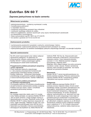 Estrifan SN 60 T Zaprawa jastrychowa na bazie cementu Właściwości produktu: •jednokomponentowa – wystarczy wymieszać z wodą •modyfikowana polimerem •o niewielkim skurczu •możliwość pompowania pompami typu miksokret •możliwość szybkiego oddania do użytku •łatwa do wygładzenia, zarówno ręcznie jak i przy użyciu mechanicznych zacieraczek •po stwardnieniu mrozoodporna •klasa wytrzymałości wg EN 18813 do CT-C40-F6 •do warstw o grubości od 10 mm do 60 mm Zastosowanie produktu: •wyrównywanie powierzchni posadzek z jastrychu cementowego i betonu •wyrównywanie i wykonywanie jastrychu na powierzchniach pochyłych np. rampy •wykonywanie jastrychu na warstwie rozdzielającej i jastrychu zespolonego wewnątrz i na zewnątrz budynków Sposób zastosowania: Na 24h przed rozpoczęciem prac należy wyłączyć ogrzewanie podłogowe. W zależności od przeznaczenia i obszaru zastosowania zaprawy Estrifan SN 60 T należy przestrzegać ogólnie obowiązujących zasad sztuki budowlanej. Przygotowanie podłoża pod jastrych zespolony i prace naprawcze Przed ułożeniem jastrychu zespolonego w celu poprawy przyczepności konieczne jest zastosowanie mineralnej warstwy sczepnej Estrifan Haftbrücke. Wskazówki dotyczącego prawidłowego przygotowania podłoża znajdują się w karcie technicznej produktu Estrifan Haftbrücke. Przygotowanie podłoża pod jastrych na warstwie antyadhezyjnej W przypadku jastrychu na warstwie antyadhezyjnej nie jest konieczne zastosowanie warstwy sczepnej. Podłoże musi być równe, nośne i umożliwiać naniesienie jednorodnej warstwy. Mieszanie Do czystego pojemnika należy wlać 2,3 l czystej wody. Należy pamiętać, że zaprawa Estrifan SN 60 T jest na bazie cementu i mogą wystąpić różnice w zapotrzebowaniu na wodę. Zawartość worka 25 kg (Estrifan SN 60 T) należy stopniowo wsypywać do wody, ciągle mieszając. Najlepiej do tego celu użyć mieszadła wolnoobrotowego (max 400 obr./min.). Optymalne są mieszadła z dwoma przeciwbieżnie obracającymi się łopatkami np. Beba Mischer B7, Collomix RGE 162 Duo itp. Dopuszczalne jest również mieszanie w betoniarce o przymusowym mieszaniu zarobu. Czas mieszania powinien wynosić 2- 3 min. Materiał powinien osiągnąć konsystencję „wilgotnej ziemi”. Materiału, który zdążył związać nie wolno ponownie rozrabiać z wodą i używać. Świeżo naniesionej zaprawy, która zaczęła już twardnieć nie można zacierać ani ponownie obrabiać. Nanoszenie Estrifan SN 60 T nanosi się jednowarstwowo na świeżą warstwę sczepną. Podczas zastosowania zaprawy Estrifan SN 60 T temperatura podłoża i otoczenia musi wynosić minimum +5°C. Pielęgnacja Świeżo nałożoną zaprawę Estrifan SN 60 T podczas procesu wiązania należy chronić przed wszelkiego rodzaju czynnikami zewnętrznymi (np. przeciągami, bezpośrednim nasłonecznieniem, dużymi wahaniami temperatury, wilgocią, zbyt wczesną eksploatacją). W wyniku obciążenia wilgocią, spowodowanym np. deszczem lub rosą materiału nie w pełni związanego może dojść do powstania jasnych przebarwień na powierzchni. Ogrzewanie podłogowe można uruchomić dopiero po całkowitym związaniu zaprawy, tj. po 28 dniach. Temperaturę zasilania można zwiększać każdego dnia o maksimum 5 °C. Po 3 dniach utrzymania maksymalnej temp. zasilania należy stopniowo ją redukować. 1 MC-Bauchemie • ul. Prądzyńskiego 20 • 63-000 Środa Wlkp. • Tel. 61 28 64 500 • Fax: 61 28 64 514 [email protected] • www.mc-bauchemie.pl Dane techniczno-użytkowe produktu Estrifan SN 60 T: Parametr Jednostka miary Gęstość świeżej zaprawy g/cm 3 Ilość wody Uwagi ok. 2,15 l ok. 2,3 na worek 25 kg mm 10 - 60 jednowarstwowo kg/m²/mm ok. 2 Grubość warstwy Zużycie Wartość Możliwość obciążenia ruchem pieszym* h ok. 24 Temperatura podczas zastosowania °C ≥ +5 do < 30 min. ok. 30 przy temp. 20°C i wilgotności względnej 50% Czas urabialności* przy temp. 20°C i wilgotności względnej 50% Wytrzymałość na ściskanie* po 48 h po 7 dniach po 28 dniach N/mm² ok. 25,0 ok. 35,0 minimum 45,0 przy temp. 20°C i wilgotności względnej 50% Wytrzymałość na rozciąganie przy zginaniu* po 48 h po 7 dniach po 28 dniach N/mm² przy temp. 20°C i wilgotności względnej 50% ok. 4,0 ok. 5,0 minimum 6,8 cm³/50 cm² < 15 A 15 Przyczepność przy rozciąganiu N/mm² minimum 1,5 B 1,5 Skurcz mm/m < 0,6 Klasyfikacja reakcji na ogień A1fl – s1 Odporność na sole odladzające nie Odporność na zmiany temperatury tak Odporność na cykle zamarzania - odmarzania tak Odporność na ścieranie wg Böhme przy temp. 20°C i wilgotności względnej 50% zawartość części organicznych < 1% * niskie temperatury spowalniają, wysokie przyspieszają proces twardnienia Właściwości produktu Estrifan SN 60 T: Zakładowa Kontrola Produkcji wg ISO 9001:2008 Barw szara Postać proszek Sposób dostawy worek 25 kg (1 paleta – 40 worków po 25 kg) Warunki przechowywania Przechowywać w szczelnie zamkniętych opakowaniach przez okres 12 miesięcy w suchych pomieszczeniach. Chronić przed przemarzaniem. Usuwanie odpadów W trosce o środowisko naturalne opakowania należy dokładnie opróżniać. Uwaga! Informacje zawarte w niniejszej karcie technicznej wynikają z naszych doświadczeń i dotychczasowej wiedzy, nie są jednak wiążące. Należy je dostosować do konkretnego obiektu budowlanego, celu zastosowania oraz rzeczywistych warunków, oczekiwanych w miejscu zastosowania. Oznacza to, że odpowiadamy za poprawność tych danych w ramach naszych Ogólnych Warunków Sprzedaży. Wszystkie zalecenia naszych pracowników, odbiegające od danych, zawartych w naszych kartach technicznych są dla nas tylko wtedy wiążące, gdy zostaną potwierdzone pisemnie. W każdym przypadku należy przestrzegać ogólnie obowiązujących zasad sztuki budowlanej. Wydanie 05/14. Ta karta została zaktualizowana. Tym samym wszystkie dotychczasowe jej wydani