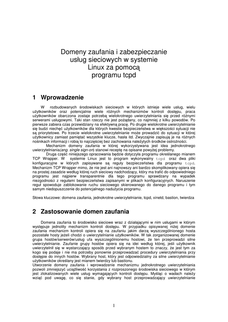 Słowa kluczowe: domena zaufania, jednokrotne uwierzytelnianie, tcpd, xinetd, bastion, twierdza