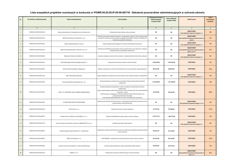 Lista wszystkich projektów ocenianych w konkursie nr POWR.05.02.00-IP.05-00-007/16 - Szkolenia pracowników administracyjnych w ochronie zdrowia Lp. Nr wniosku o dofinansowanie Nazwa wnioskodawcy Tytuł projektu Wnioskowana kwota dofinansowania projektu (PLN) Koszt całkowity projektu (PLN) 1 2 3 4 5 6 1. POWR.05.02.00-00-0014/16 Wyższa Szkoła Biznesu i Przedsiębiorczości w Ostrowcu Św. Profesjonalna kadra systemu ochrony zdrowia ND ND 2. POWR.05.02.00-00-0015/16 MM Poland Maszyny Standardy Sp. z o.o. Szkolenie pracowników administracyjnych i zarządzających szpitali w zakresie efektywnego zarządzania aparaturą medyczną gwarantującego wysoką jakość usług oraz efektywność ekonomiczną placówki medycznej. ND ND 3. POWR.05.02.00-00-0016/16 Wyższa Szkoła Bankowa w Toruniu Studia podyplomowe Zarządzanie i kontrola w podmiotach leczniczych ND ND Wynik oceny Liczba przyznanych punktów 7 8 NEGATYWNY brak spełnienia kryterium dostępu nr 1 ND NEGATYWNY brak spełnienia kryeriów merytorycznych w pkt 4.3 NEGATYWNY brak spełnienia kryterium dostępu nr 1 71,5 ND NEGATYWNY 4. POWR.05.02.00-00-0017/16 Agencja Usług Oświatowych "Omnibus" Sp. z o.o. Podniesienie kwalifikacji pracowników ochrony zdrowia kluczem do wdrożenia rozwiązań projakościowych w placówkach medycznych ND ND 5. POWR.05.02.00-00-0018/16 Medycyna Praktyczna-Szkolenia s.c. Sprawnie zarządzany system ochrony zdrowia - szkolenia dla kadr służb ochrony zdrowia ND ND 6. POWR.05.02.00-00-0019/16 Dolnośląska Agencja Rozwoju Regionalnego S. A. Kompetentni pracownicy systemu ochrony zdrowia 1 860 184,00 1 904 184,00 POZTYWNY 111 7. POWR.05.02.00-00-0020/16 Wyższa Szkoła Gospodarki w Bydgoszczy Program rozwoju kadr w ochronie zdrowia kluczem do wzrostu jakości usług medycznych 881 342,00 908 600,00 POZTYWNY 101,5 8. POWR.05.02.00-00-0021/16 EMAT HRC Elżbieta Matysiak Nowe kompetencje zarządcze w ochronie zdrowia w woj. lubuskim, śląskim, wielkopolskim ND ND 9. POWR.05.02.00-00-0022/16 Prometriq Akademia Zarządzania Sp. z o.o. Rozwój kompetencji analitycznych pracowników drogą do doskonałości placówek medycznych 1 564 500,00 1 617 000,00 POZTYWNY 109 917 850,00 949 250,00 POZTYWNY 109,5 brak spełnienia kryeriów merytorycznych w pkt 4.1, 4.3 i V NEGATYWNY brak spełnienia kryterium dostępu nr 1 NEGATYWNY brak spełnienia kryterium dostępu nr 1 57,5 ND ND 10. POWR.05.02.00-00-0023/16 ARTE IT S.C. KRZYSZTOF SKUZA i ROBERT NIEWIADOWSKI Rozwój kompetencji zawodowych z zakresu zarządzania, doskonalenia zdolności analitycznych, audytu wewnętrznego w jednostkach systemu ochrony zdrowia przez personel podmiotów leczniczych – kadra administracyjna, zarządzająca i medyczna pełniąca funkcje administracyjne oraz pracowników jednostek samorządu terytorialnego odpowiedzialnych za nadzór nad podmiotami leczniczymi 11. POWR.05.02.00-00-0024/16 FIC-SZKOLENIA IGNACY CHRUSZCZYŃSKI Szkolenia pracowników administracyjnych i zarządzających podmiotami leczniczymi w celu poprawy jakości usług zdrowotnych ND ND 12. POWR.05.02.00-00-0025/16 QS Zurich Sp. z o.o. Nowoczesna kadra w branży medycznej 577 227,60 595 080,00 POZTYWNY 117,5 13. POWR.05.02.00-00-0026/16 Polskie Centrum Edukacji i Analiz ORDO sp. z o. o. Wysoko wykwalifikowane kadry systemu ochrony zdrowia. 1 442 172,72 1 486 776,00 POZTYWNY 116 14. POWR.05.02.00-00-0027/16 Centrum Edukacji i Doradztwa w Biznesie „INNOWATOR” Sp. z o.o. Profesjonalne kadry służby zdrowia ND ND 15. POWR.05.02.00-00-0028/16 Lubelski Związek Lekarzy Rodzinnych - Pracodawców Profesjonalne szkolenia kadr kluczem do wzrostu efektywności działania jednostek systemu ochrony zdrowia 942 481,10 971 630,00 POZTYWNY 113 16. POWR.05.02.00-00-0029/16 SENSE consulting Sp. z o.o. medi-PROGRES - kompetencje nowoczesnych kadr systemu ochrony zdrowia 957 875,00 987 500,00 POZTYWNY 113,5 17. POWR.05.02.00-00-0030/16 Uczelnia Techniczno-Handlowa im. Heleny Chodkowskiej Poprawa jakości świadczenia usług w jednostkach służby zdrowia 810 409,26 835 473,50 POZTYWNY 110 18. POWR.05.02.00-00-0031/16 POLBI SP. z o. o. Profesjonalny pracownik administracyjny w ochronie zdrowia ND ND brak spełnienia kryeriów merytorycznych w pkt 4.1 i V NEGATYWNY brak spełnienia kryteriów dostępu nr 2 i 8 NEGATYWNY brak spełnienia kryterium dostępu nr 1 ND ND NEGATYWNY 65,5 POZTYWNY 19. POWR.05.02.00-00-0032/16 ASSECO DATA SYSTEMS SPÓŁKA AKCYJNA ADS Akademy – rozwój kompetencji pracowników systemu ochrony zdrowia 2 424 036,59 2 499 006,81 20. POWR.05.02.00-00-0033/16 Grzegorz Kłunduk Przedsiębiorstwo Konsultingowe "AGM" Lepsza kadra = lepszy podmiot - szkolenia z zakresu ochrony zdrowia dla pracowników administracyjnych i zarządzających podmiotami leczniczymi ND ND 21. POWR.05.02.00-00-0034/16 Uniwersytet Jagielloński - Collegium Medicum Rozwój kompetencji kadry administracyjnej i zarządzającej dla poprawy jakości w ochronie zdrowia (PRO-QUO HEALTH) 1 236 967,99 1 277 495,99 22. POWR.05.02.00-00-0035/16 Wyższa Szkoła Informatyki i Zarządzania z siedzibą w Rzeszowie Nowe kompetencje pracowników systemu ochrony zdrowia w województwie podkarpackim ND ND 23. POWR.05.02.00-00-0036/16 EC Euro Consulting Sp. z o.o. WZROST KOMPETENCJI PRACOWNIKÓW RECEPTĄ NA DOSTĘPNOŚĆ DO WYSOKIEJ JAKOŚCI USŁUG LECZNICZYCH ND ND 24. POWR.05.02.00-00-0037/16 Mazowieckie Biuro Rozliczeń Kontraktów Sp. z o.o. Kompetentni i skuteczni - program szkoleń dla przcowników administracyjnych i zarządzających podmiotami leczniczymi ND ND 25. POWR.05.02.00-00-0038/16 Wyższa Szkoła Informatyki i Zarządzania im. prof. Tadeusza Kotarbińskiego Studia podyplomowe "Zarządzanie jednostkami ochrony zdrowia-Menadżer Ochrony Zdrowia" ND ND 26. POWR.05.02.00-00-0039/16 Uniwersytet Warszawski Wysokie kompetencje pracowników systemu ochrony zdrowia ND ND 27. POWR.05.02.00-00-0040/16 Wyższa Szkoła Medyczna, Sosnowiec Profesjonalna kadra zarządzająca ND ND 28. POWR.05.02.00-00-0041/16 Sto